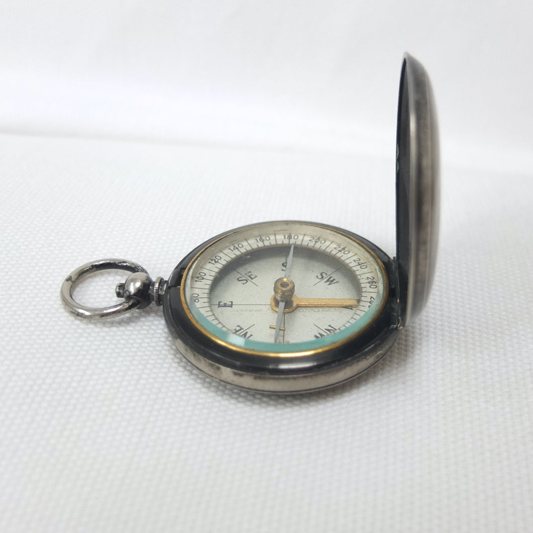 The compass is in very good condition, full working order, and finds North well. The case has a few marks, and most of the original 'Bronzed' finish has been polished or worn away, revealing the nickel plating underneath. The metal compass card, glass, and bar needle are all in very good condition. The transit lock is working well. The case opens and closes very well, opening with a push-button at the loop. ‘Made in England’ is engraved across the centre of the metal compass card.