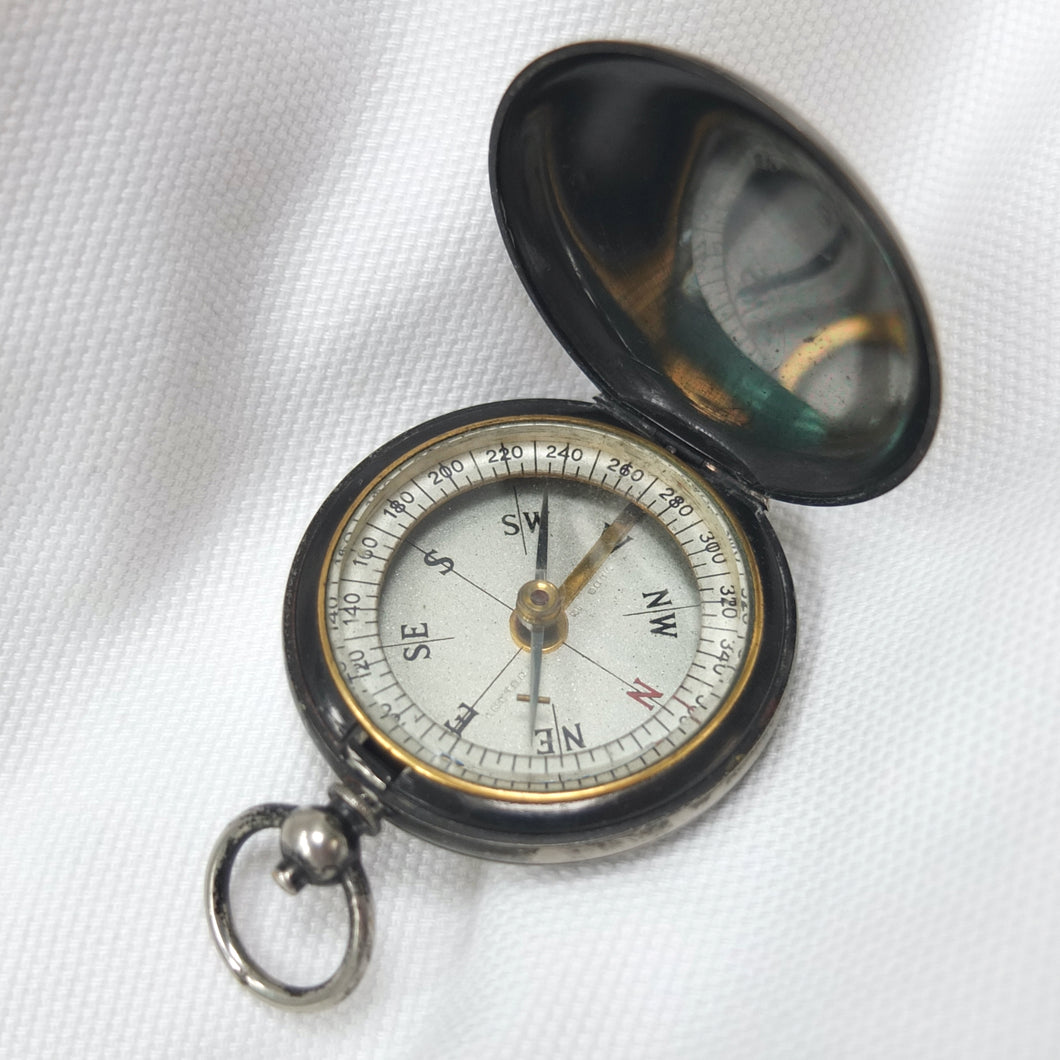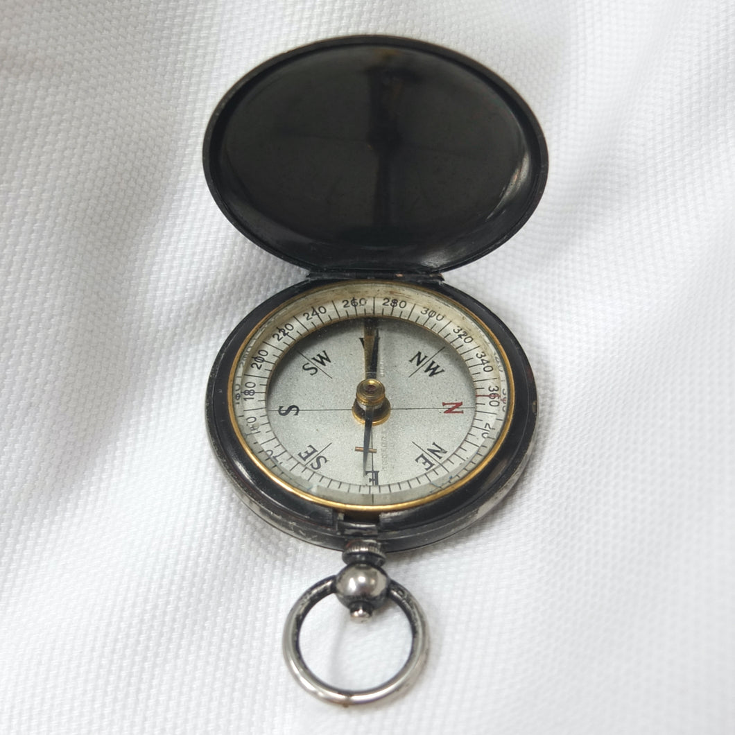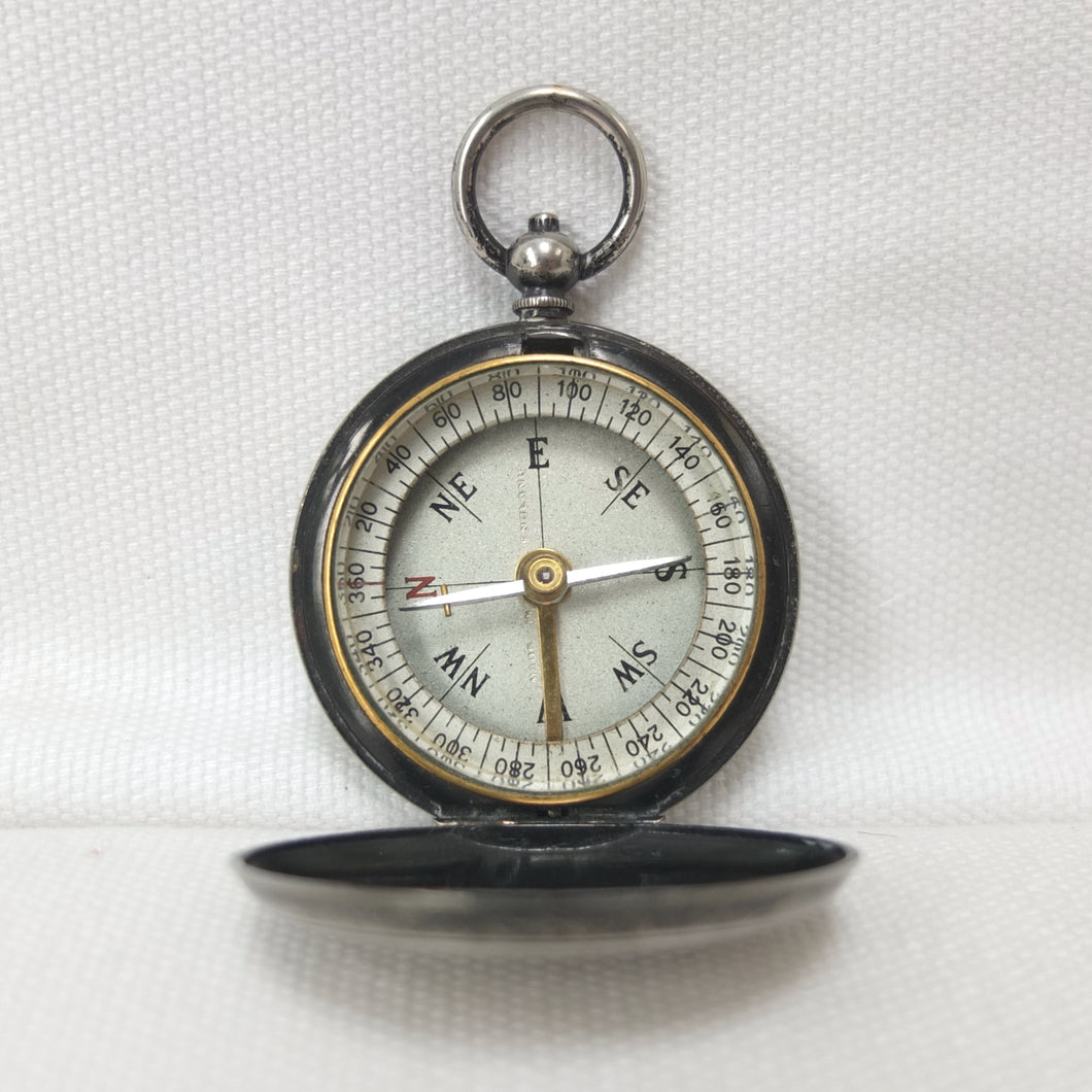 A Francis Barker & Son hunter cased, nickel-plated brass pocket compass, dating from c.1910-1926. Although there are no maker’s marks, this particular design was only made by Barker, and featured in their catalogues and brochures from the start of the 20th century as model No. 3002, 'The Explorer'. It was described as having a 'Bronzed spring hunter case, metal dial, raised graduated ring, bar needle, agate cap and stop'.