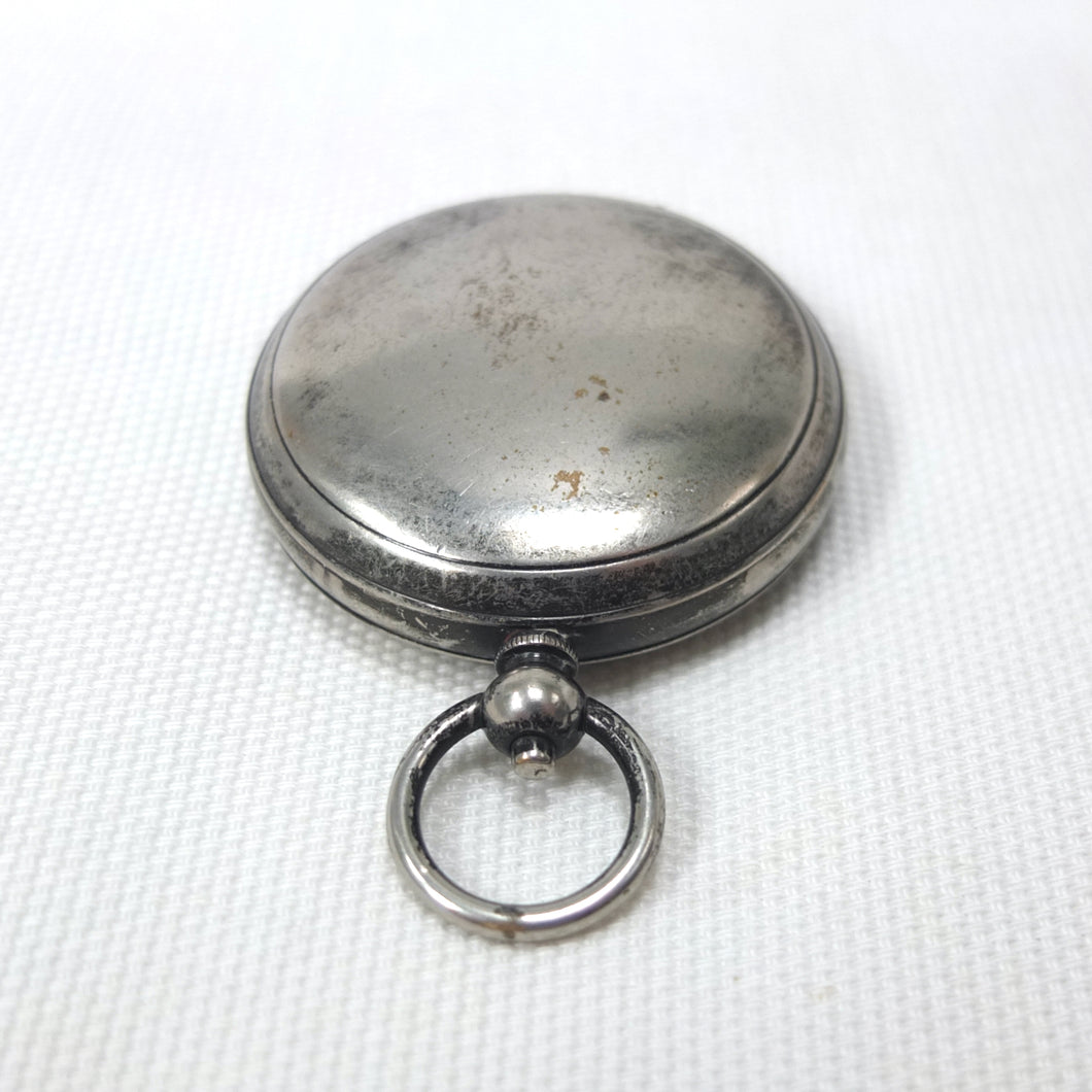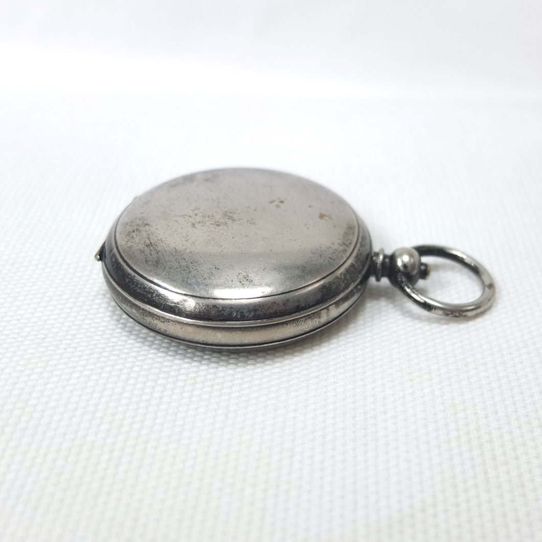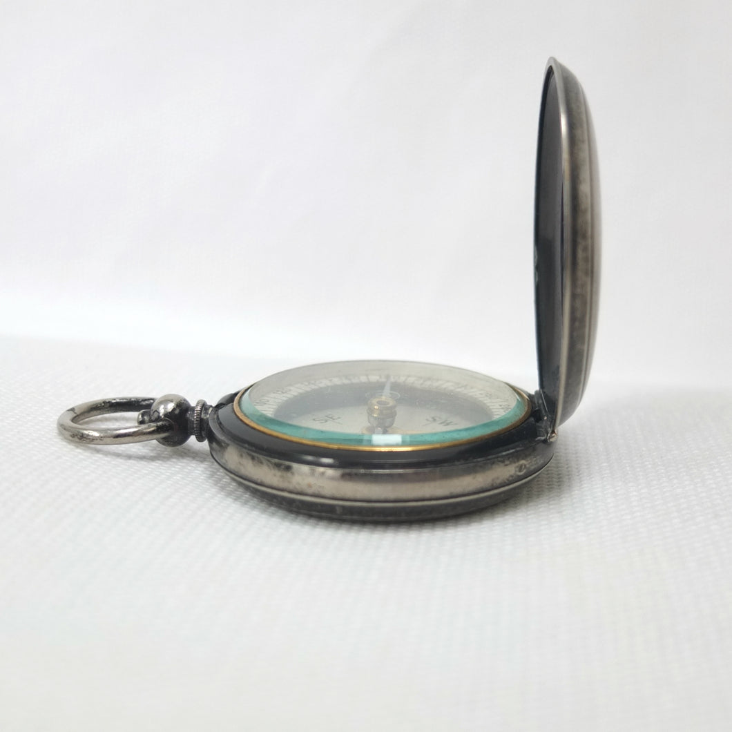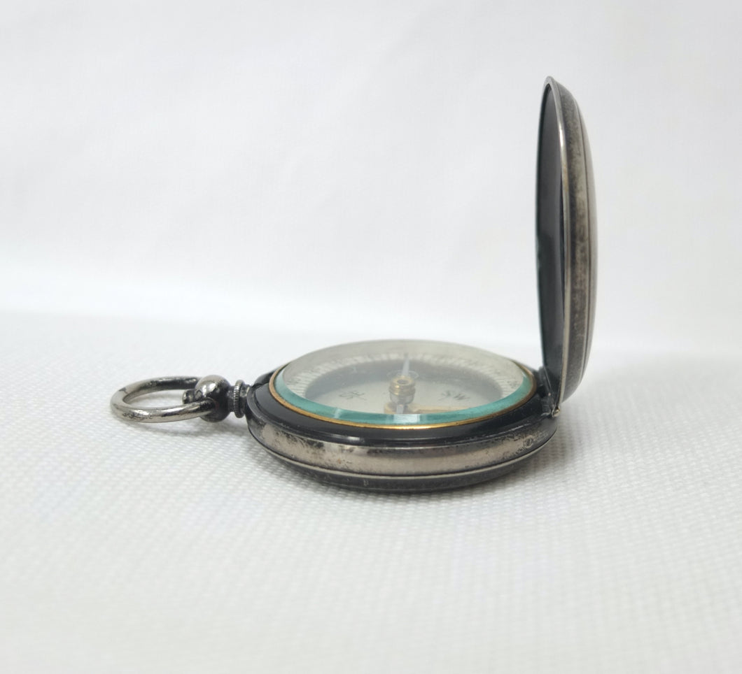 A Francis Barker & Son hunter cased, nickel-plated brass pocket compass, dating from c.1910-1926. Although there are no maker’s marks, this particular design was only made by Barker, and featured in their catalogues and brochures from the start of the 20th century as model No. 3002, 'The Explorer'. It was described as having a 'Bronzed spring hunter case, metal dial, raised graduated ring, bar needle, agate cap and stop'.
