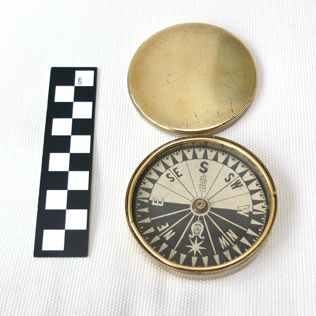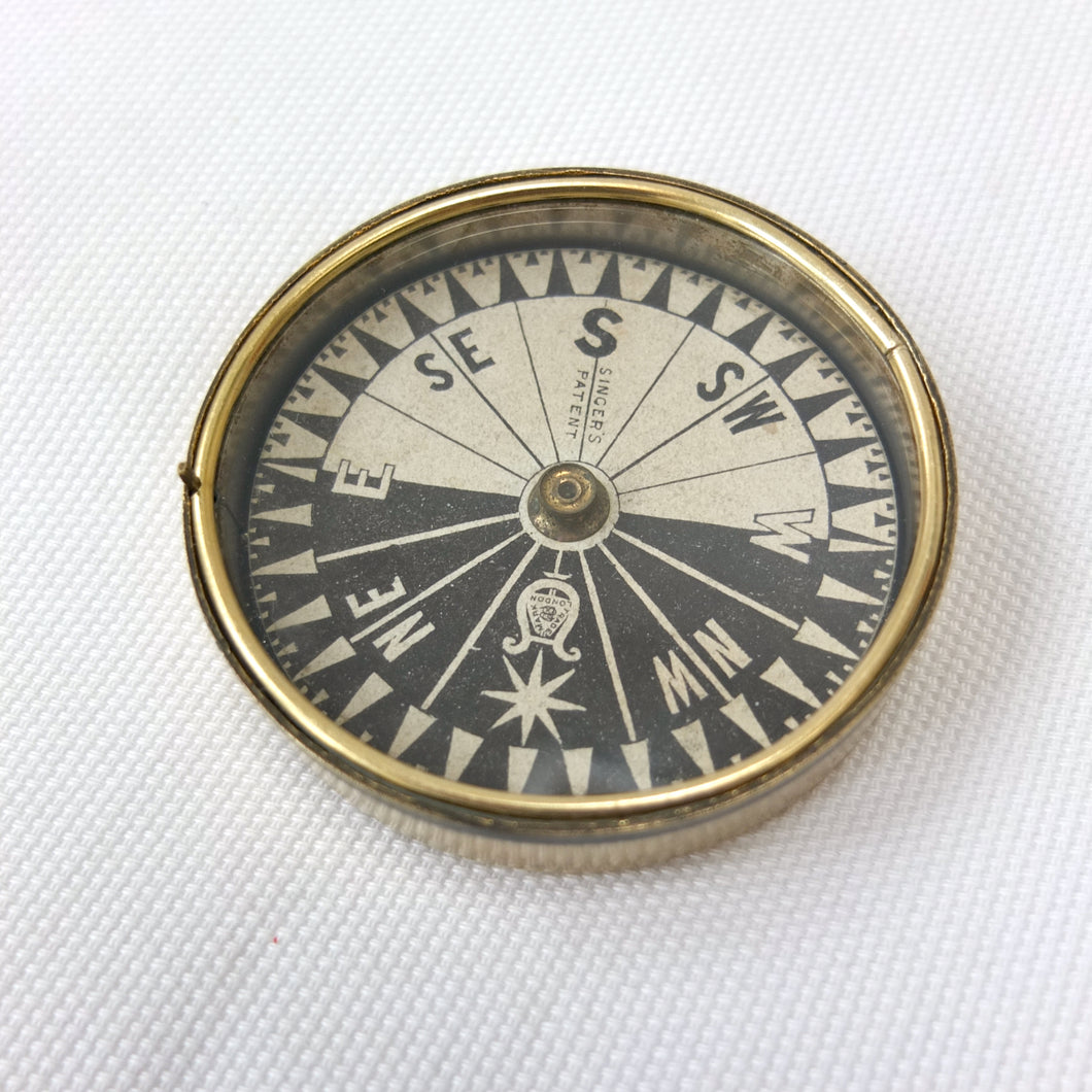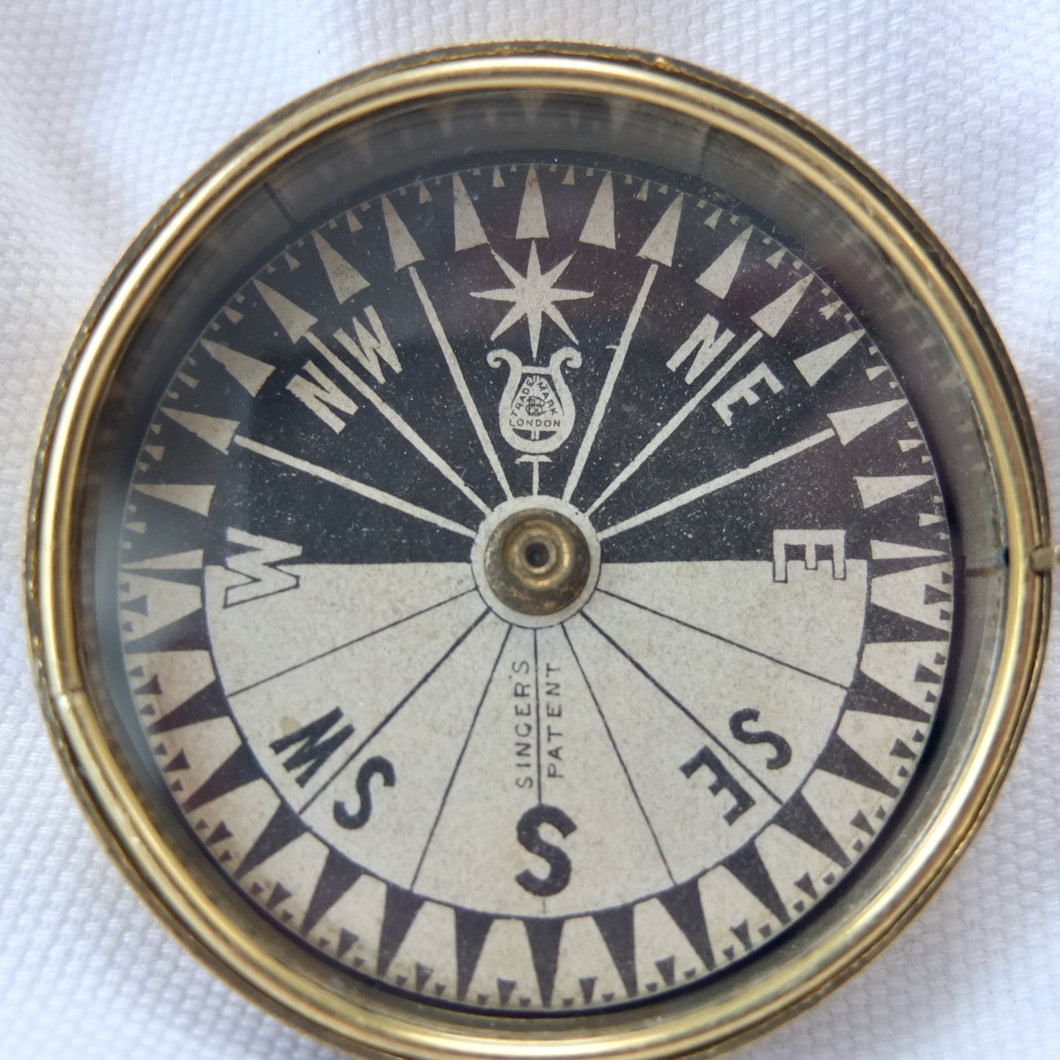 A Francis Barker & Son Singer's Patent pocket compass, dating from c.1875. The compass has a jewelled pivot, brass box case, transit lock, and a push-fit lid. The paper compass card is hand drawn in the classic Singer's design, and marked with Barker's post-1875 'Trade Mark London' logo (with the letter 'S' the wrong way round, denoting that it was made after Francis Barker's death in 1875). The use of the 'Singer's Patent' wording on the card suggests that it was made fairly soon after the patent expired in 1868. Hand drawn cards of this type were rarely made after about 1890, when they were replaced by printed versions.