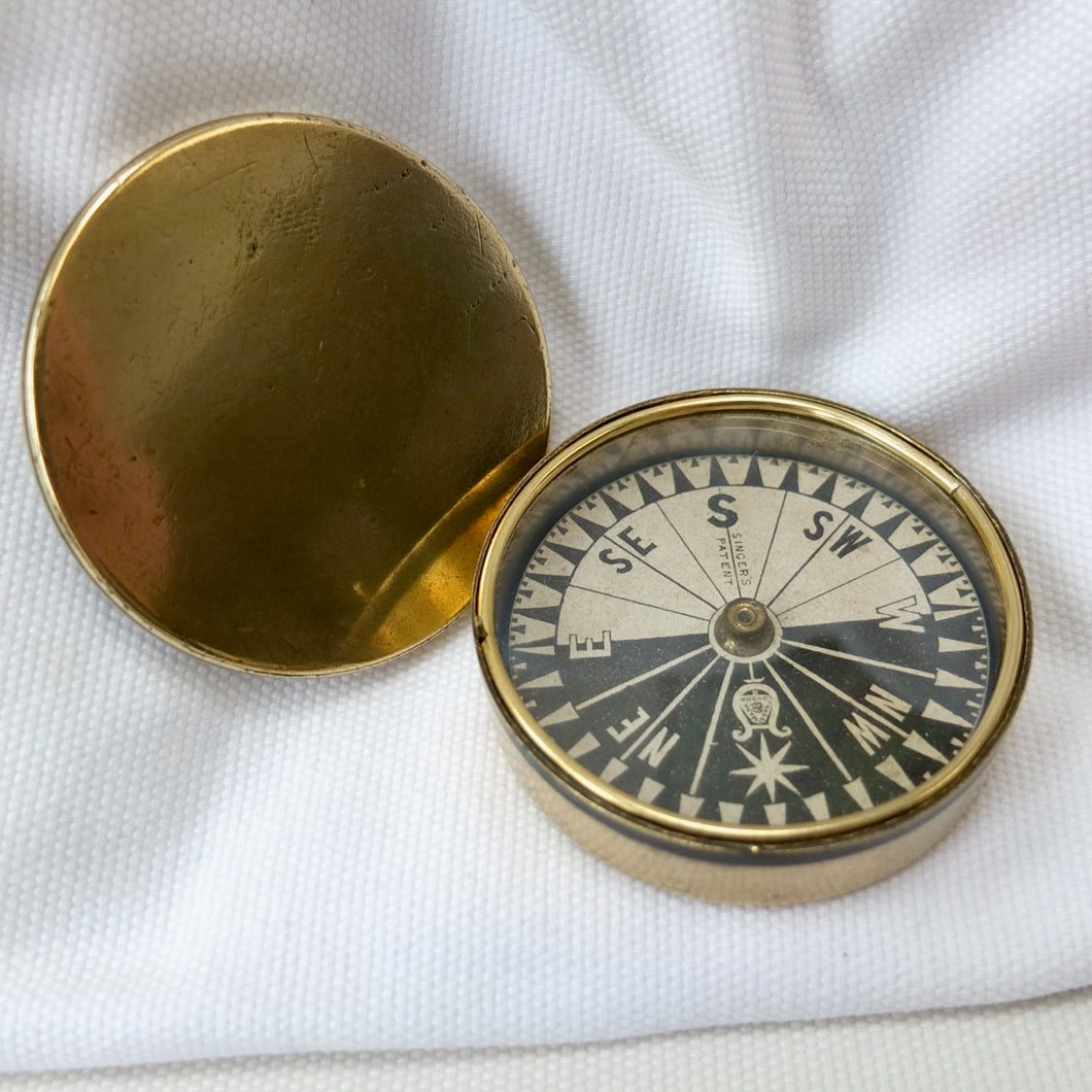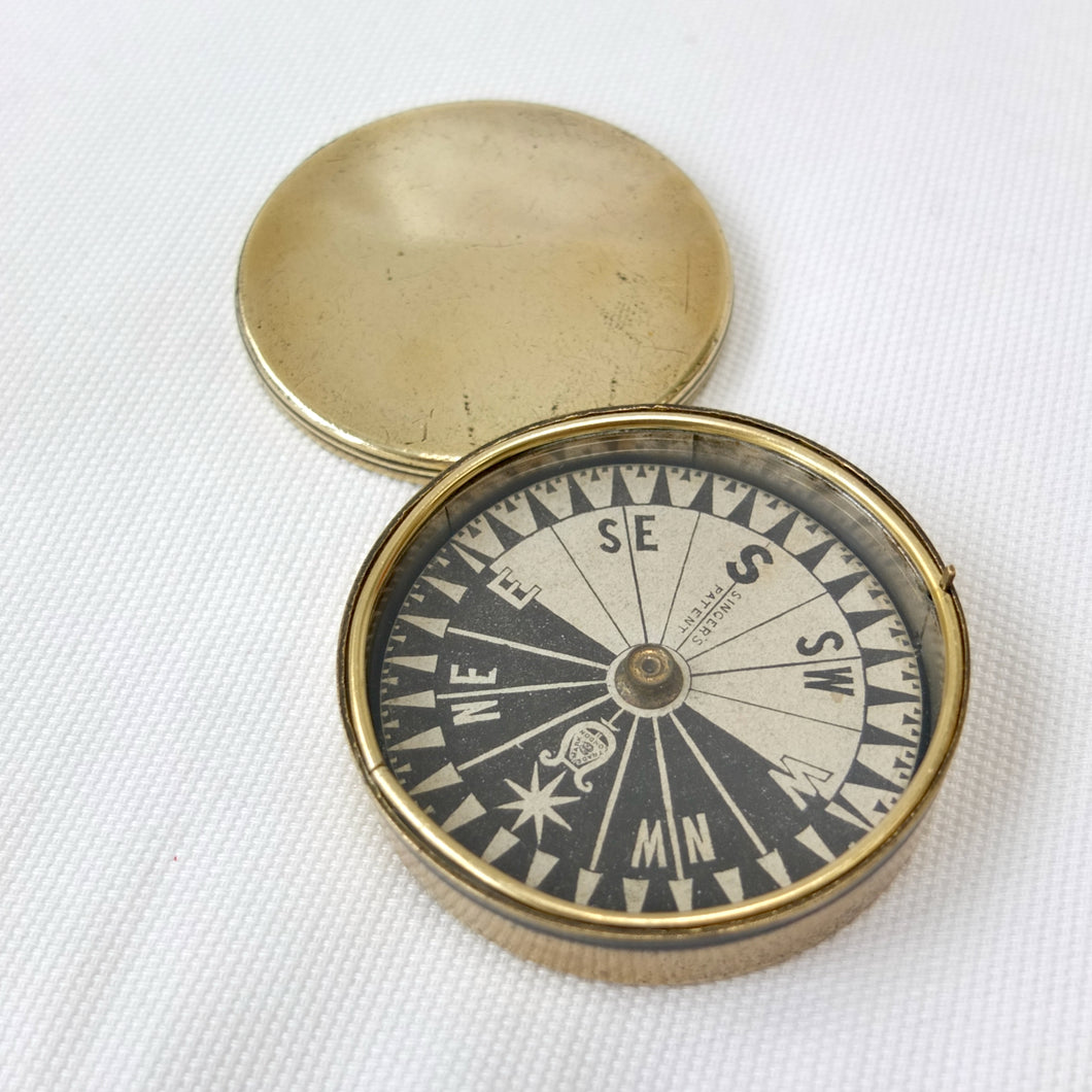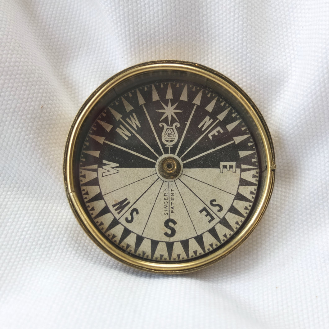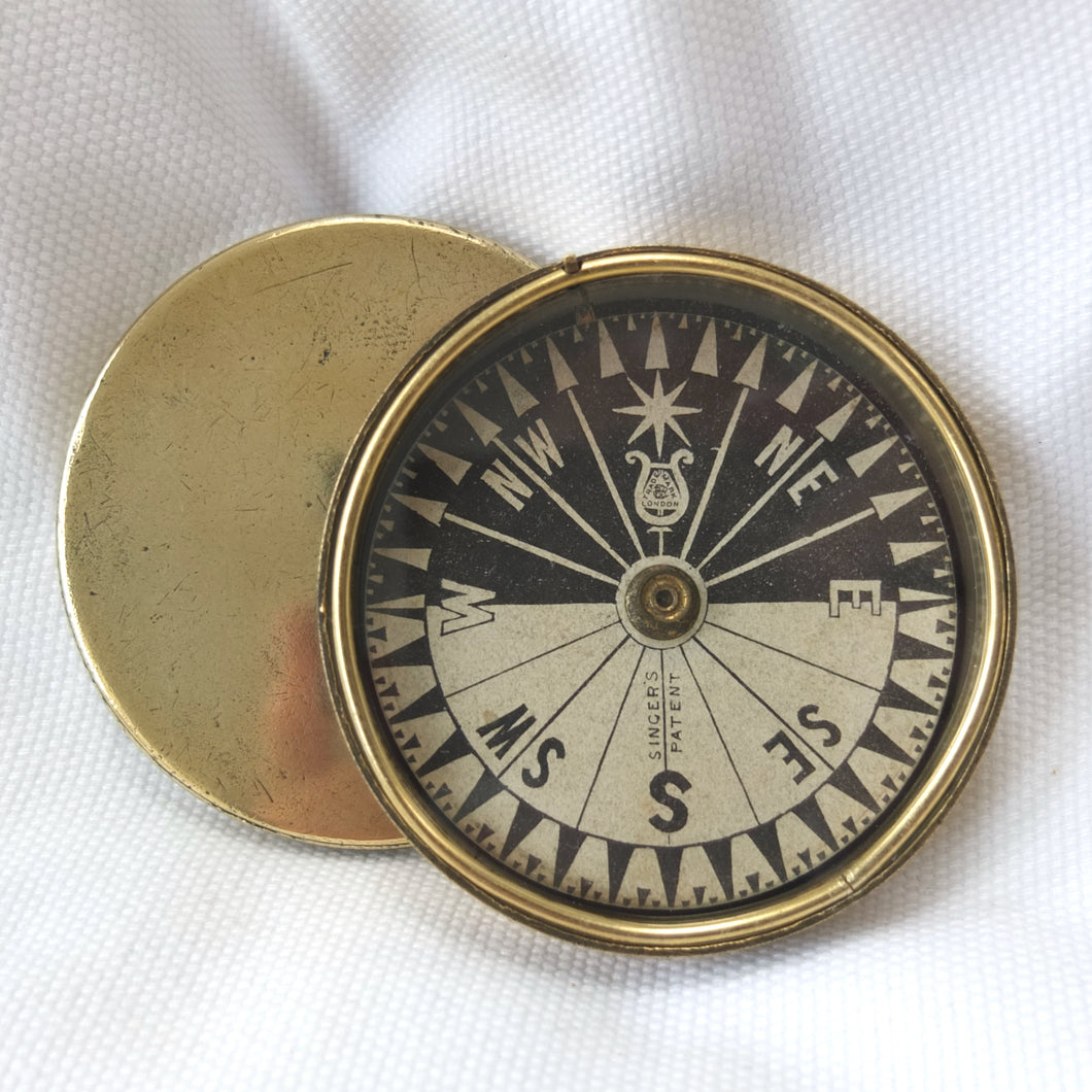 A Francis Barker & Son Singer's Patent pocket compass, dating from c.1875. The compass has a jewelled pivot, brass box case, transit lock, and a push-fit lid. The paper compass card is hand drawn in the classic Singer's design, and marked with Barker's post-1875 'Trade Mark London' logo (with the letter 'S' the wrong way round, denoting that it was made after Francis Barker's death in 1875). The use of the 'Singer's Patent' wording on the card suggests that it was made fairly soon after the patent expired in 1868. Hand drawn cards of this type were rarely made after about 1890, when they were replaced by printed versions.