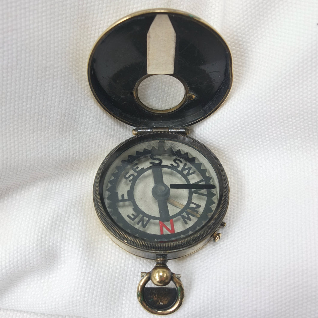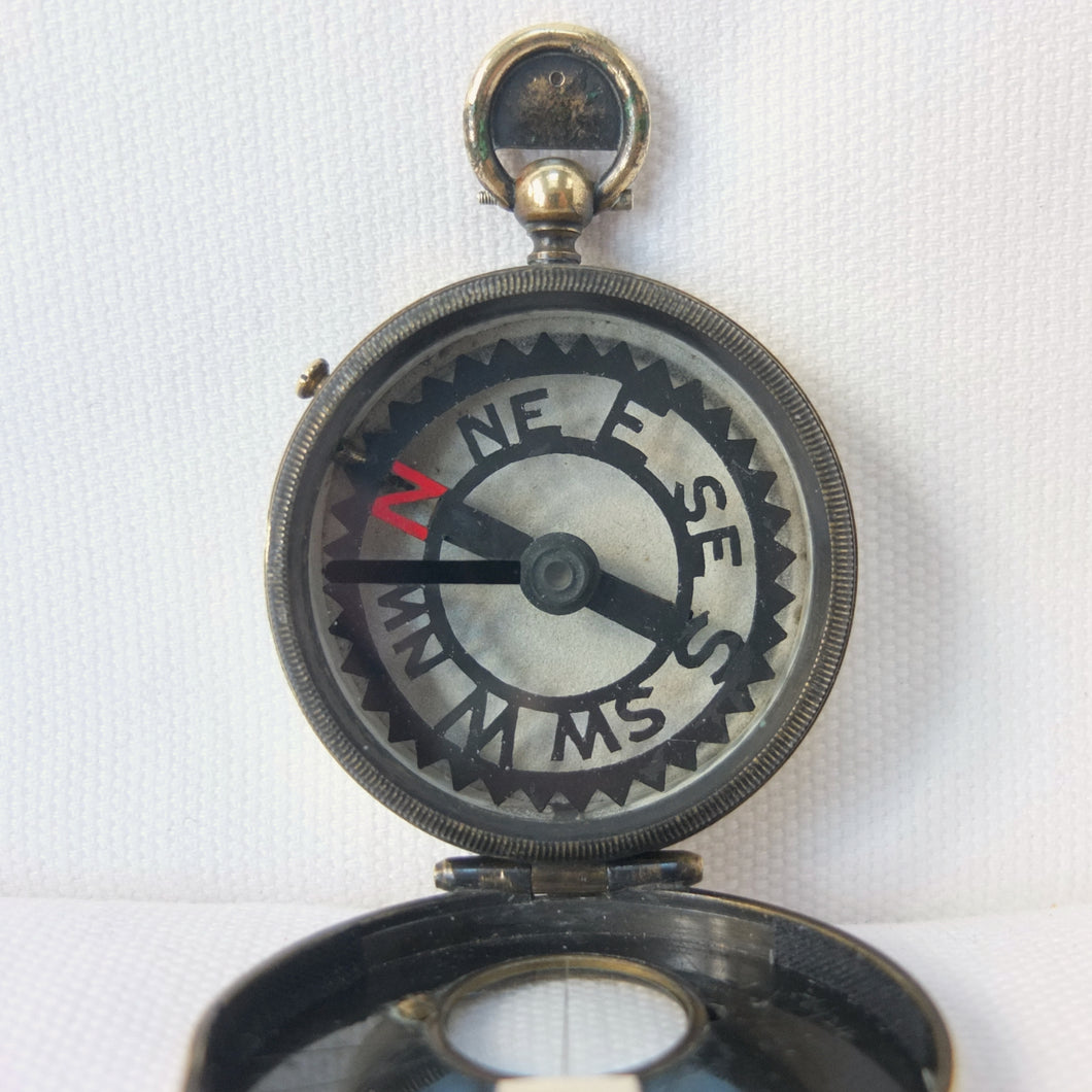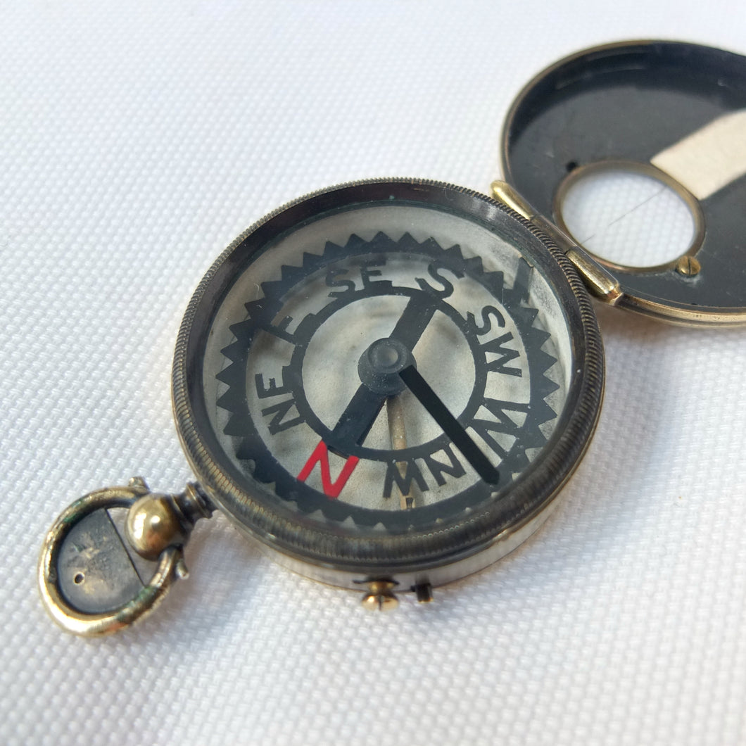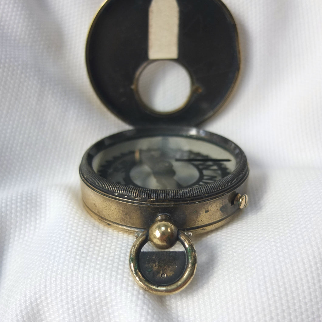 The compass has an aluminium Skeleton dial with a jewelled pivot, rotating bezel with bearing marker on the underside of the glass, and a brass hunter case with viewing window and sighting line in the lid. This sighting line was used in conjunction with the pinhole sight in the thumb ring. In later versions of the Skeleton, the pinhole sight was replaced with a notch on the outside of the ring, as the pinhole tab made the ring difficult to use. The compass has a transit lock operated by a sliding button on the side of the case, and a lever to lift and lock the compass card. The case would originally have had a bronzed finish, and this can still be seen on the interior of the lid.