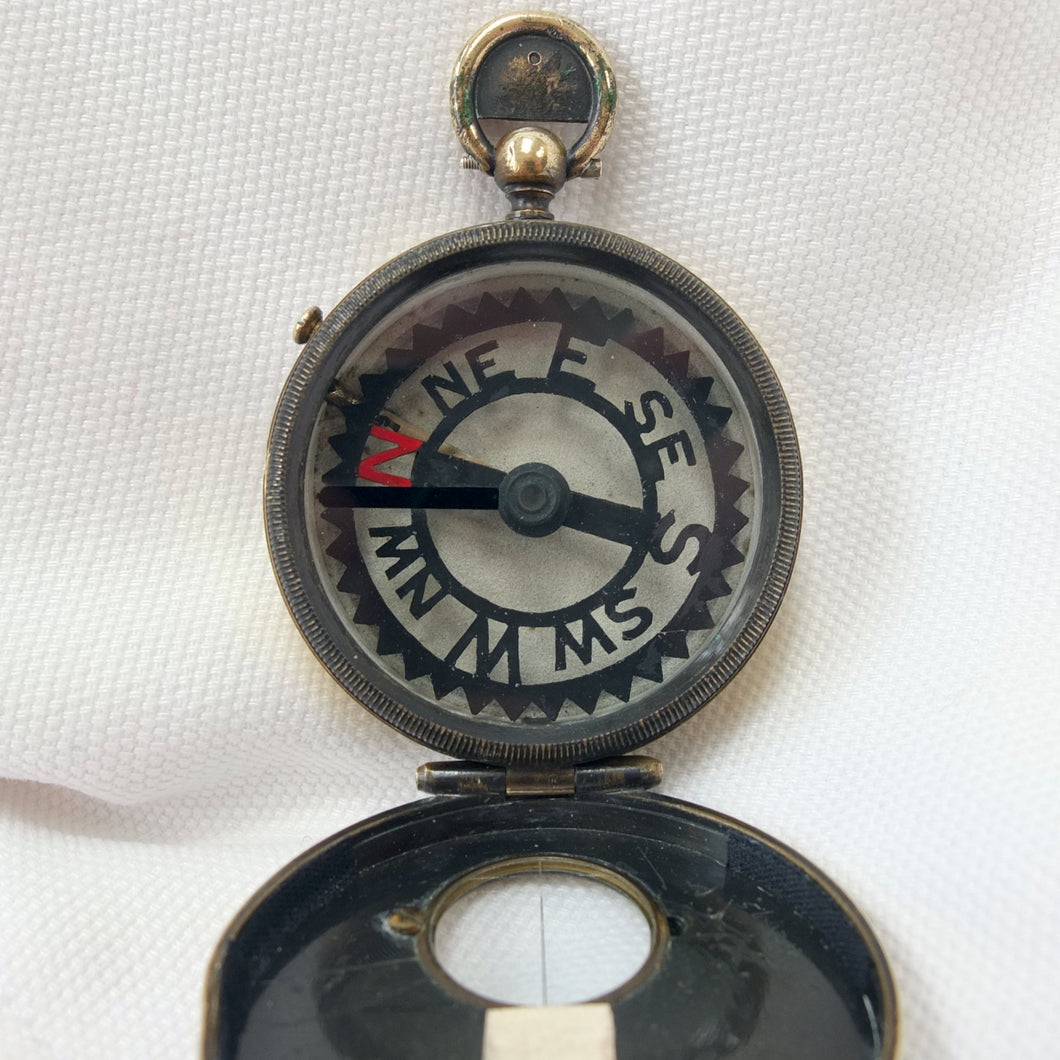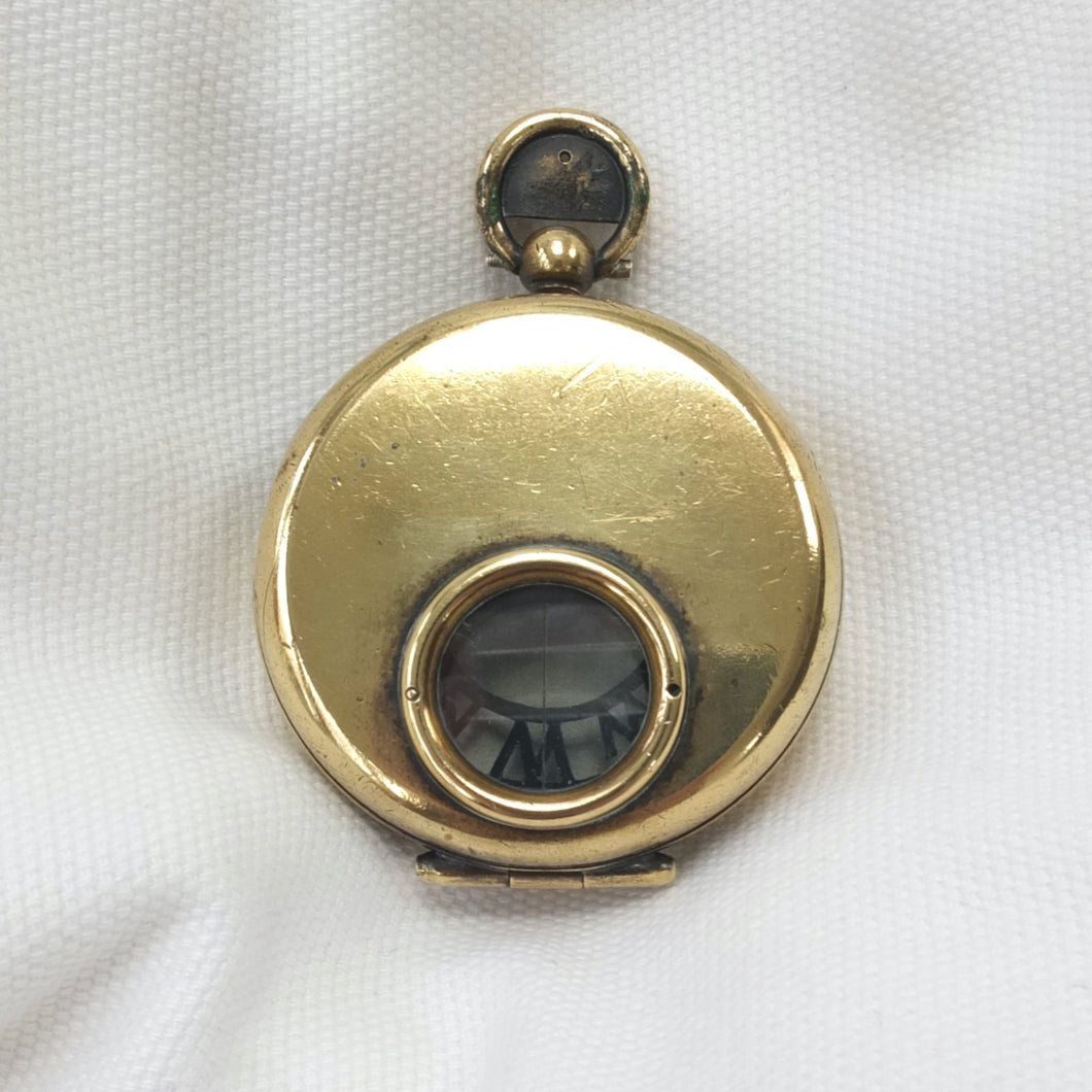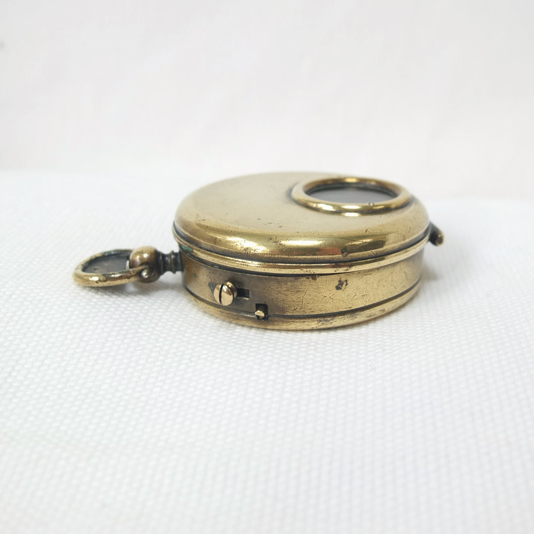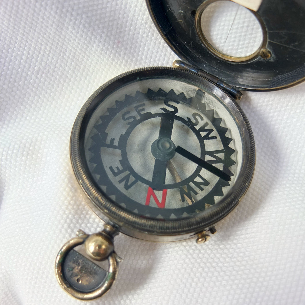 The compass has an aluminium Skeleton dial with a jewelled pivot, rotating bezel with bearing marker on the underside of the glass, and a brass hunter case with viewing window and sighting line in the lid. This sighting line was used in conjunction with the pinhole sight in the thumb ring. In later versions of the Skeleton, the pinhole sight was replaced with a notch on the outside of the ring, as the pinhole tab made the ring difficult to use. The compass has a transit lock operated by a sliding button on the side of the case, and a lever to lift and lock the compass card. The case would originally have had a bronzed finish, and this can still be seen on the interior of the lid.