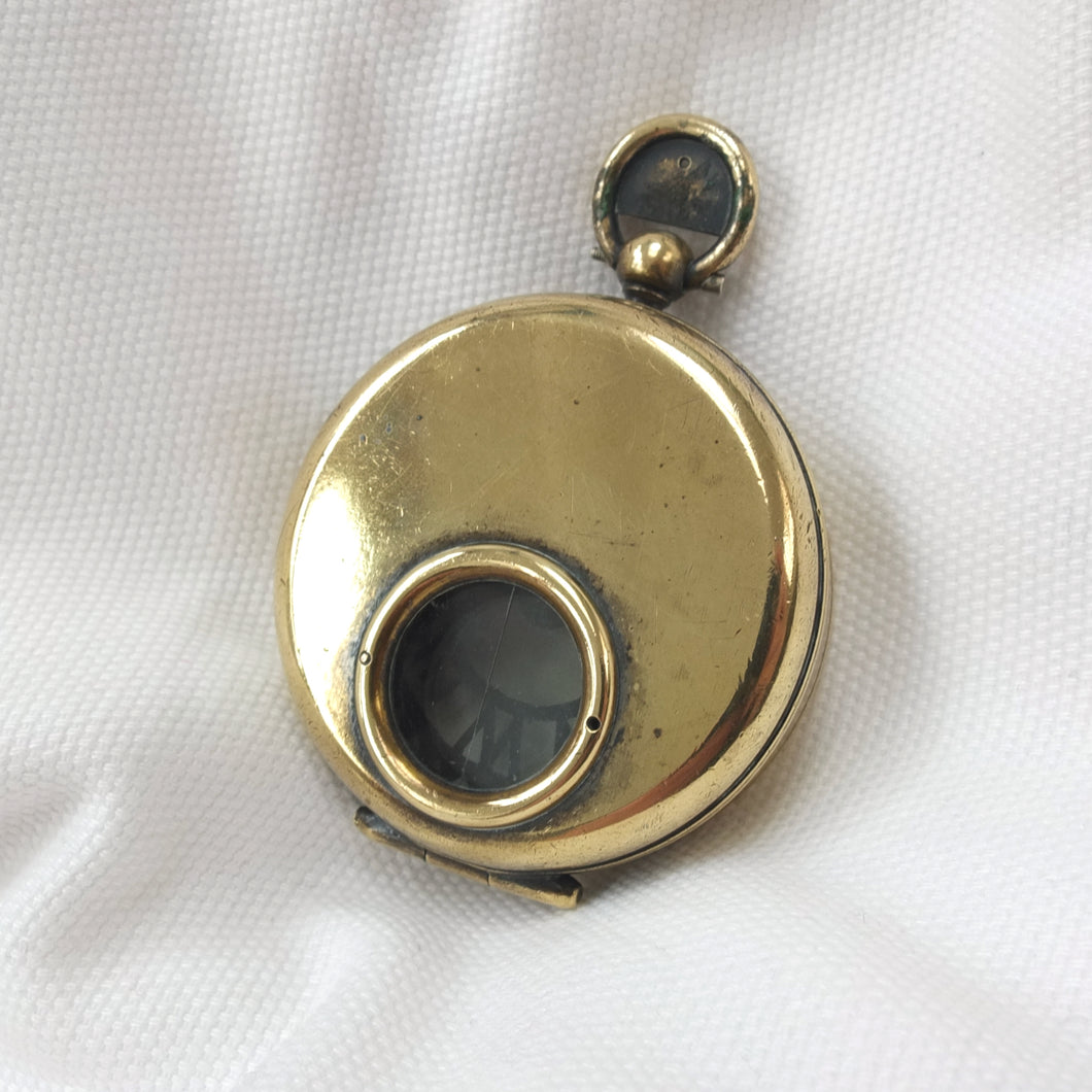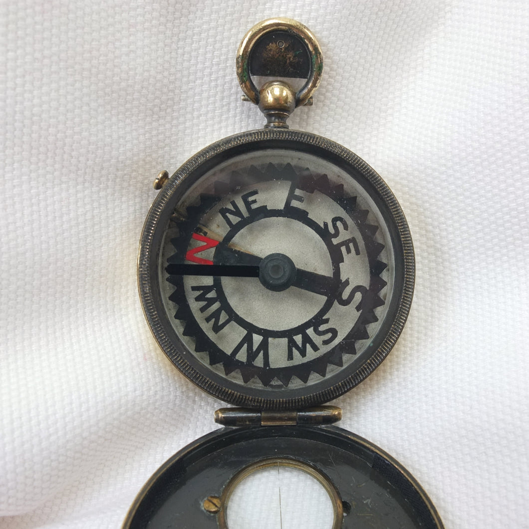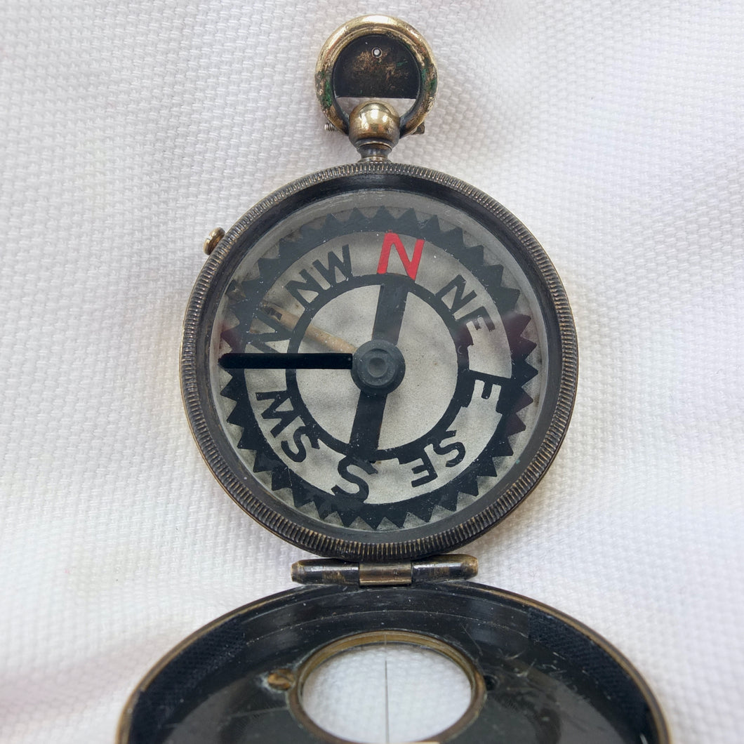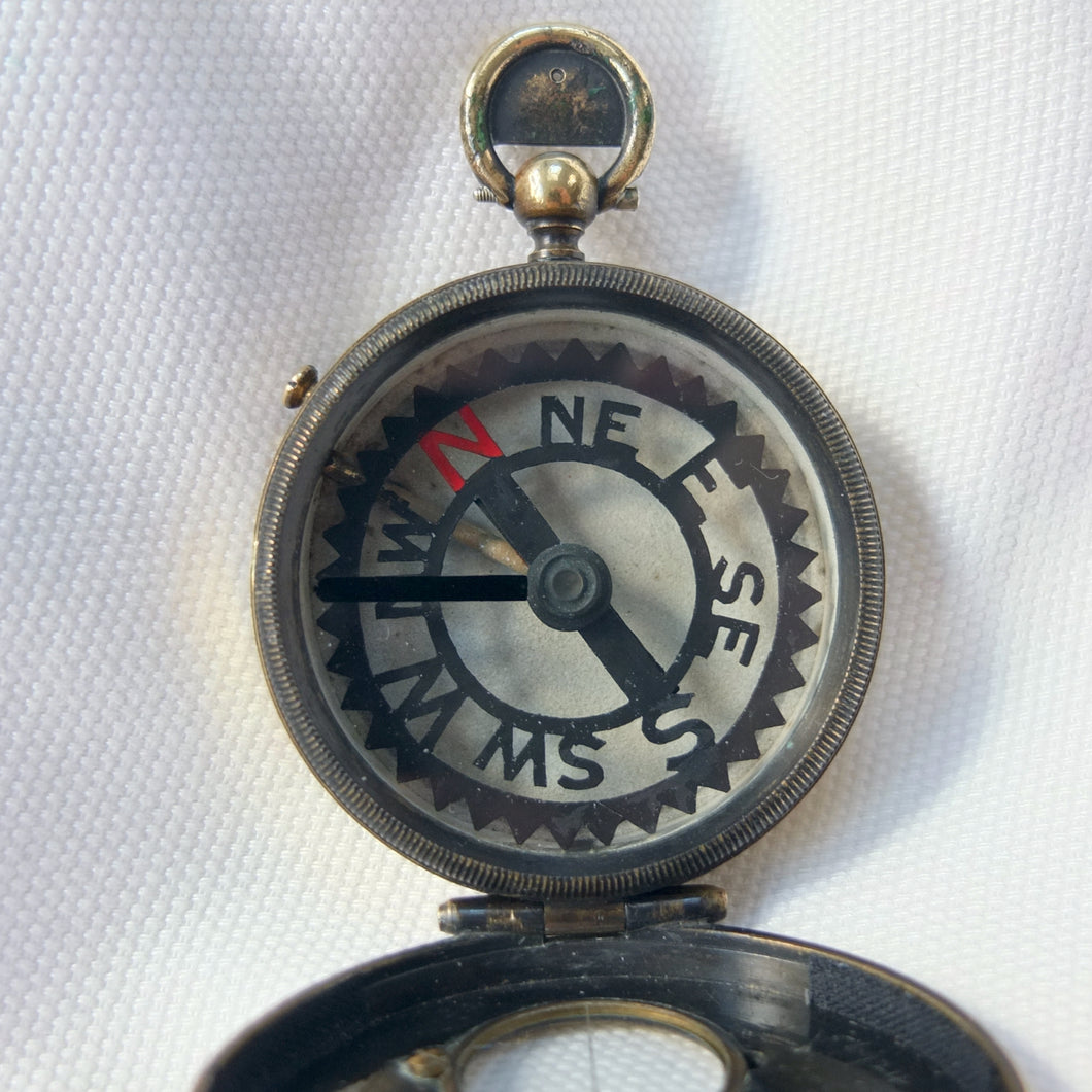 The compass has an aluminium Skeleton dial with a jewelled pivot, rotating bezel with bearing marker on the underside of the glass, and a brass hunter case with viewing window and sighting line in the lid. This sighting line was used in conjunction with the pinhole sight in the thumb ring. In later versions of the Skeleton, the pinhole sight was replaced with a notch on the outside of the ring, as the pinhole tab made the ring difficult to use. The compass has a transit lock operated by a sliding button on the side of the case, and a lever to lift and lock the compass card. The case would originally have had a bronzed finish, and this can still be seen on the interior of the lid.