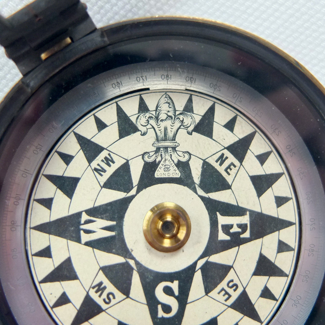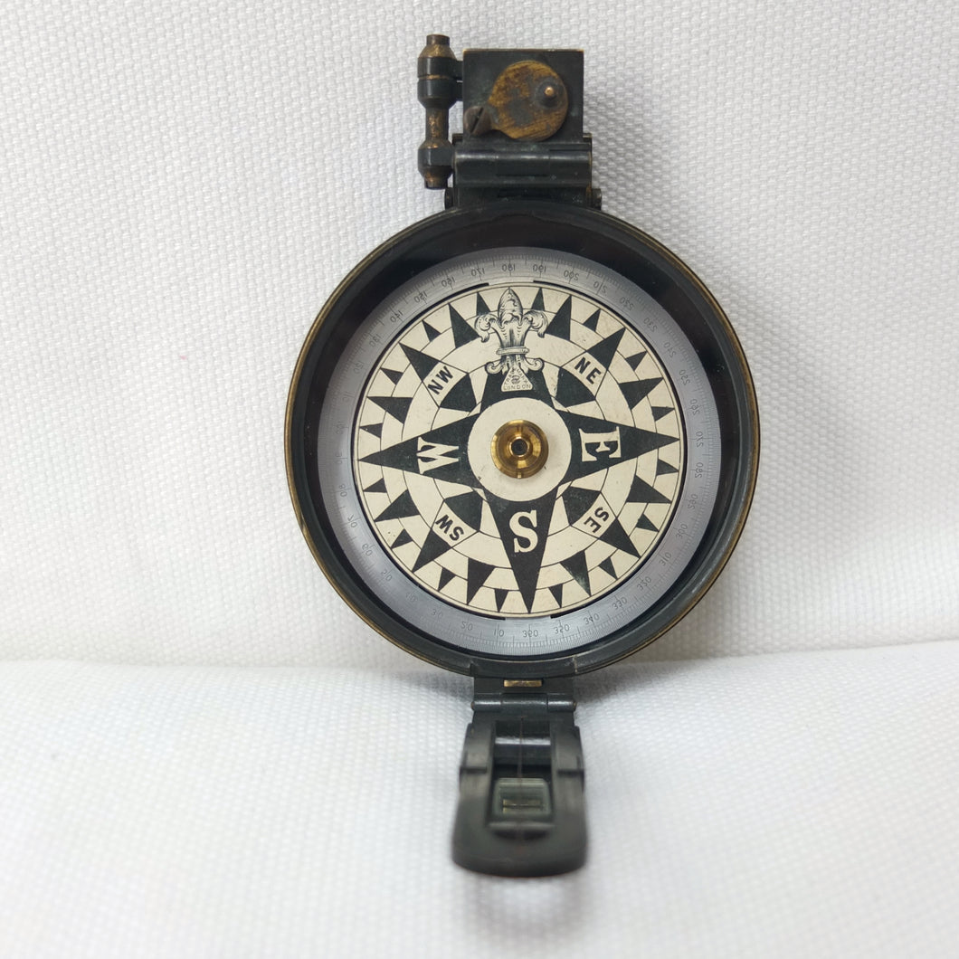 A rare version of the Francis Barker Artillery or Surveyors Prismatic Compass, dating from c.1875. The compass is signed on the card below the fleur de Lys at the North point with the distinctive 'Trade Mark London' Barker logo. The reversed letter 'S' that forms part of the logo dates the compass to sometime after 1875, as this style of logo was adopted after Francis Barker's death in 1875. The dial features a very unusual combination of the standard aluminium ring and the classic Barker maritime type paper card design.