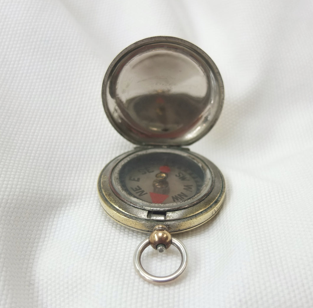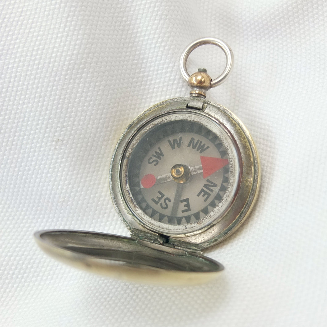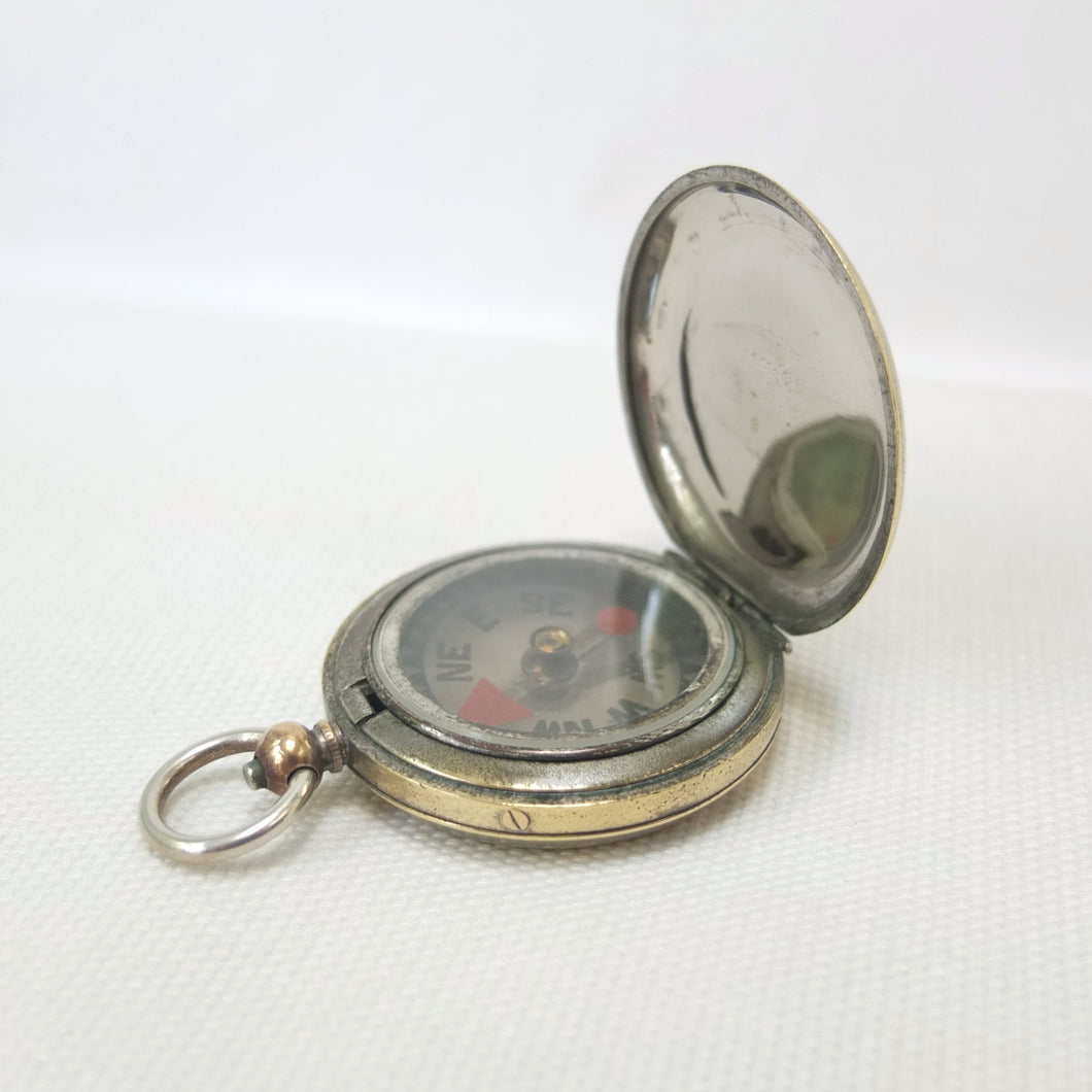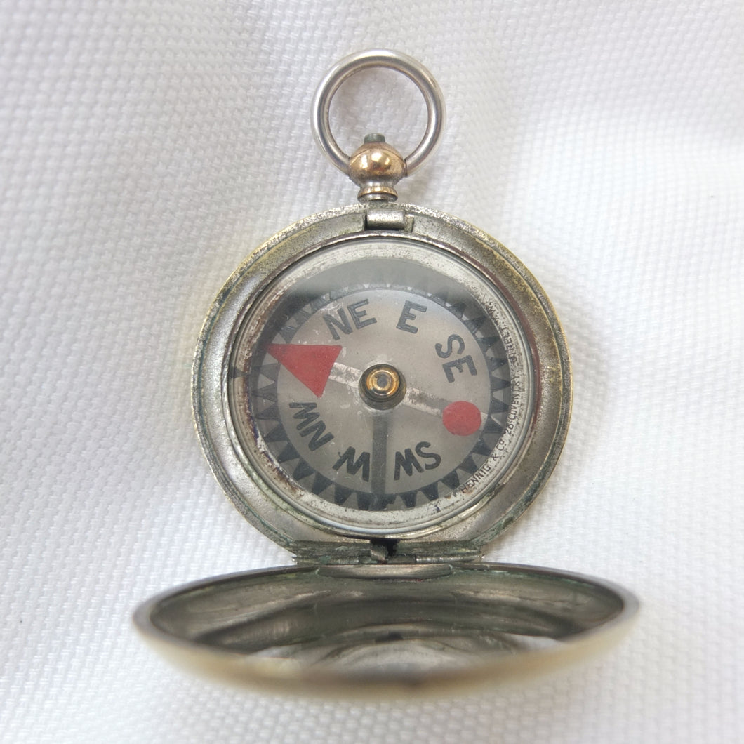 A rare hunter cased, nickel-plated brass, F. Barker & Son pocket compass, dating from c.1890-1905. Although there is no maker’s mark, this particular design was only ever made by Barker, and first appeared around 1865. It features a nickel-plated brass hunter case, and a very unusual transparent mica compass card - known as the Barker ‘Mica Dial'. The mica is totally transparent and very thin, with a hand-painted compass rose, red triangular North marker and circular red South marker. The compass is signed by the retailer, Hennig & Co, 26 Coventry Street, London, in very small type around the edge of the compass insert. Barker often made compasses that were supplied unsigned to the retail trade, with the retailer adding their own details. Hennig & Co. who traded in London between c.1890 and 1905 were not scientific instrument makers - in trade directories of the time they were listed as cutlers, razor makers and ice skate makers. Francis Barker & Son are known to have supplied almost indentical compasses to another London cutler and ice axe maker - Hill & Son, 4 Haymarket - at around the same time.