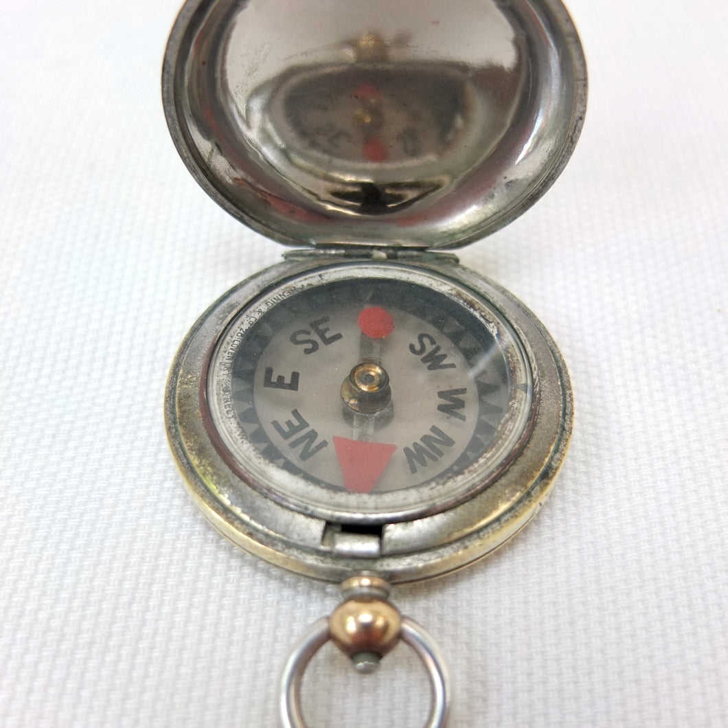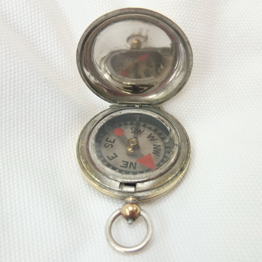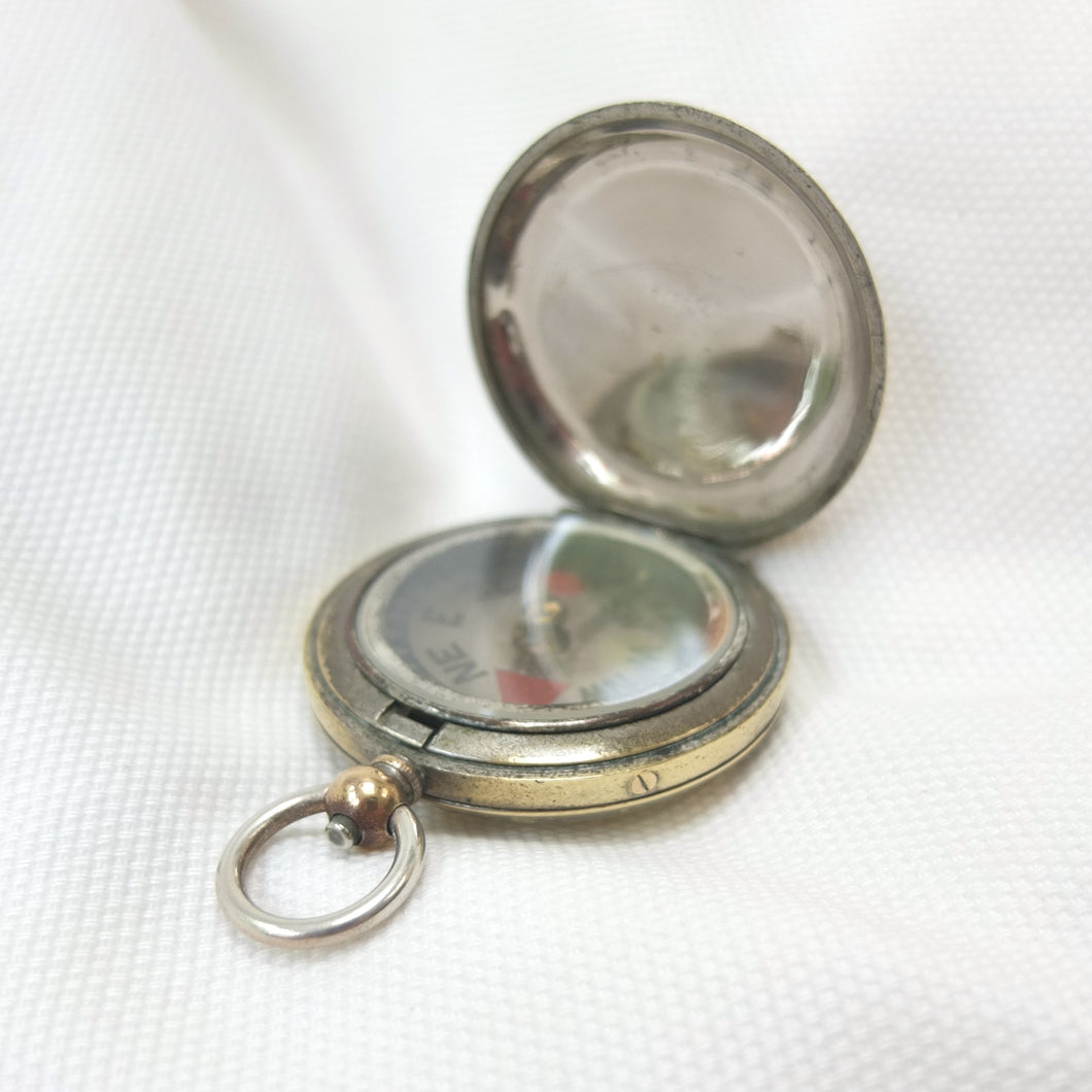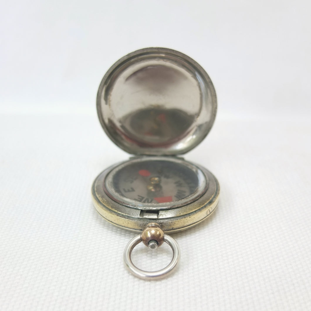 A rare hunter cased, nickel-plated brass, F. Barker & Son pocket compass, dating from c.1890-1905. Although there is no maker’s mark, this particular design was only ever made by Barker, and first appeared around 1865. It features a nickel-plated brass hunter case, and a very unusual transparent mica compass card - known as the Barker ‘Mica Dial'. The mica is totally transparent and very thin, with a hand-painted compass rose, red triangular North marker and circular red South marker. The compass is signed by the retailer, Hennig & Co, 26 Coventry Street, London, in very small type around the edge of the compass insert. Barker often made compasses that were supplied unsigned to the retail trade, with the retailer adding their own details. Hennig & Co. who traded in London between c.1890 and 1905 were not scientific instrument makers - in trade directories of the time they were listed as cutlers, razor makers and ice skate makers. Francis Barker & Son are known to have supplied almost indentical compasses to another London cutler and ice axe maker - Hill & Son, 4 Haymarket - at around the same time.