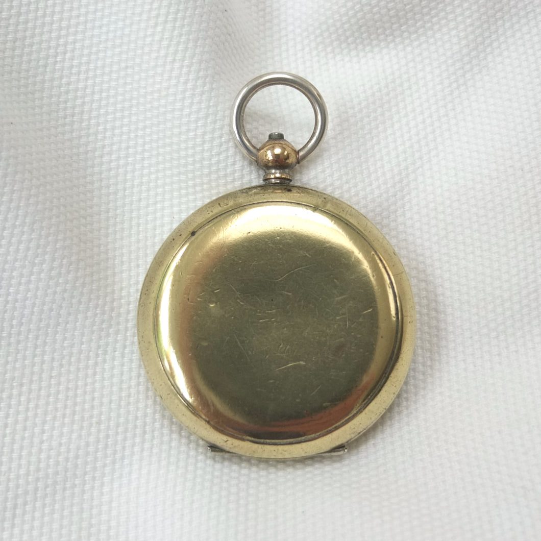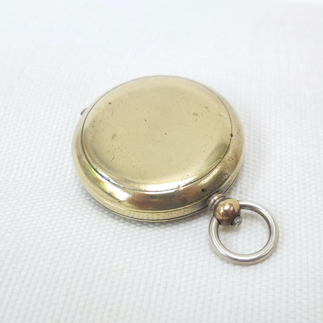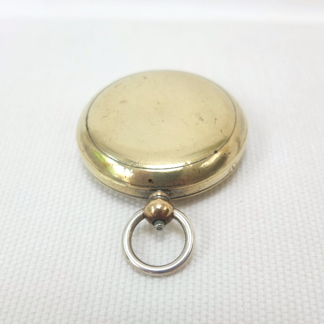 The compass is in good condition, full working order, and finds North well. The brass case has a few minor marks, and much of the original nickel plated finish has been polished or worn away, revealing the brass underneath. The mica compass card is in very good condition and the transit lock is working well. The case opens and closes well, with a push-button at the loop. The compass is signed ‘Hennig & Co., 26 Coventry Street’ in very small type around the edge of the compass insert.