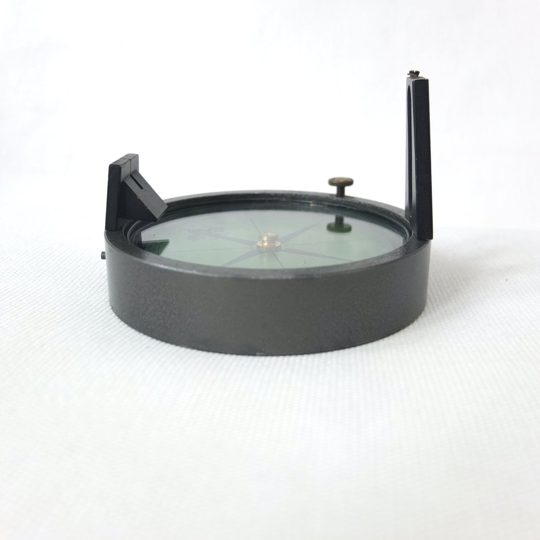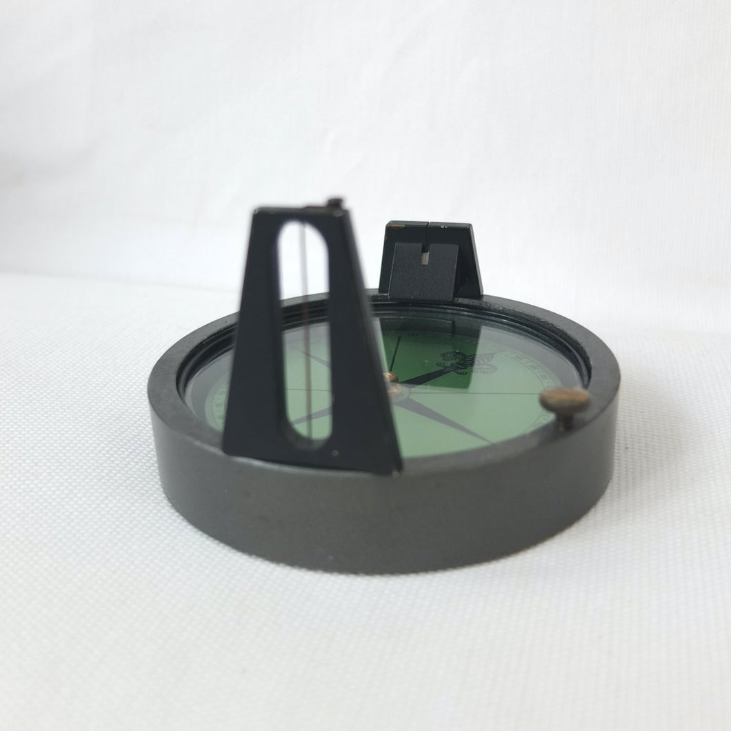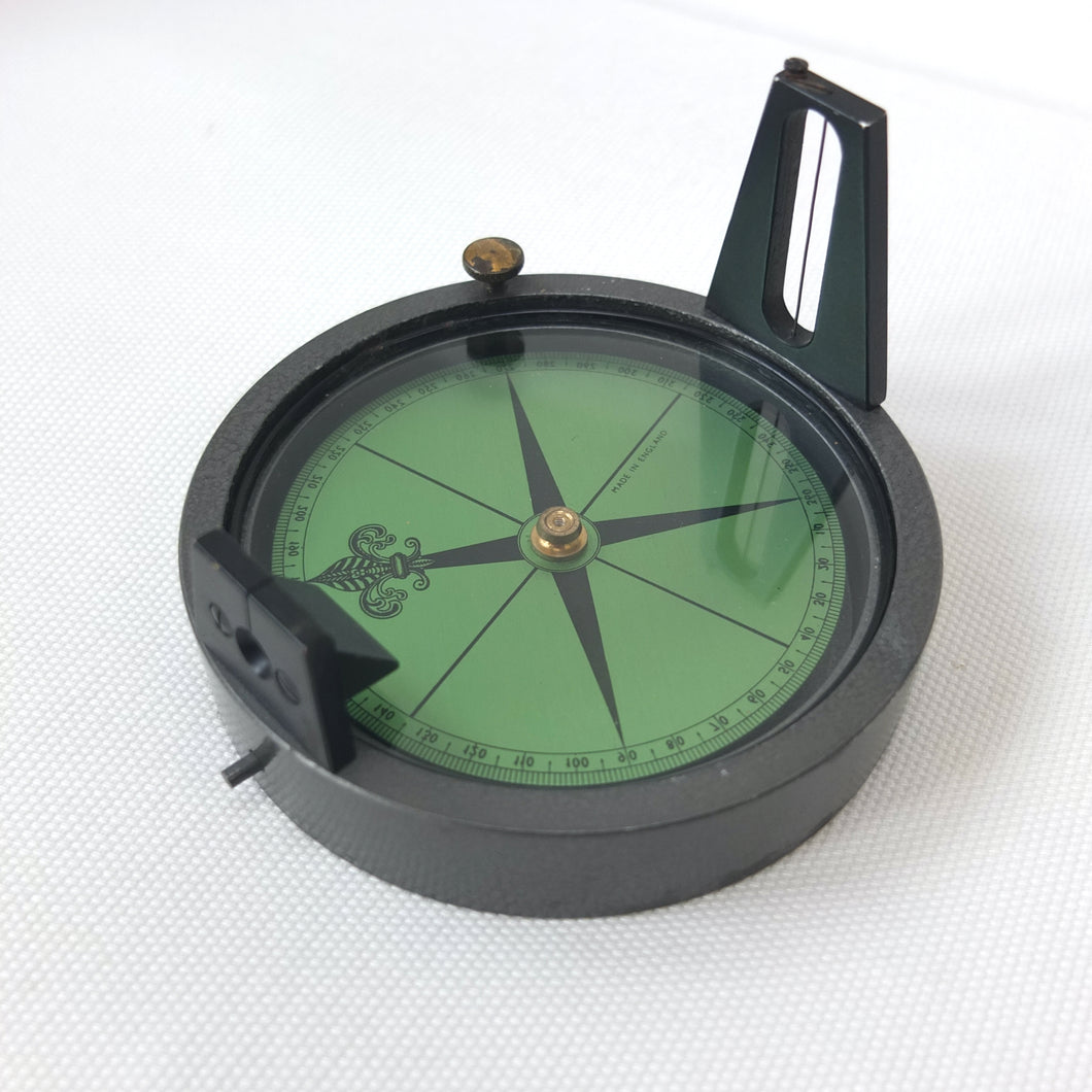 A Francis Barker prismatic compass, dating from c.1980. This compass was listed as product No. 1404 in the 1982 edition of the Francis Barker catalogue. It was described as having an 'enamel finish aluminium alloy case, with adjustable prism for focusing'. The compass has a jewelled pivot, screw-down transit lock, manual brake, height adjustable prism and sight, aluminium case, and aluminium compass card. This type of compass was first produced by Barker in the late 19th century. Although there are no maker's marks, this compass is similar to the early Barker versions, with the major differences being that the 19th century ones had a paper compass card rather than the aluminium card found in this model, and a wooden case. Details of Francis Barker compasses can be found in Paul Crespel's excellent book Trade mark London, available as a PDF at trademarklondon.com.