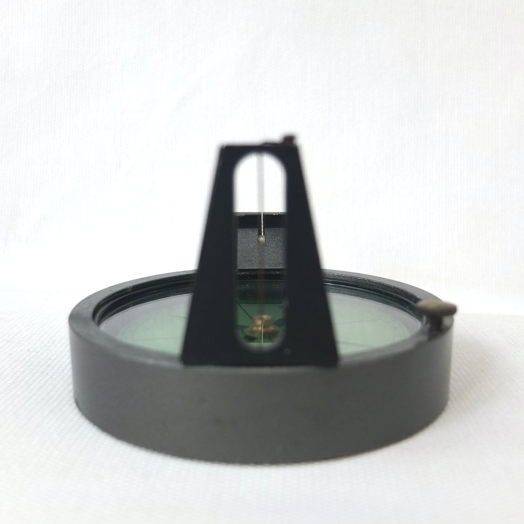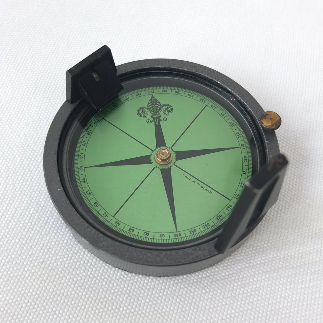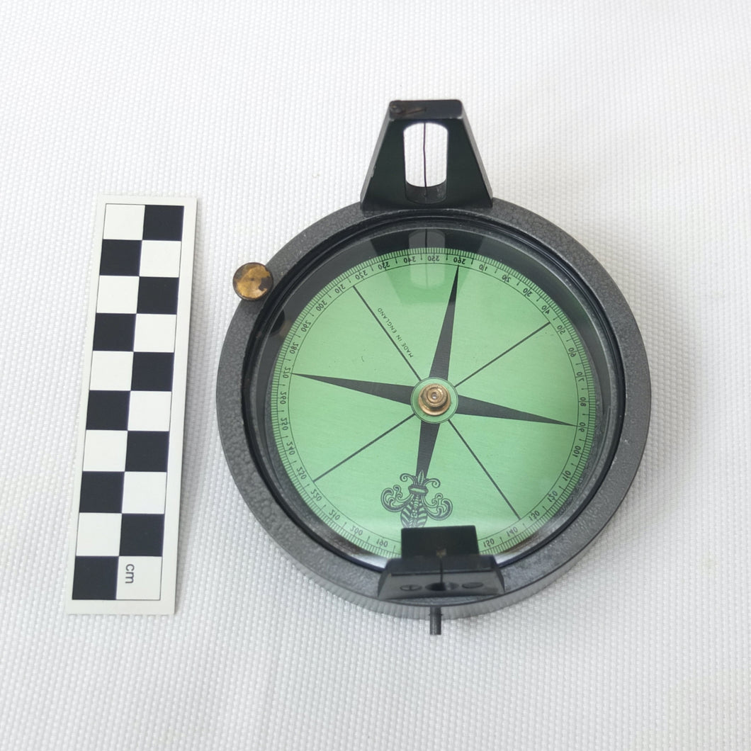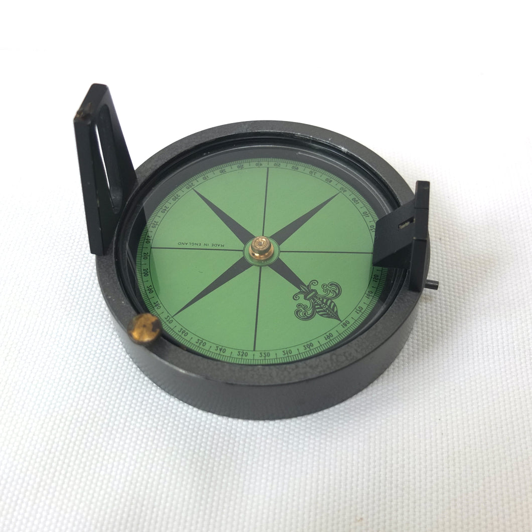 A Francis Barker prismatic compass, dating from c.1980. This compass was listed as product No. 1404 in the 1982 edition of the Francis Barker catalogue. It was described as having an 'enamel finish aluminium alloy case, with adjustable prism for focusing'. The compass has a jewelled pivot, screw-down transit lock, manual brake, height adjustable prism and sight, aluminium case, and aluminium compass card. This type of compass was first produced by Barker in the late 19th century. Although there are no maker's marks, this compass is similar to the early Barker versions, with the major differences being that the 19th century ones had a paper compass card rather than the aluminium card found in this model, and a wooden case. Details of Francis Barker compasses can be found in Paul Crespel's excellent book Trade mark London, available as a PDF at trademarklondon.com.