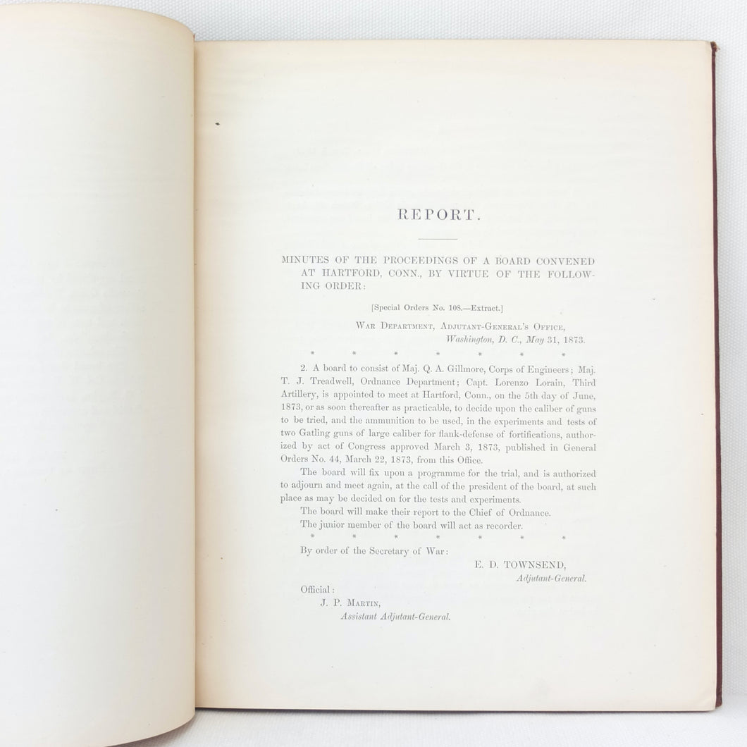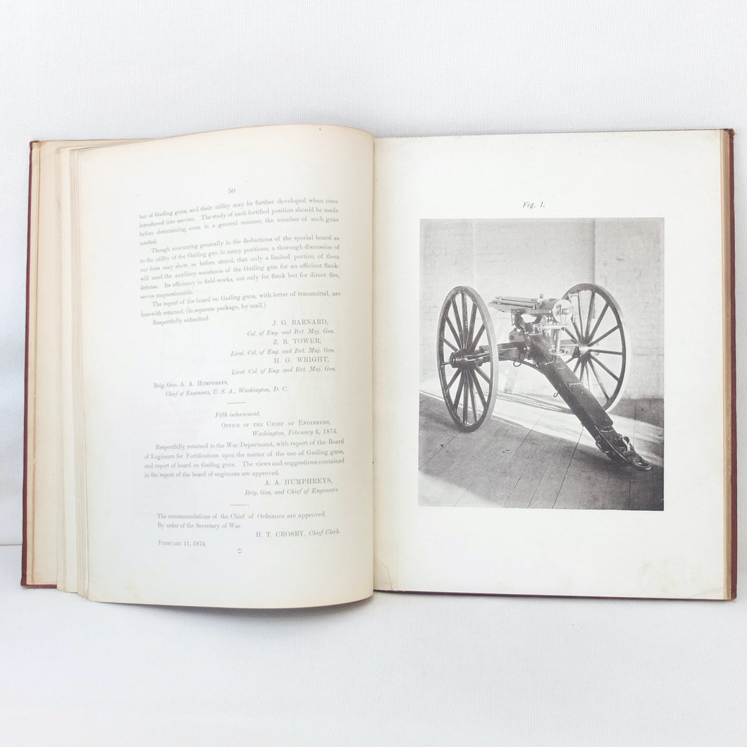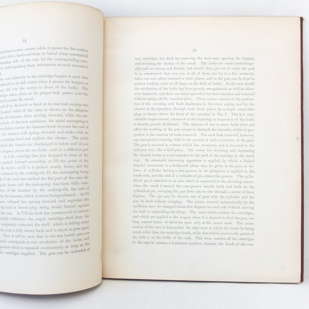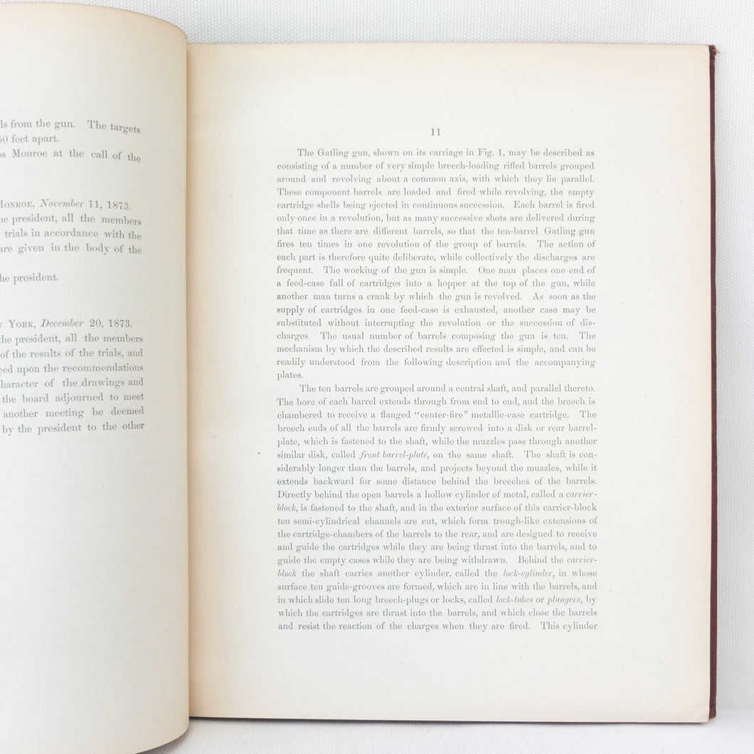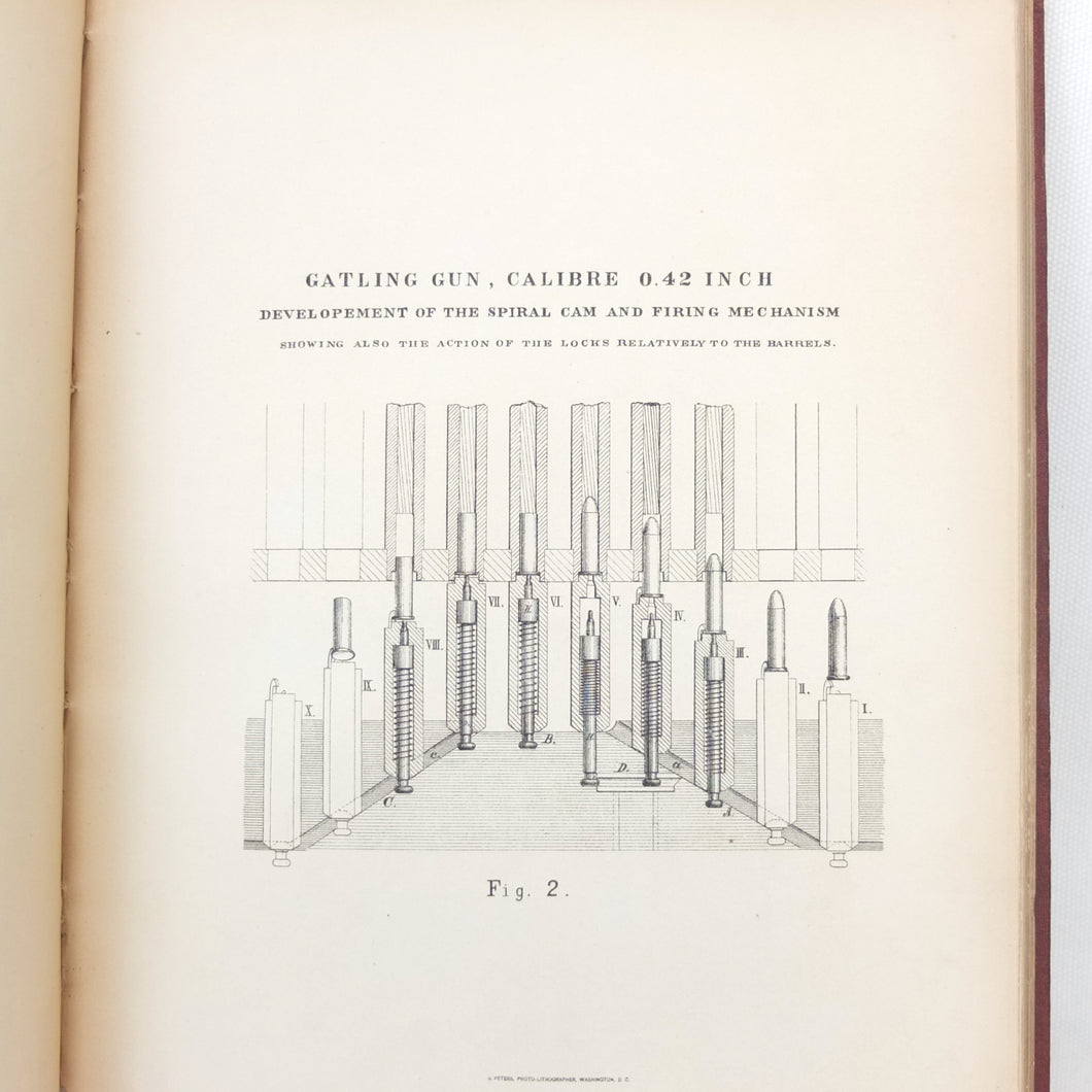 The very rare 1874 1st edition of the Ordnance Memoranda No. 17 - Gatling Guns, a US government report on the accuracy and standardization of the Gatling gun, invented by Richard J. Gatling (1818-1903) in 1861. Gatling guns are considered the first successful machine guns and forerunner to the modern electric motor-driven rotary cannon. Gatling wrote that he invented it to reduce the size armies, thus reducing deaths by combat and disease. The Gatling was one of the earliest machine guns which revolutionised warfare in the mid to late 19th century. But by the mid 1890’s the Gatling-type hand-cranked weapons had been rendered obsolete by the vastly superior new generation of fully automatic recoil-operated Vickers-Maxim machine guns.