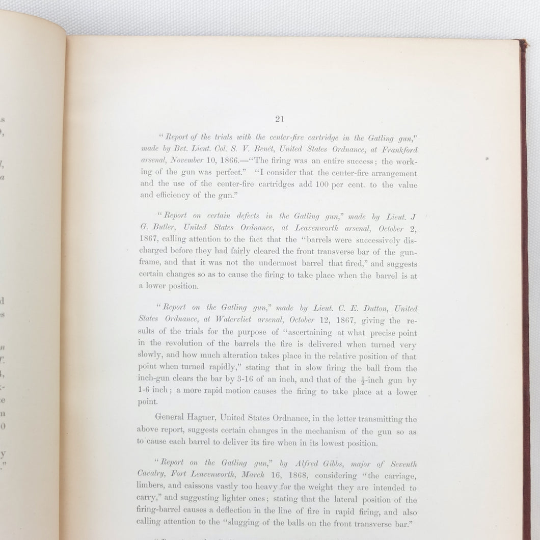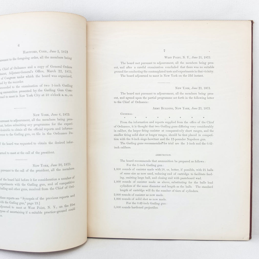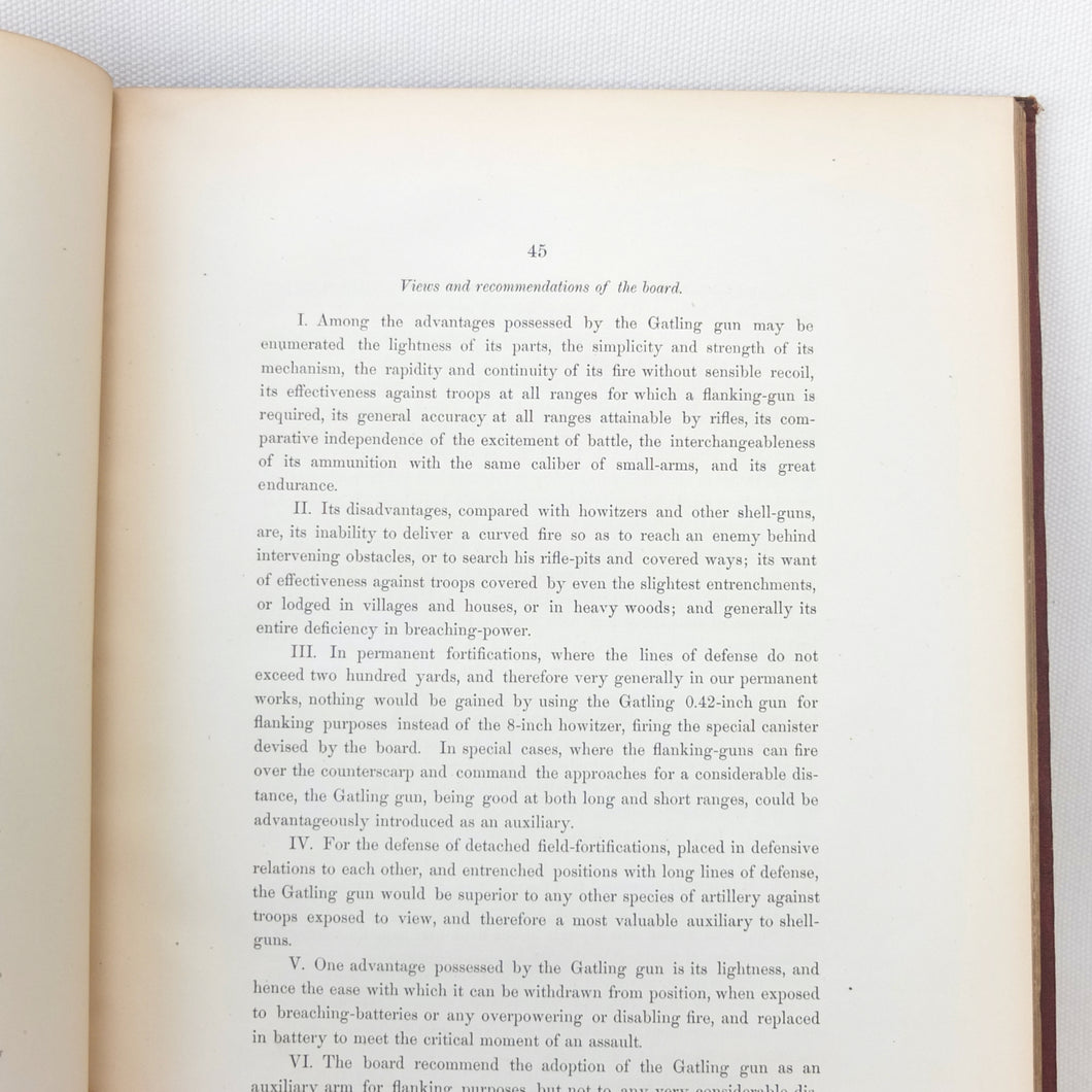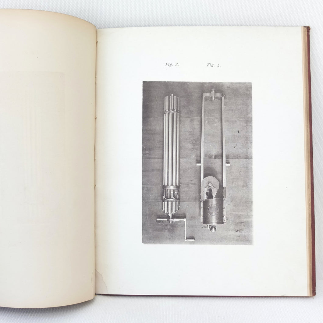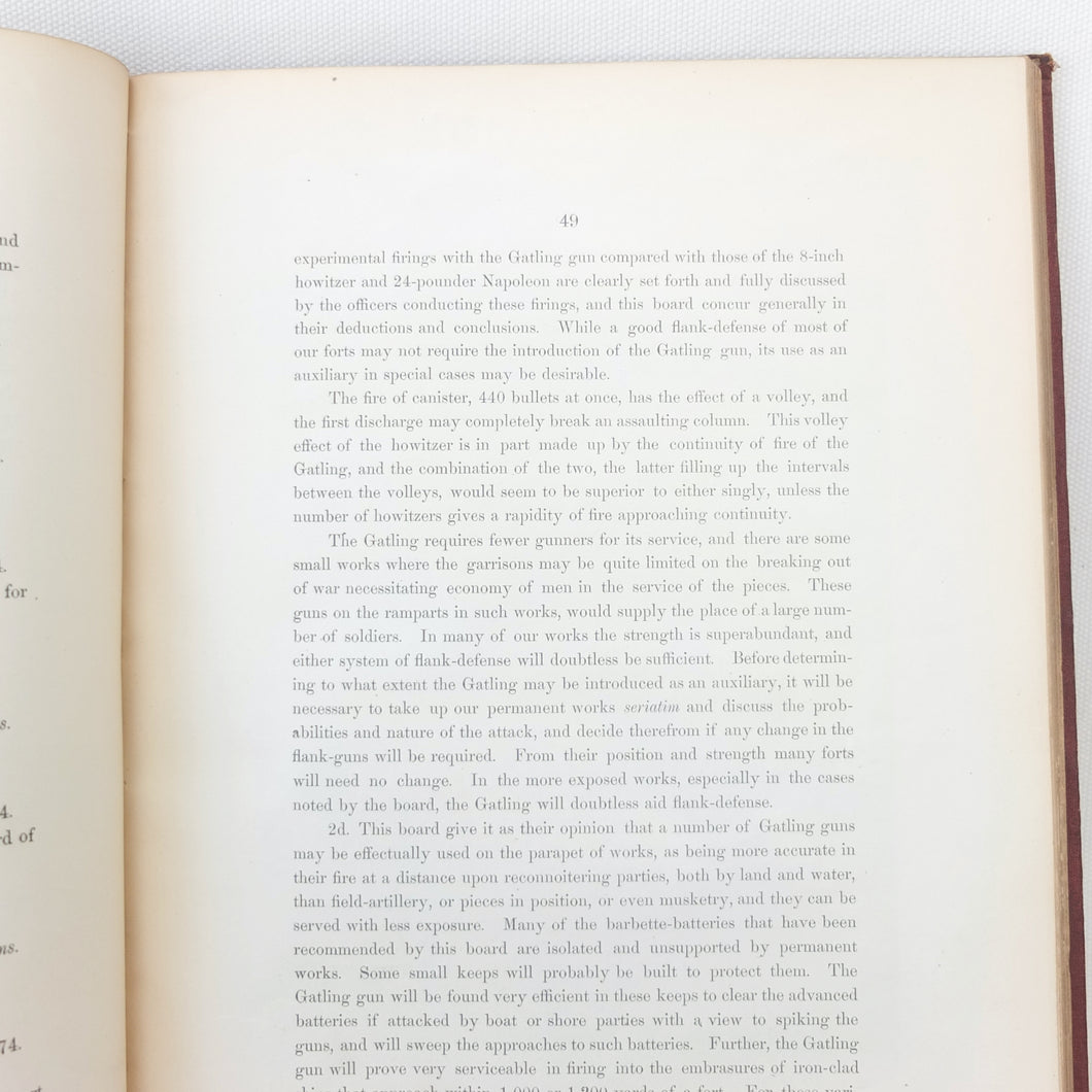 The very rare 1874 1st edition of the Ordnance Memoranda No. 17 - Gatling Guns, a US government report on the accuracy and standardization of the Gatling gun, invented by Richard J. Gatling (1818-1903) in 1861. Gatling guns are considered the first successful machine guns and forerunner to the modern electric motor-driven rotary cannon. Gatling wrote that he invented it to reduce the size armies, thus reducing deaths by combat and disease. The Gatling was one of the earliest machine guns which revolutionised warfare in the mid to late 19th century. But by the mid 1890’s the Gatling-type hand-cranked weapons had been rendered obsolete by the vastly superior new generation of fully automatic recoil-operated Vickers-Maxim machine guns.