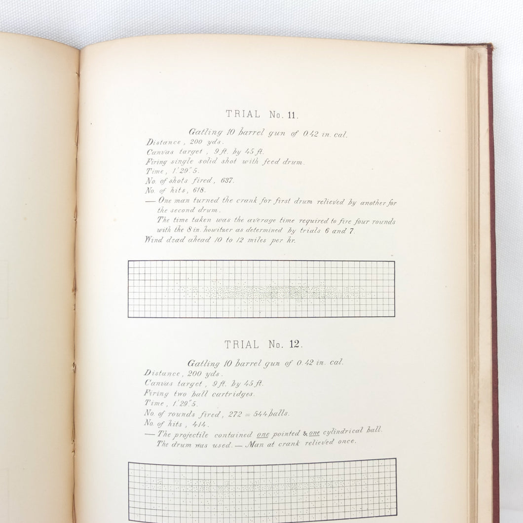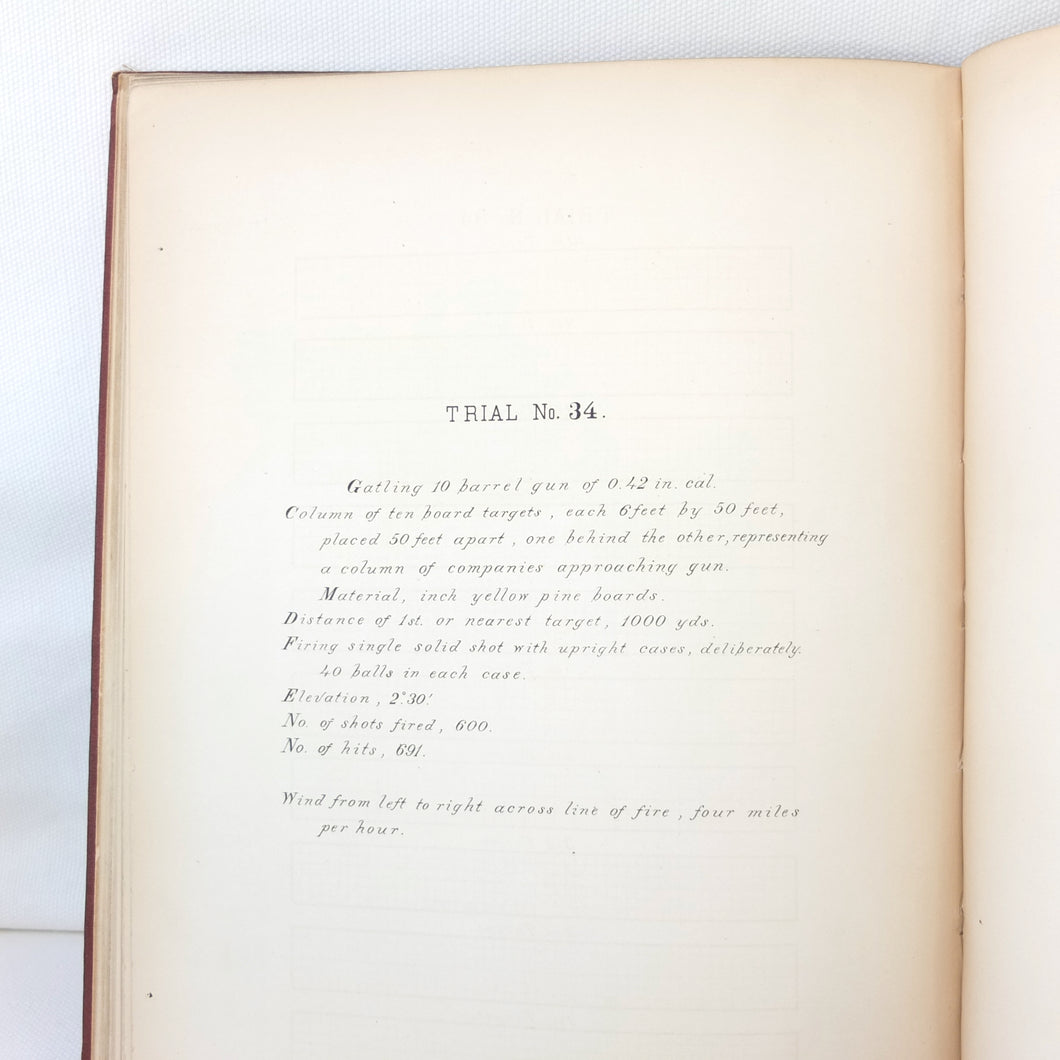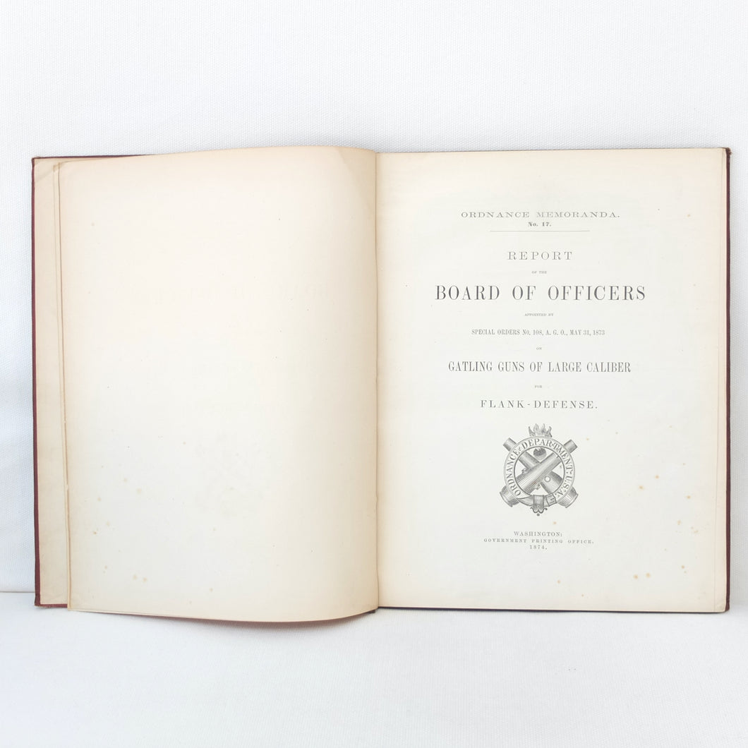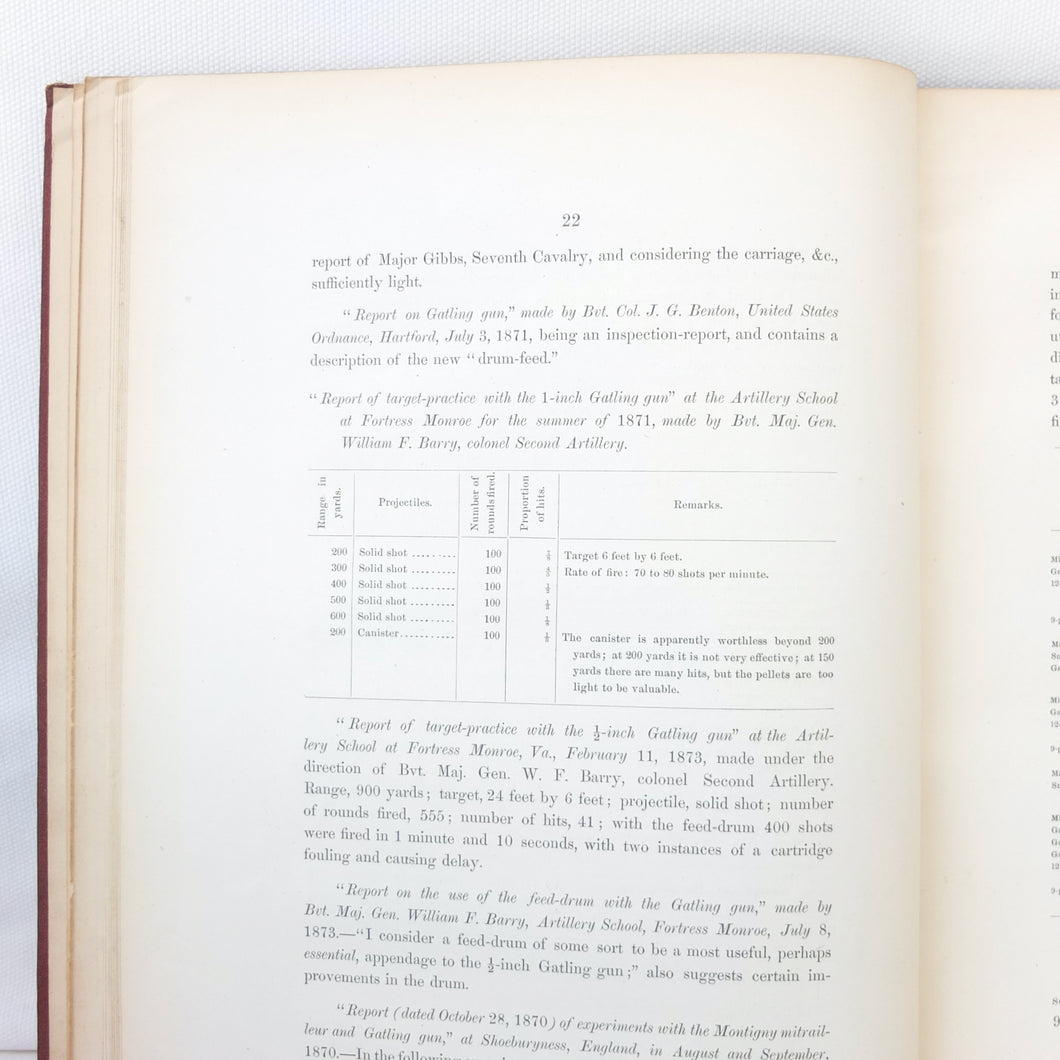 Ordnance Memoranda No. 17 was produced to show the results of the tests carried out in 1873 as part of the process to ‘decide upon the caliber of guns to be tried, and the ammunition to be used, in the experiments and tests of two Gatling guns of large caliber for flank-defense of fortifications’. It includes a description of the gun and its mechanism, ammunition, and specifications. There are also extensive reports of the various trials and results of the tests carried out, including firing at different distances, penetration and effects achieved with various types of ammunition, etc.