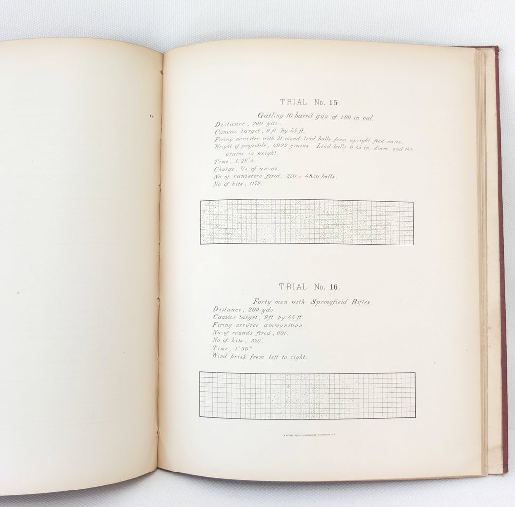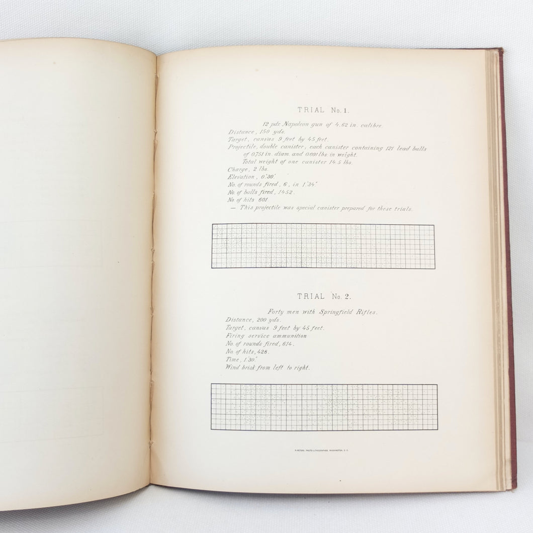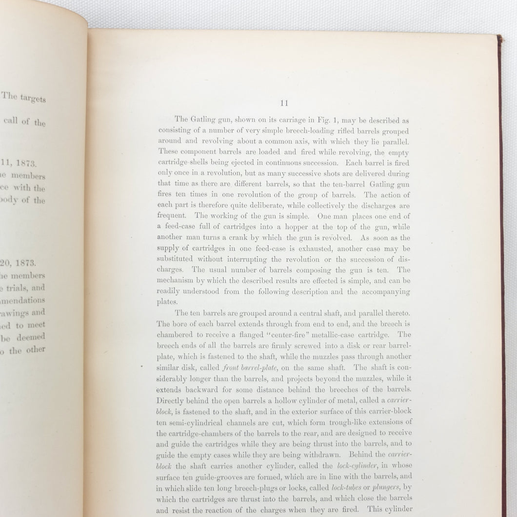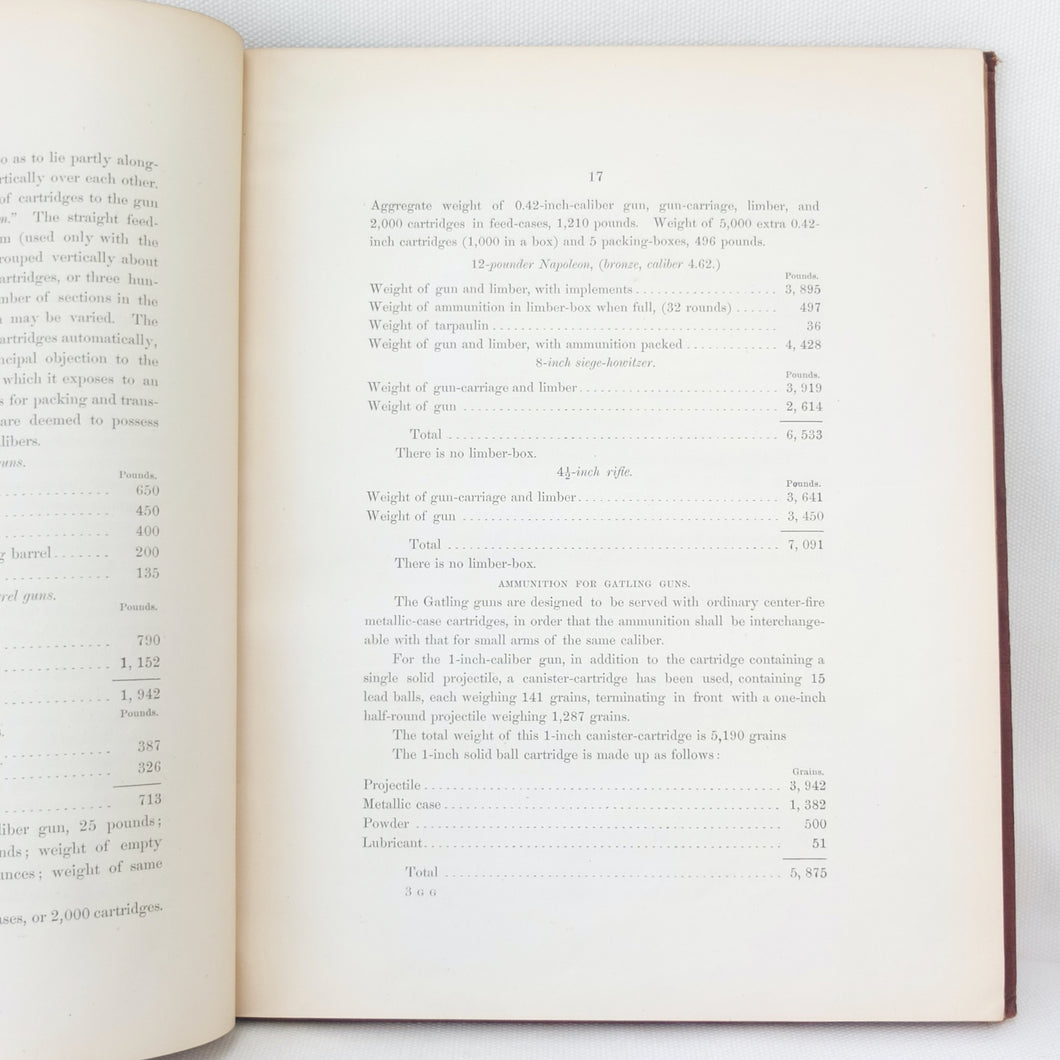 Ordnance Memoranda No. 17 was produced to show the results of the tests carried out in 1873 as part of the process to ‘decide upon the caliber of guns to be tried, and the ammunition to be used, in the experiments and tests of two Gatling guns of large caliber for flank-defense of fortifications’. It includes a description of the gun and its mechanism, ammunition, and specifications. There are also extensive reports of the various trials and results of the tests carried out, including firing at different distances, penetration and effects achieved with various types of ammunition, etc.