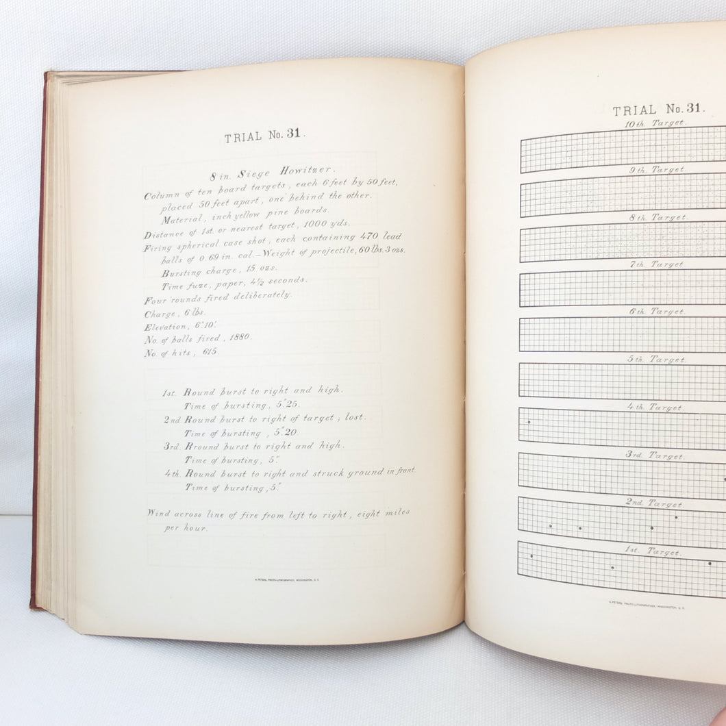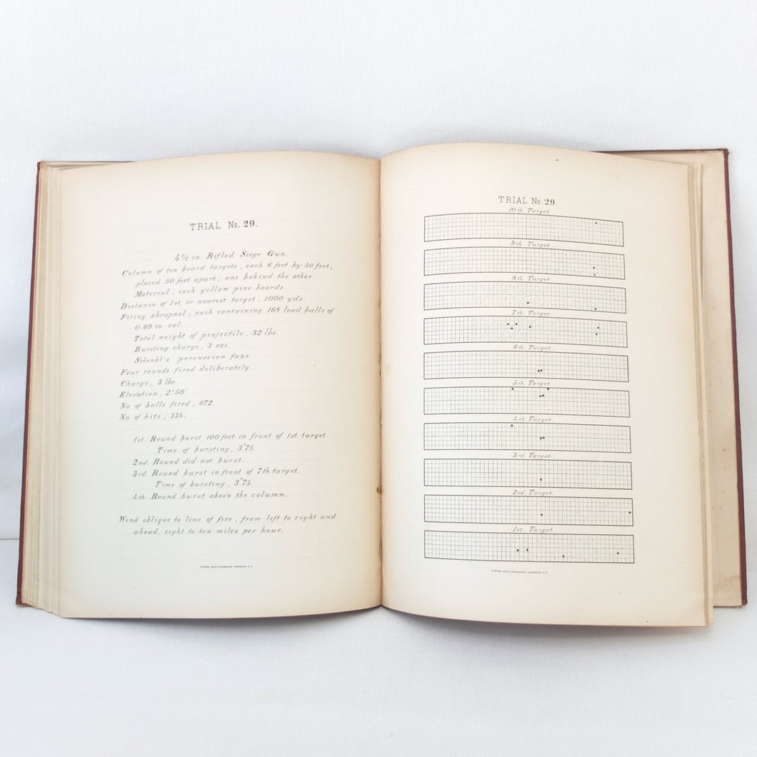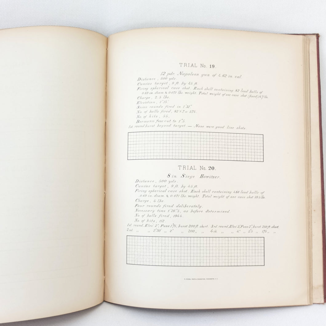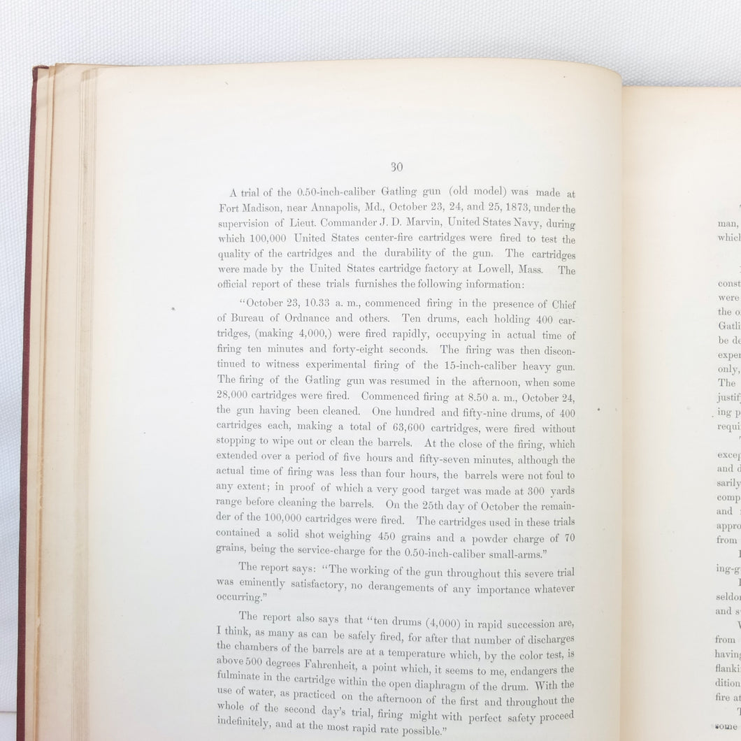 Ordnance Memoranda No. 17 was produced to show the results of the tests carried out in 1873 as part of the process to ‘decide upon the caliber of guns to be tried, and the ammunition to be used, in the experiments and tests of two Gatling guns of large caliber for flank-defense of fortifications’. It includes a description of the gun and its mechanism, ammunition, and specifications. There are also extensive reports of the various trials and results of the tests carried out, including firing at different distances, penetration and effects achieved with various types of ammunition, etc.