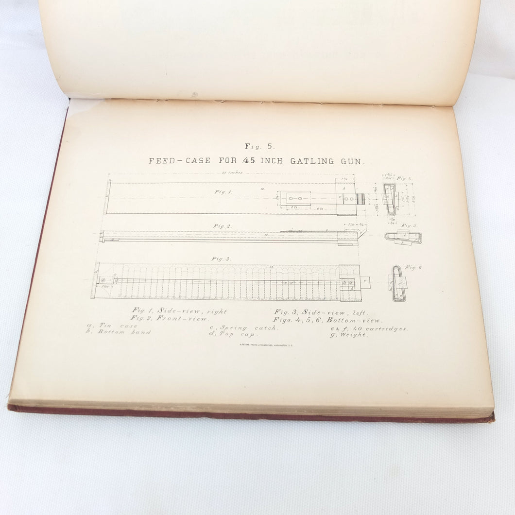 The volume is illustrated with line drawings of parts of the mechanism, ammunition, and feed case, two photographic plates of the Gatling gun, and diagrams showing the trial firing results.