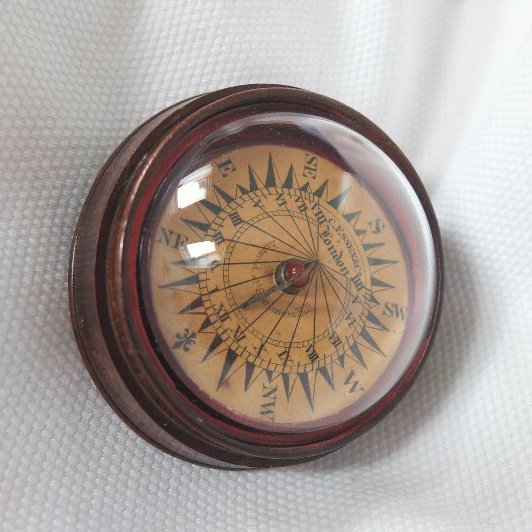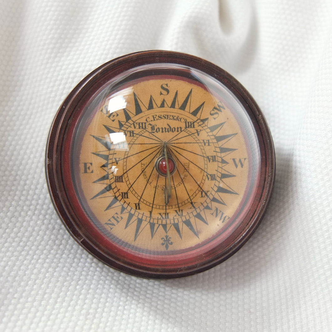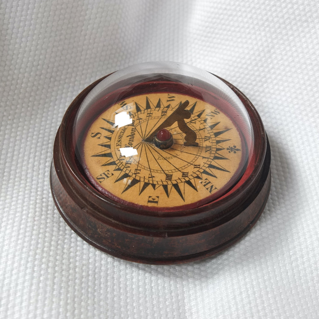 A Charles Essex & Co. Pocket Sundial Compass or Pantochronometer, dating from c.1825, and signed on the dial 'C. Essex & Co, London'. Charles Essex is known to have been in business as an optician in Clerkenwell, London between 1824 and 1828. This sundial compass has a wooden case with a domed push-fit lid, a paper compass card with a jewelled pivot, and a brass gnomon. The interior of the wooden case is painted red, and the compass card is protected by a domed glass cover.