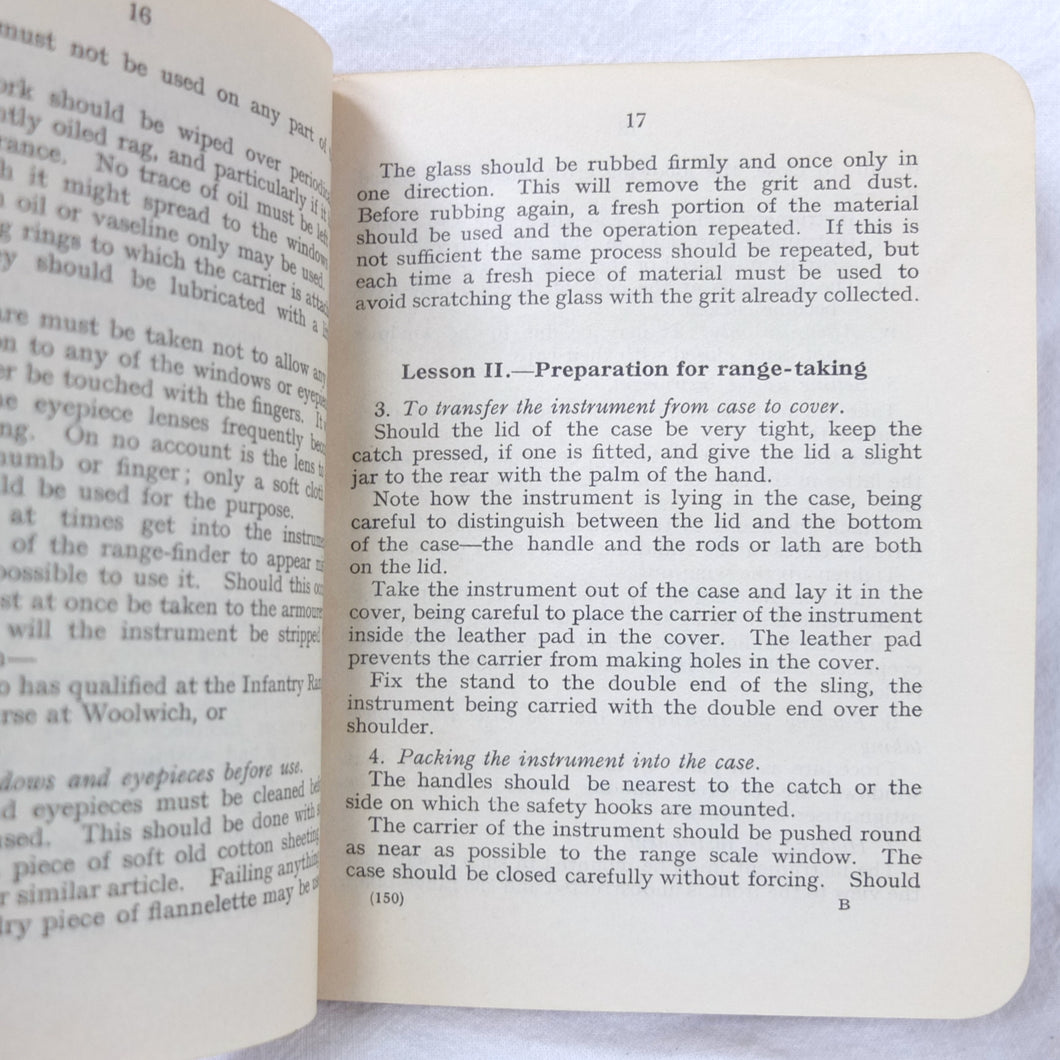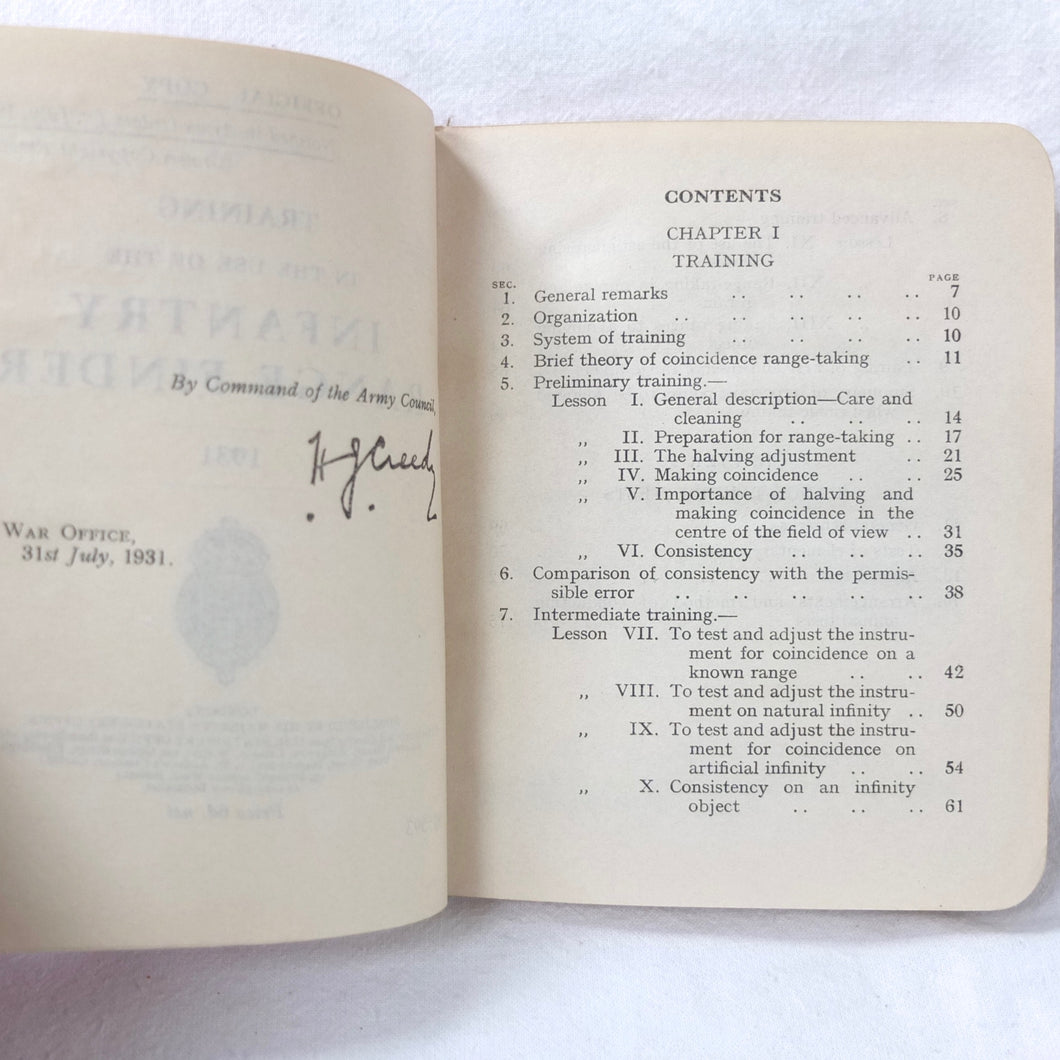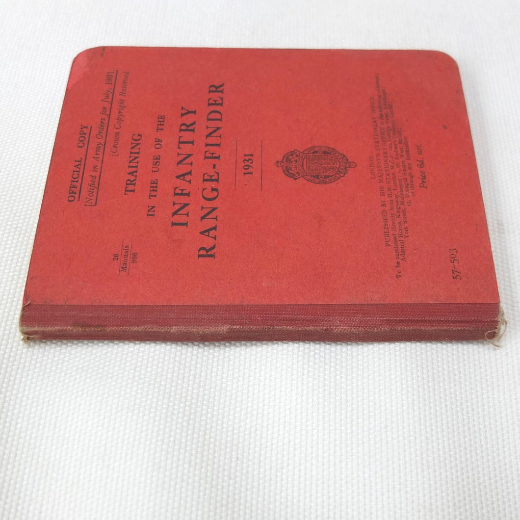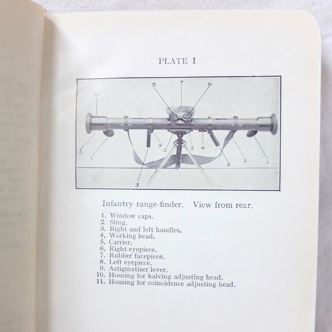 An original British Army Range-Finder training handbook published in 1931. Training in the use of the Infantry Range-Finder is illustrated with diagrams, line drawings, and plates. It covers all the elements of training in the use of the standard issue Barr & Stroud type infantry range-finder. This type of range-finder would have been used in conjunction with the .303 Vickers machine gun, which was the standard British Army heavy machine gun throughout both the First and Second World Wars. This volume is a comprehensive handbook of all aspects of range-finder use. Subjects covered include: theory of range-finding, operation of range-finders, training in their use, taking ranges of moving objects, testing the range-finder, packing and transport.