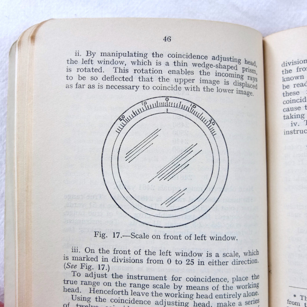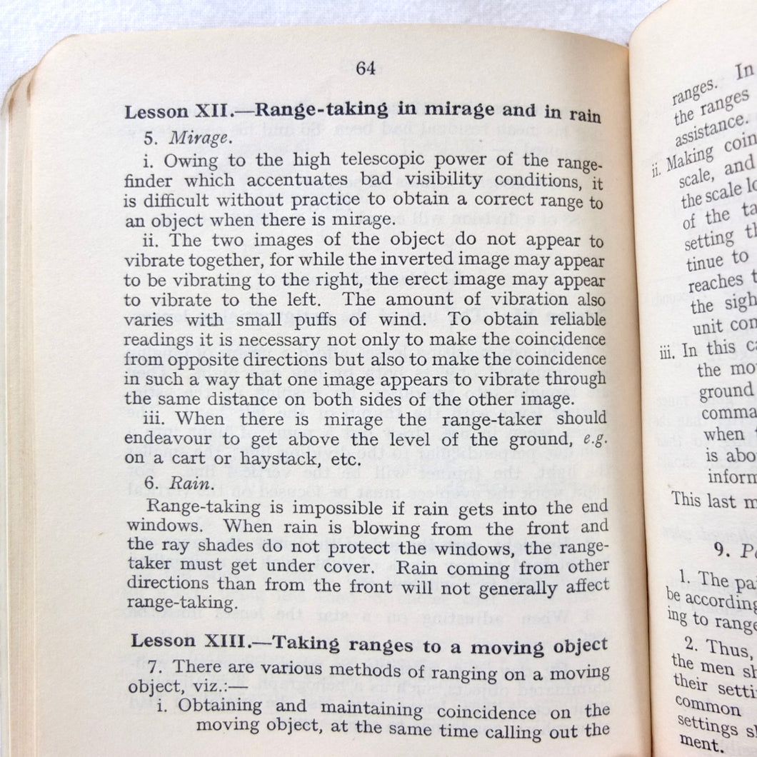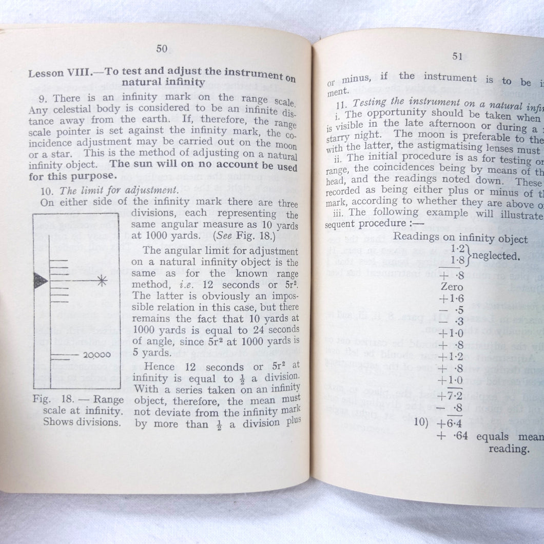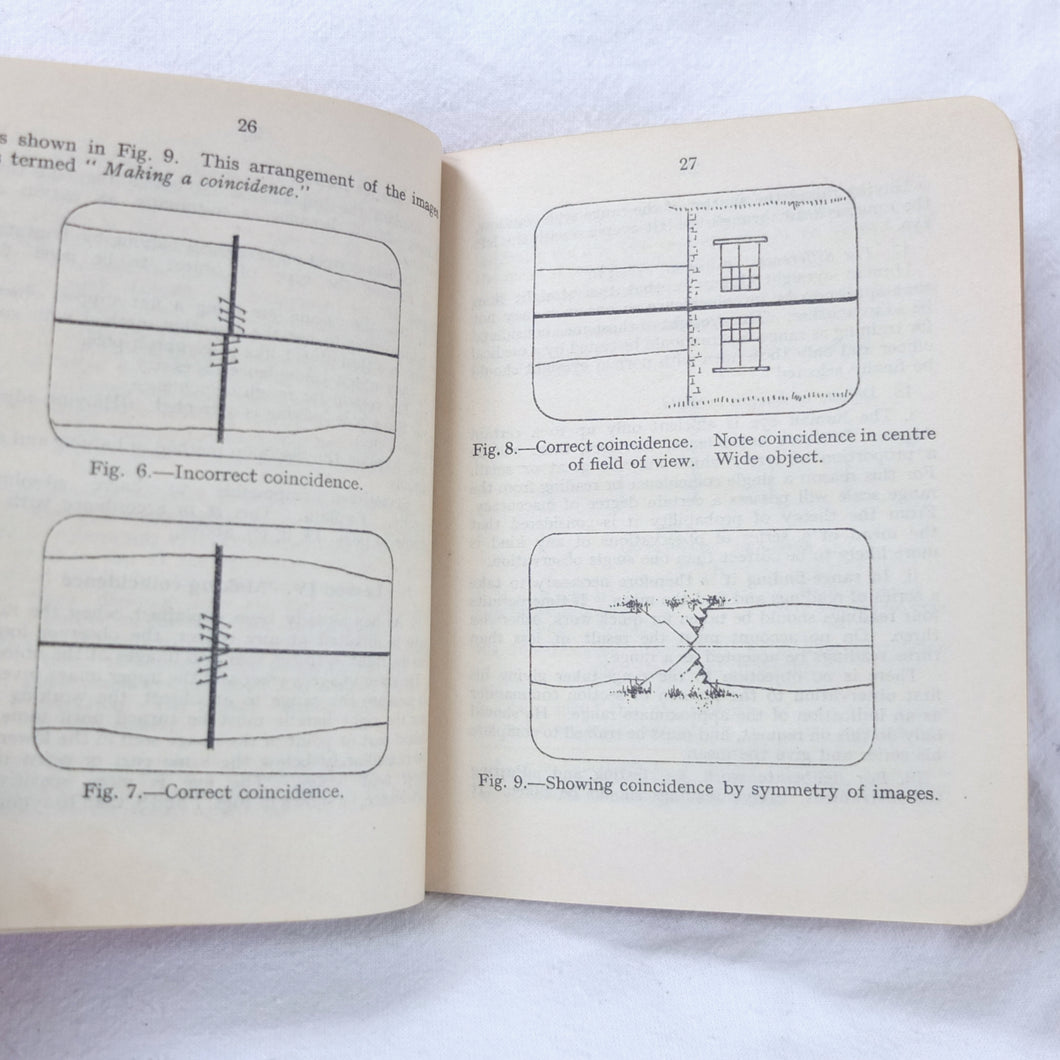 An original British Army Range-Finder training handbook published in 1931. Training in the use of the Infantry Range-Finder is illustrated with diagrams, line drawings, and plates. It covers all the elements of training in the use of the standard issue Barr & Stroud type infantry range-finder. This type of range-finder would have been used in conjunction with the .303 Vickers machine gun, which was the standard British Army heavy machine gun throughout both the First and Second World Wars. This volume is a comprehensive handbook of all aspects of range-finder use. Subjects covered include: theory of range-finding, operation of range-finders, training in their use, taking ranges of moving objects, testing the range-finder, packing and transport.