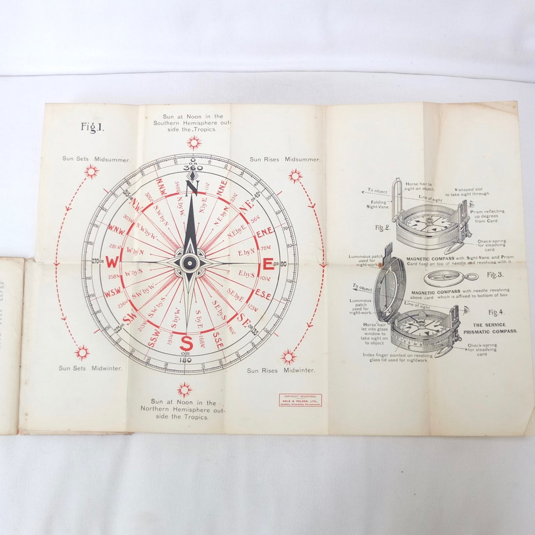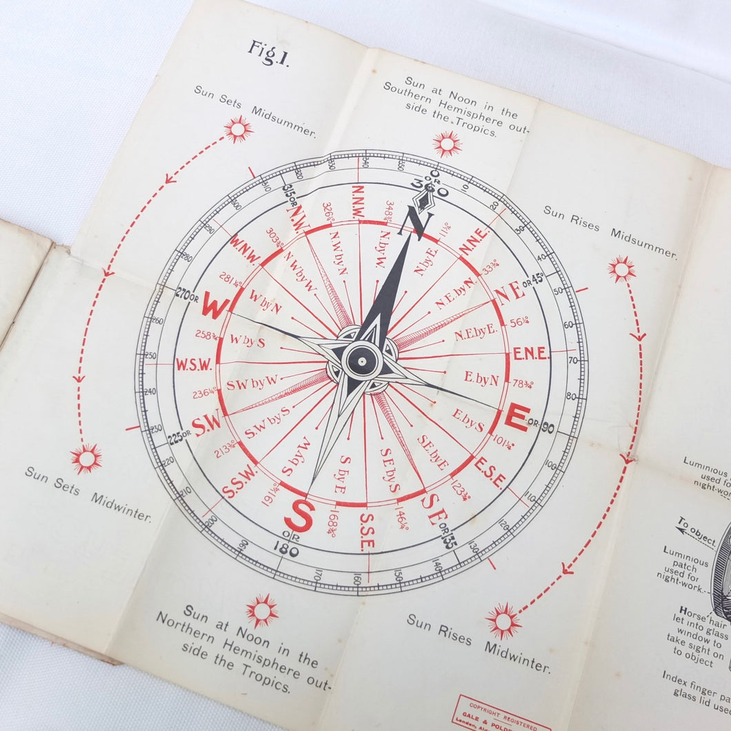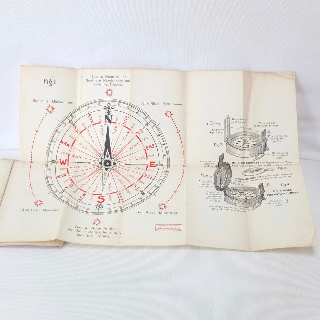 An original WW1 British military compass manual covering the use of the service compass, undated, but first published by Gale & Polden in 1909. This 2nd edition is from c.1914. A concise and practical manual, written for military use, the book is illustrated with a large folding coloured compass rose diagram and illustrations of the prismatic service compass.