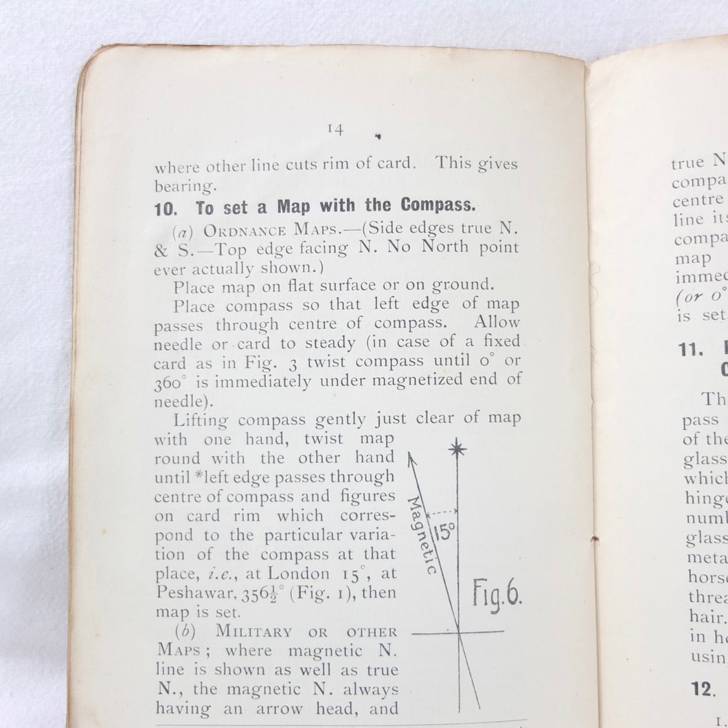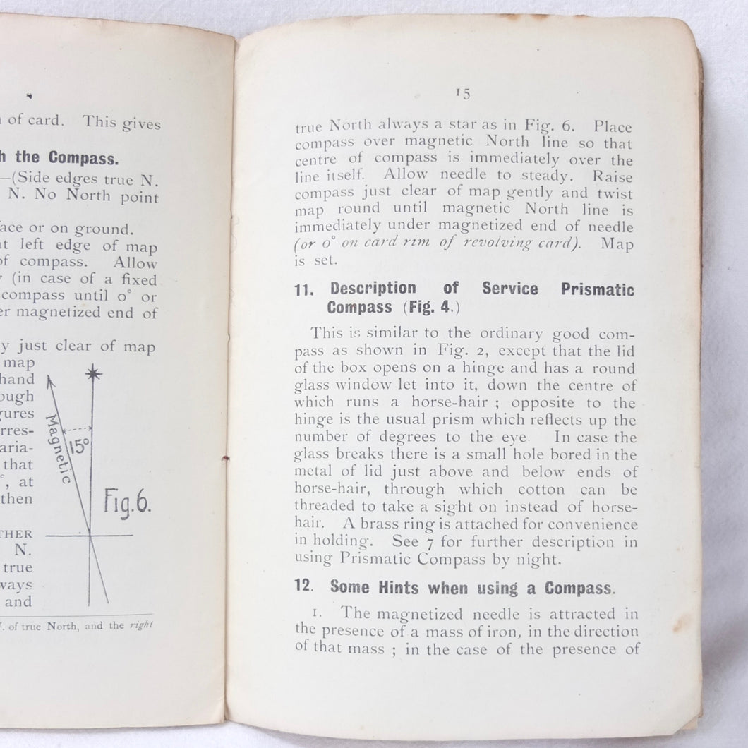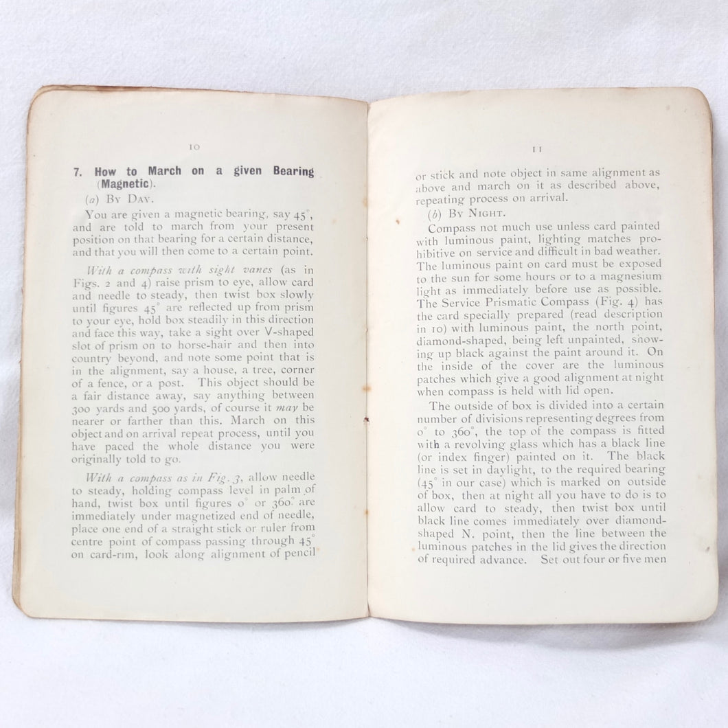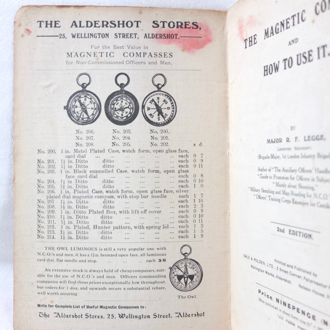 An original WW1 British military compass manual covering the use of the service compass, undated, but first published by Gale & Polden in 1909. This 2nd edition is from c.1914. A concise and practical manual, written for military use, the book is illustrated with a large folding coloured compass rose diagram and illustrations of the prismatic service compass.