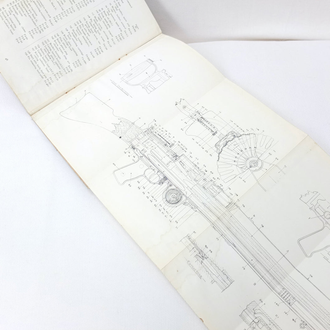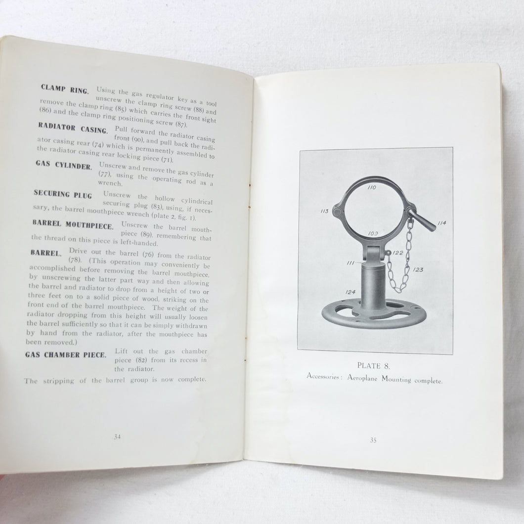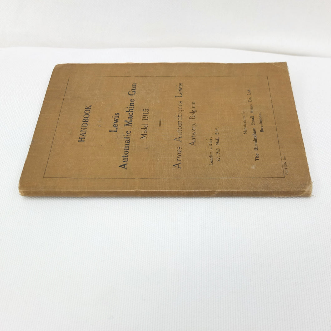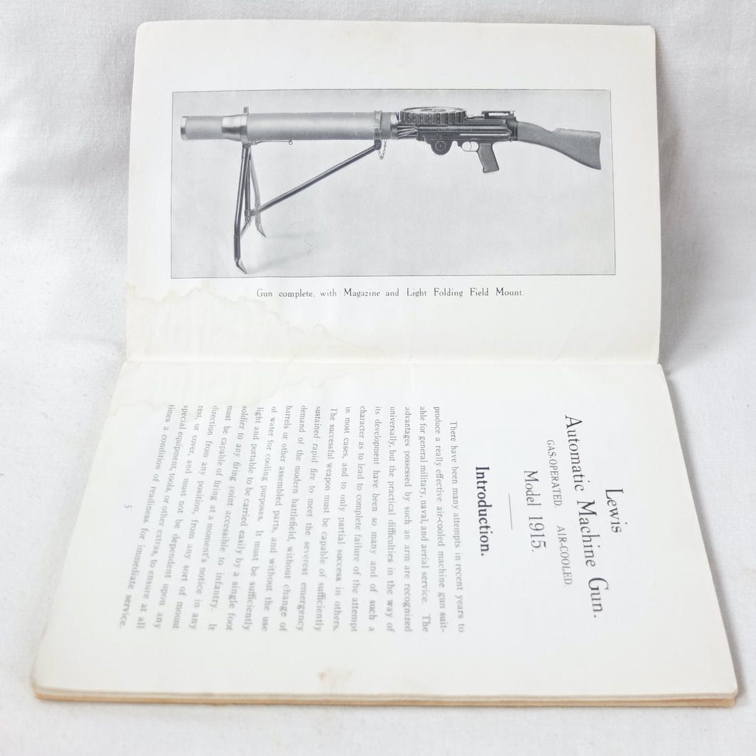 A rare original WW1 Lewis Automatic Machine Gun handbook, published by the manufacturer, the Birmingham Small Arms Co. Ltd in 1915. The Lewis Gun was manufactured during the First World War by both BSA of Birmingham and the Savage Arms Co. of New York. This book is a guide to the mechanism, handling and maintenance of the ground and aircraft variants of the Lewis Gun, as used by the British Army Royal Flying Corps and RAF during WW1. Illustrated with photographs and a large fold out diagram of the Lewis, it includes a great deal of useful information, including details of how to assemble, load and fire the gun, parts, spares and accessories.