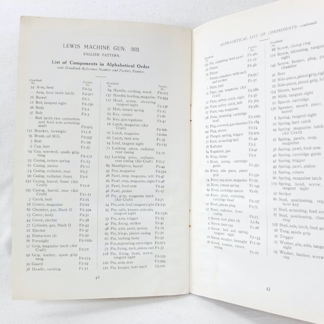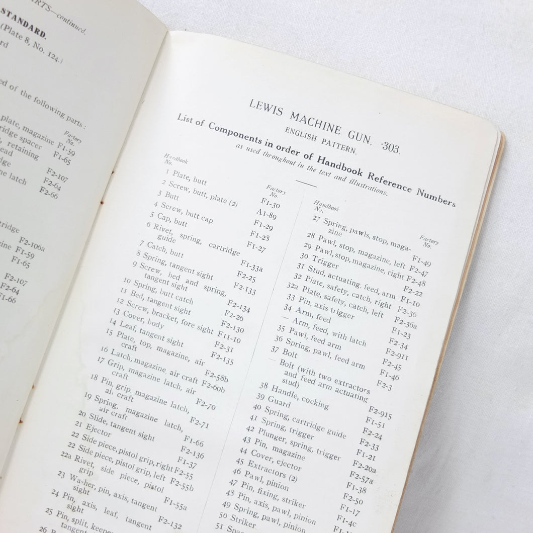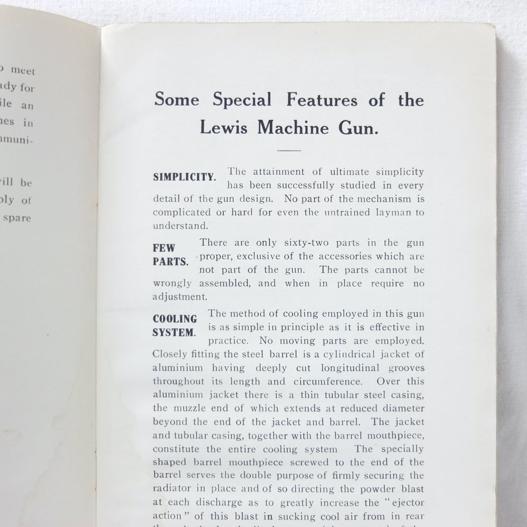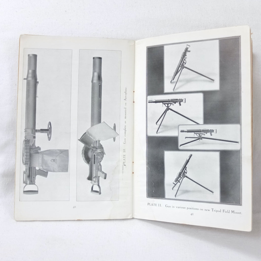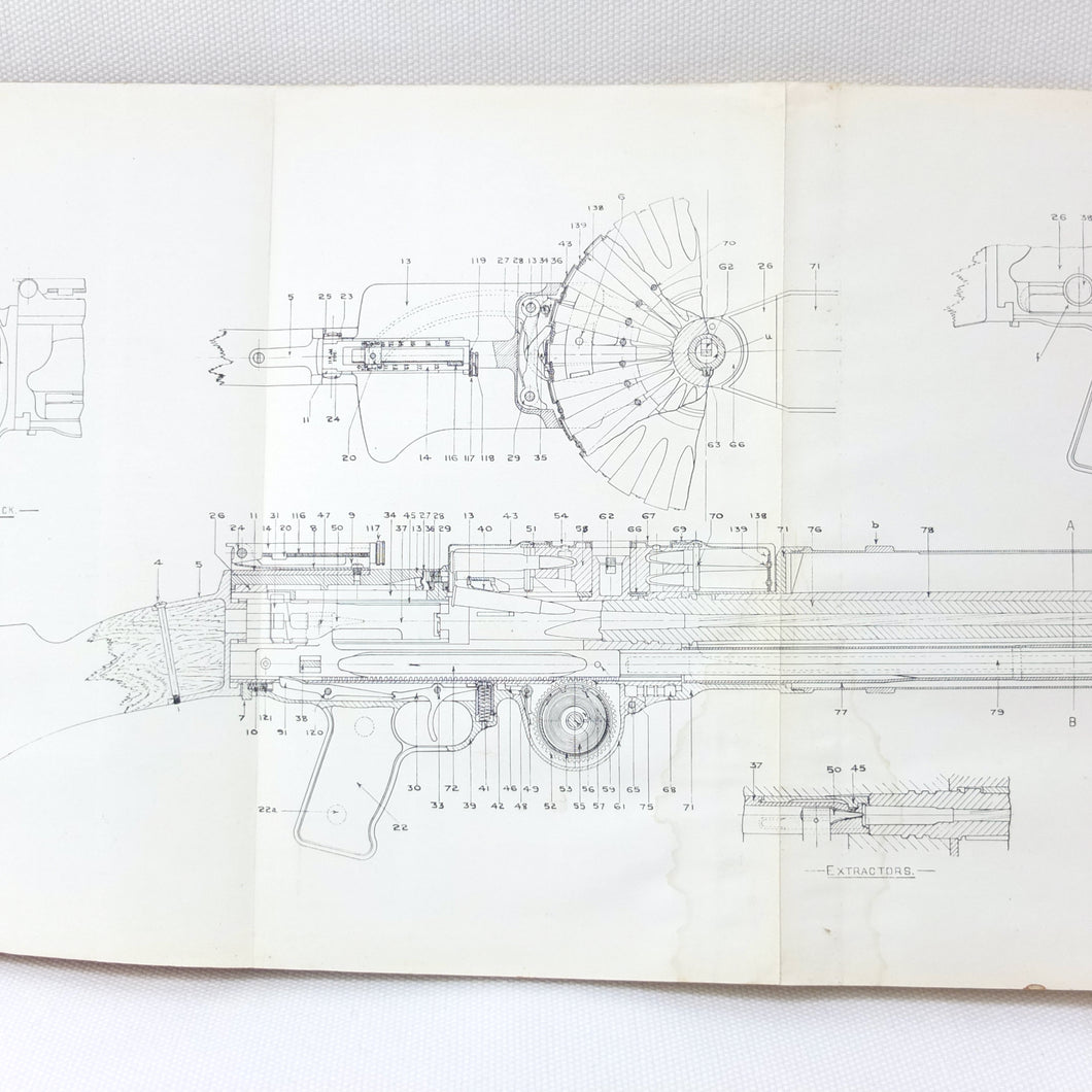 A rare original WW1 Lewis Automatic Machine Gun handbook, published by the manufacturer, the Birmingham Small Arms Co. Ltd in 1915. The Lewis Gun was manufactured during the First World War by both BSA of Birmingham and the Savage Arms Co. of New York. This book is a guide to the mechanism, handling and maintenance of the ground and aircraft variants of the Lewis Gun, as used by the British Army Royal Flying Corps and RAF during WW1. Illustrated with photographs and a large fold out diagram of the Lewis, it includes a great deal of useful information, including details of how to assemble, load and fire the gun, parts, spares and accessories.