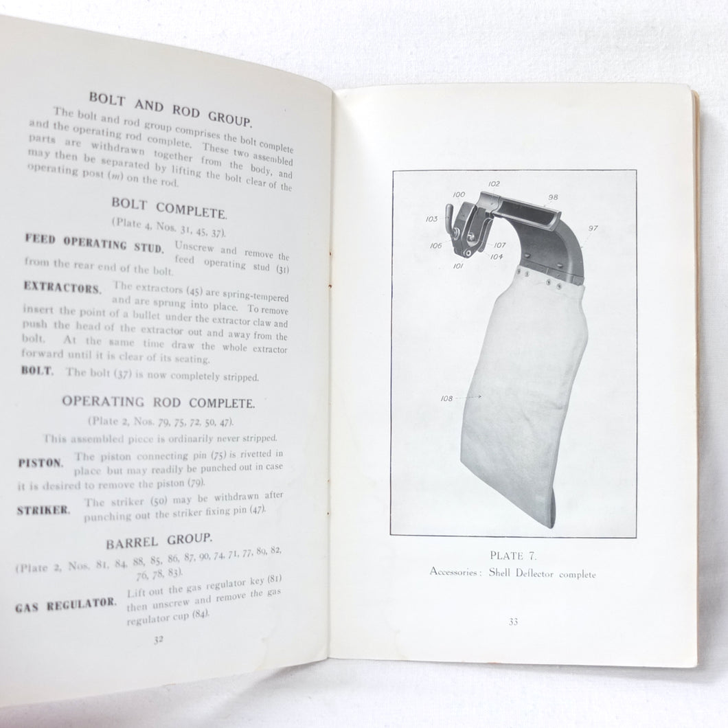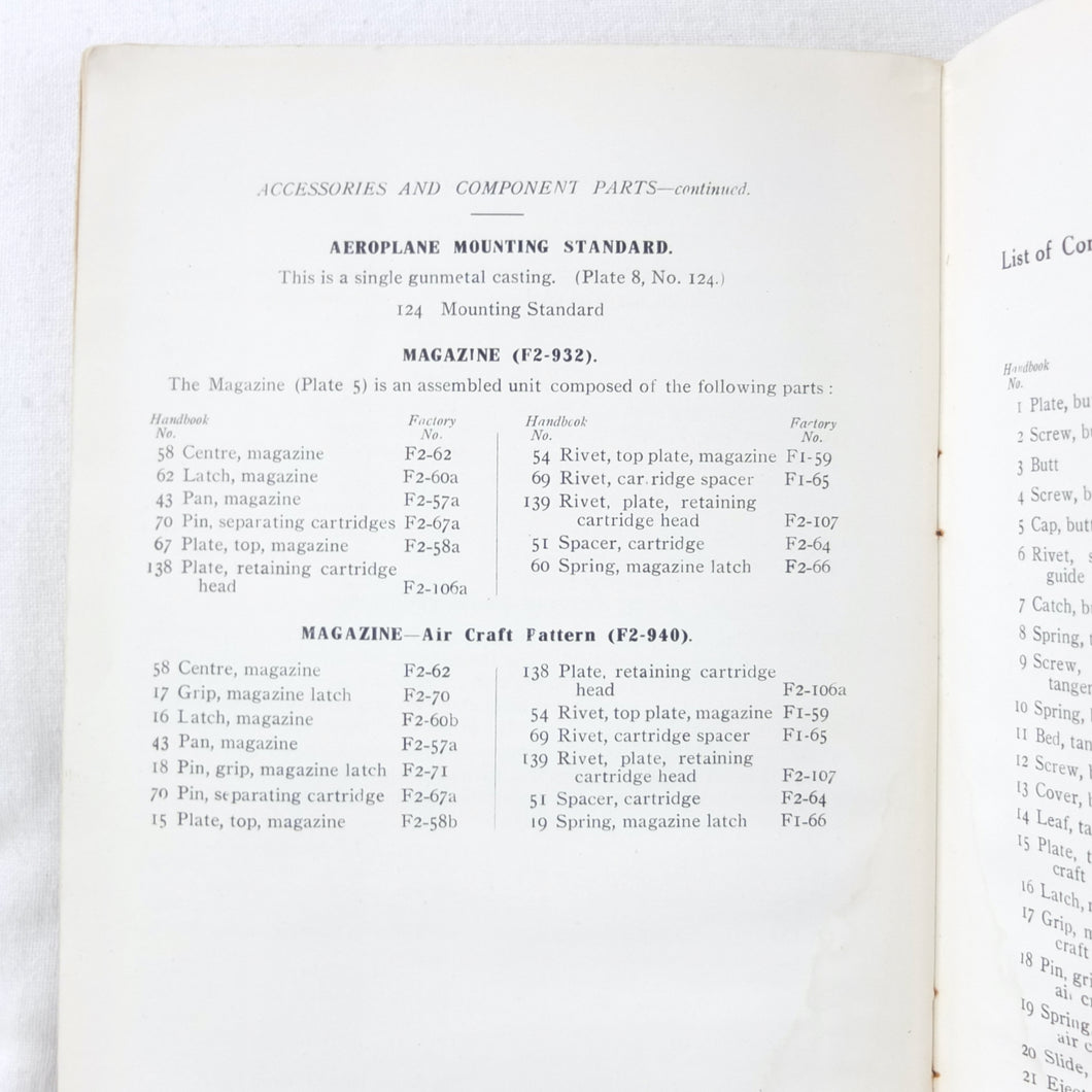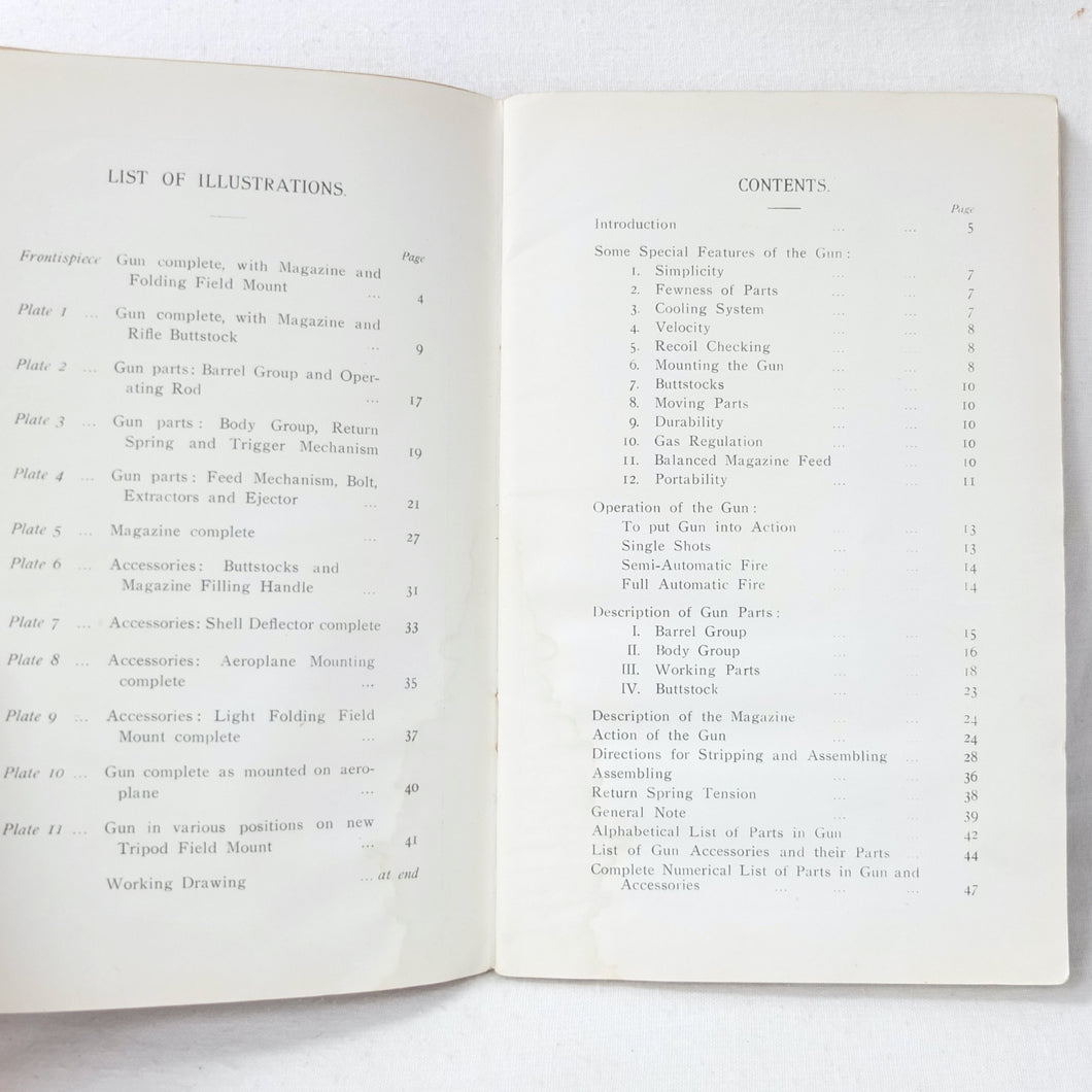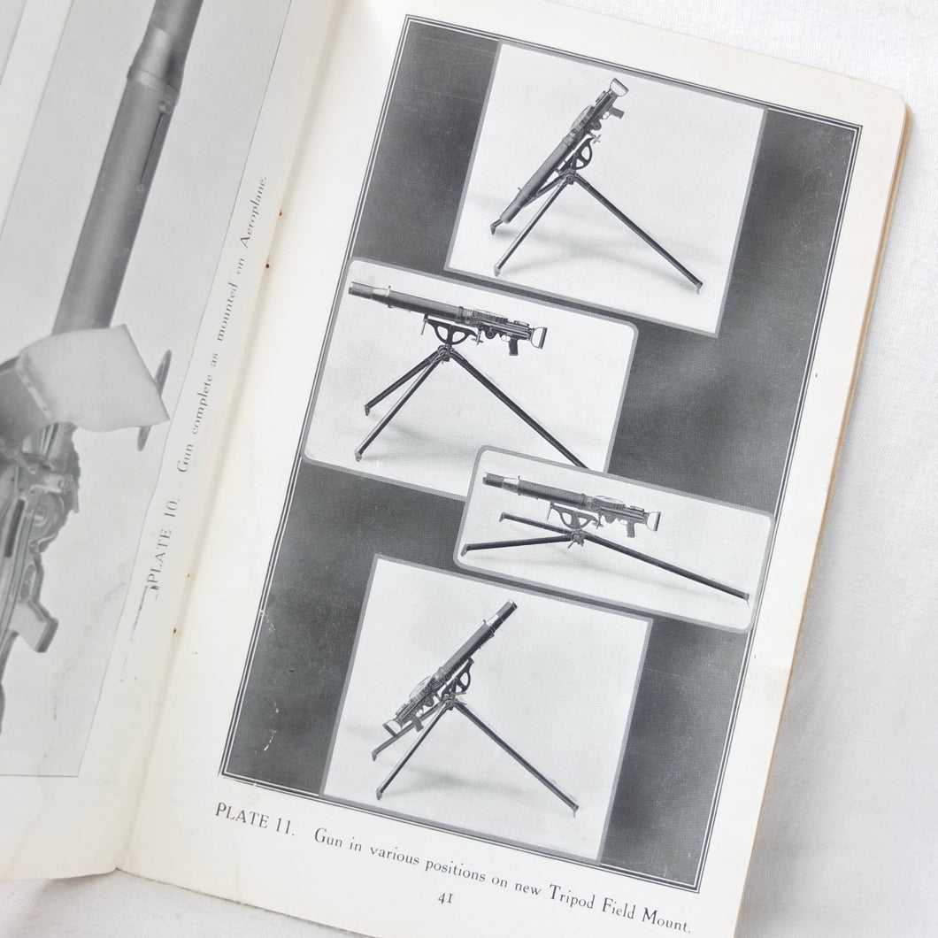 A rare original WW1 Lewis Automatic Machine Gun handbook, published by the manufacturer, the Birmingham Small Arms Co. Ltd in 1915. The Lewis Gun was manufactured during the First World War by both BSA of Birmingham and the Savage Arms Co. of New York. This book is a guide to the mechanism, handling and maintenance of the ground and aircraft variants of the Lewis Gun, as used by the British Army Royal Flying Corps and RAF during WW1. Illustrated with photographs and a large fold out diagram of the Lewis, it includes a great deal of useful information, including details of how to assemble, load and fire the gun, parts, spares and accessories.