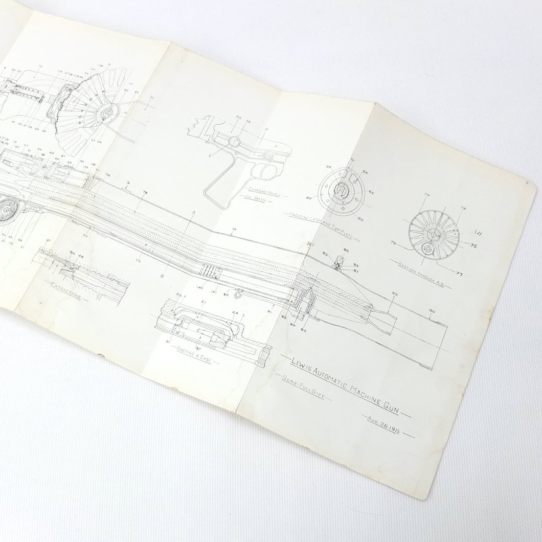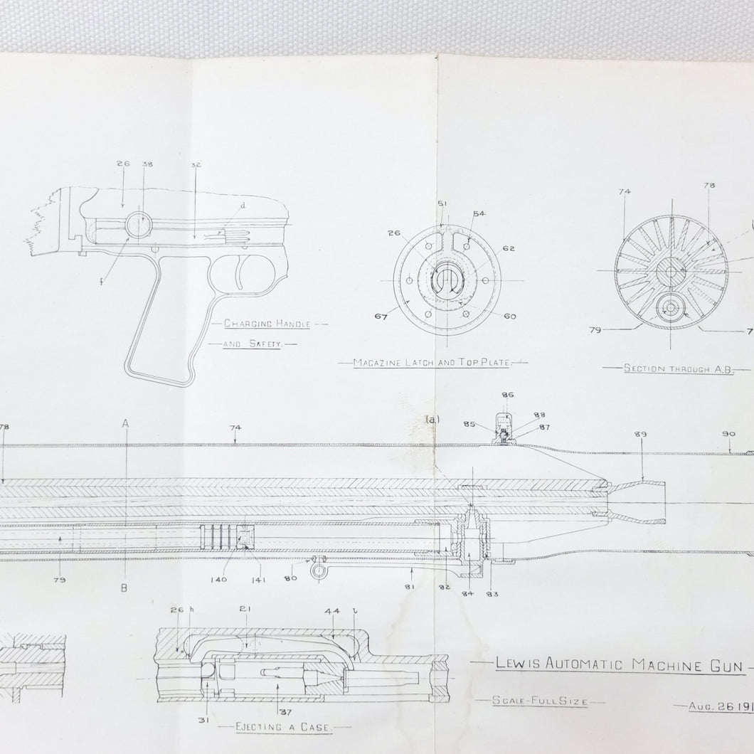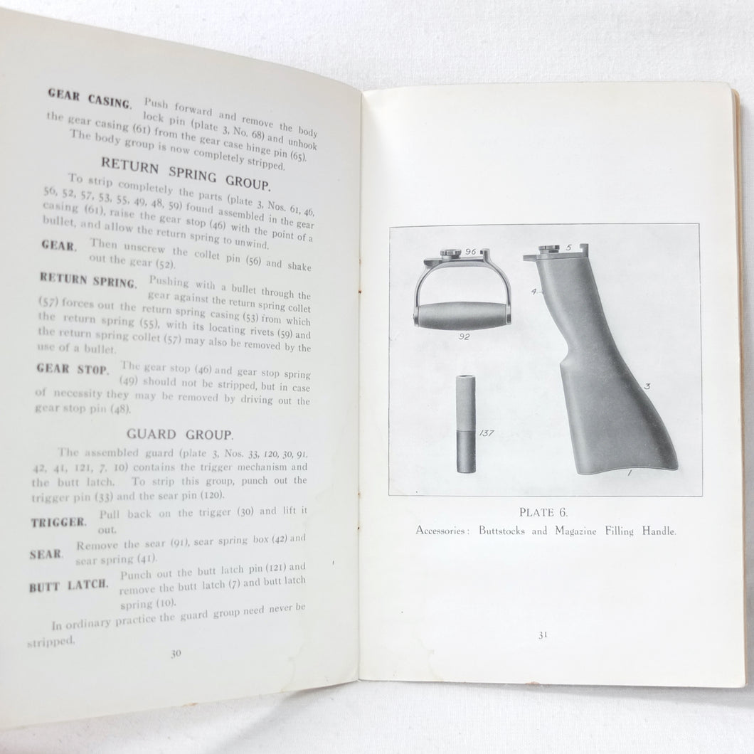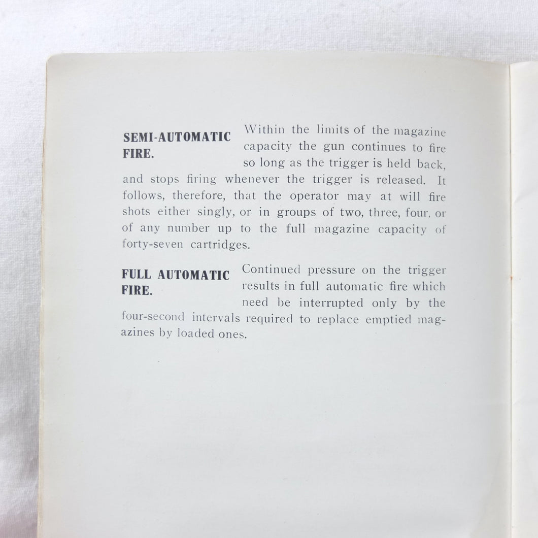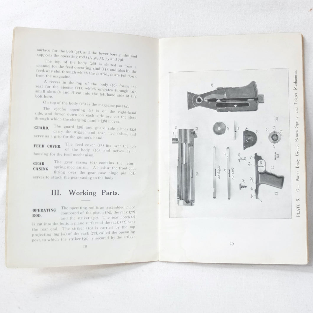 A rare original WW1 Lewis Automatic Machine Gun handbook, published by the manufacturer, the Birmingham Small Arms Co. Ltd in 1915. The Lewis Gun was manufactured during the First World War by both BSA of Birmingham and the Savage Arms Co. of New York. This book is a guide to the mechanism, handling and maintenance of the ground and aircraft variants of the Lewis Gun, as used by the British Army Royal Flying Corps and RAF during WW1. Illustrated with photographs and a large fold out diagram of the Lewis, it includes a great deal of useful information, including details of how to assemble, load and fire the gun, parts, spares and accessories.