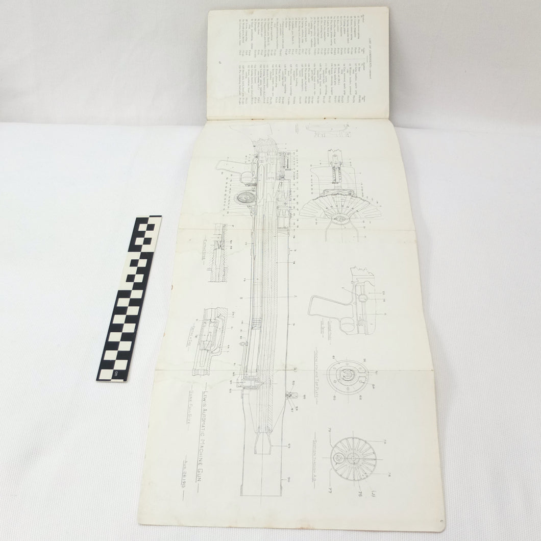 In good condition. The cloth-covered card cover shows minor signs of wear and use, and some slight rippling of the cloth. The hinges and binding are good and secure. The text and illustrations are in good condition, with some faint water stains to the central margins of the pages. The large fold-out diagram of the Lewis Gun attached to the back cover of the book is in good condition, with some faint water stains.