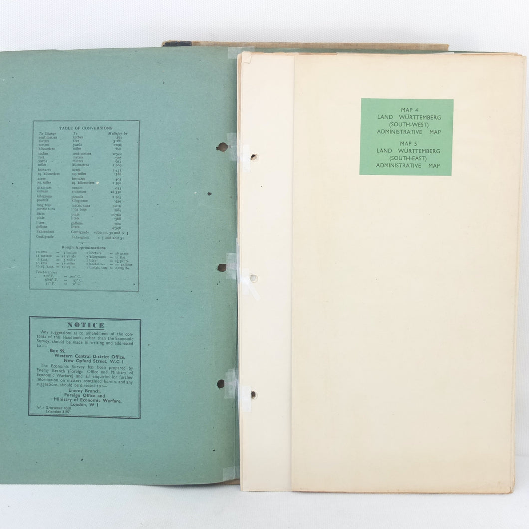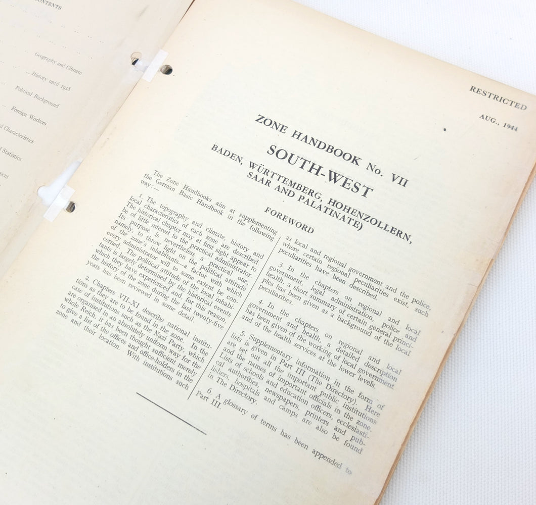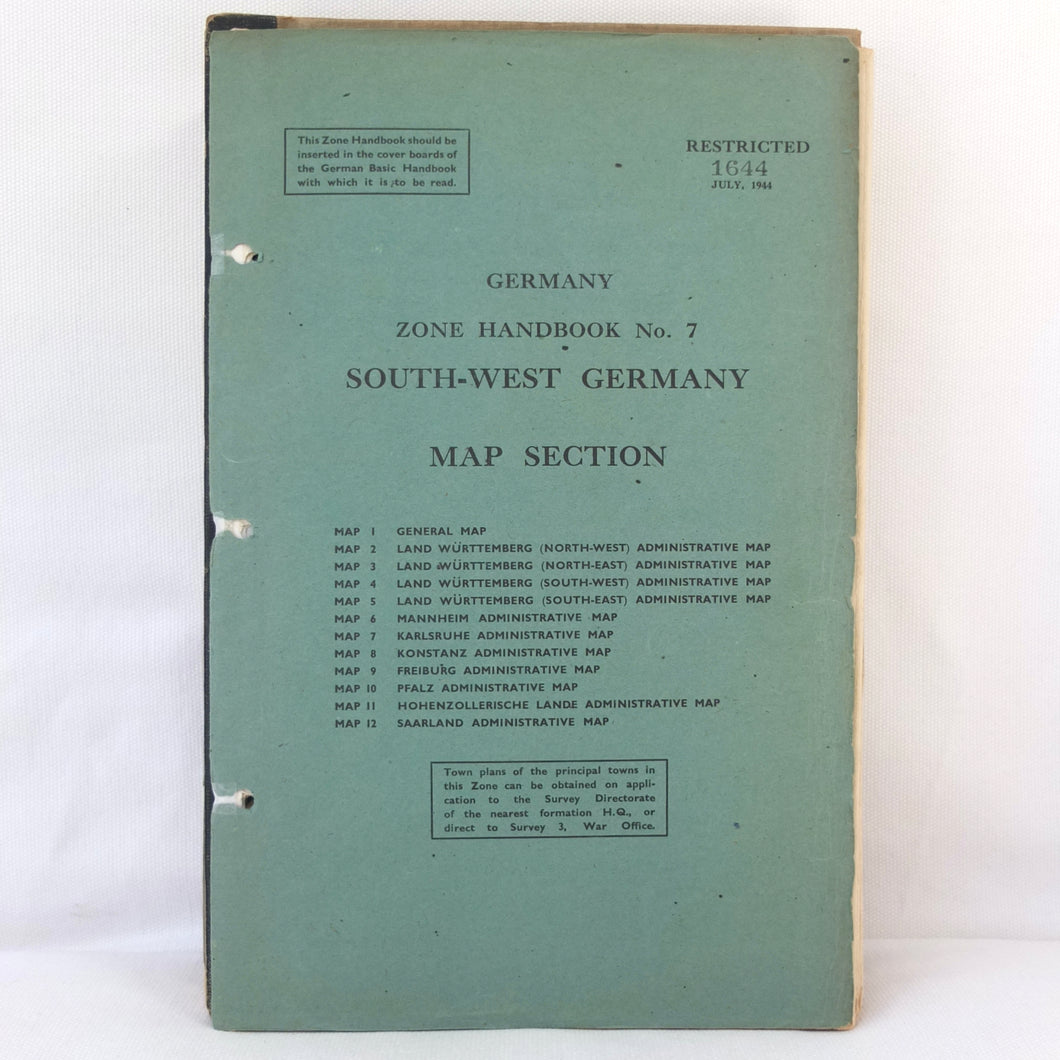 There is also an additional ‘Restricted’ document inserted at the rear, the Zone Handbook No. 7 South West Germany. A supplement to the main section of the Basic Handbook, this had a limited circulation and each copy was individually numbered. This is copy No. 1644. The Zone Handbook came with its own map section, consisting of 12 maps, of which 8 are present. The text of the Zone Handbook is incomplete, running to 68 pages, with several sections missing.