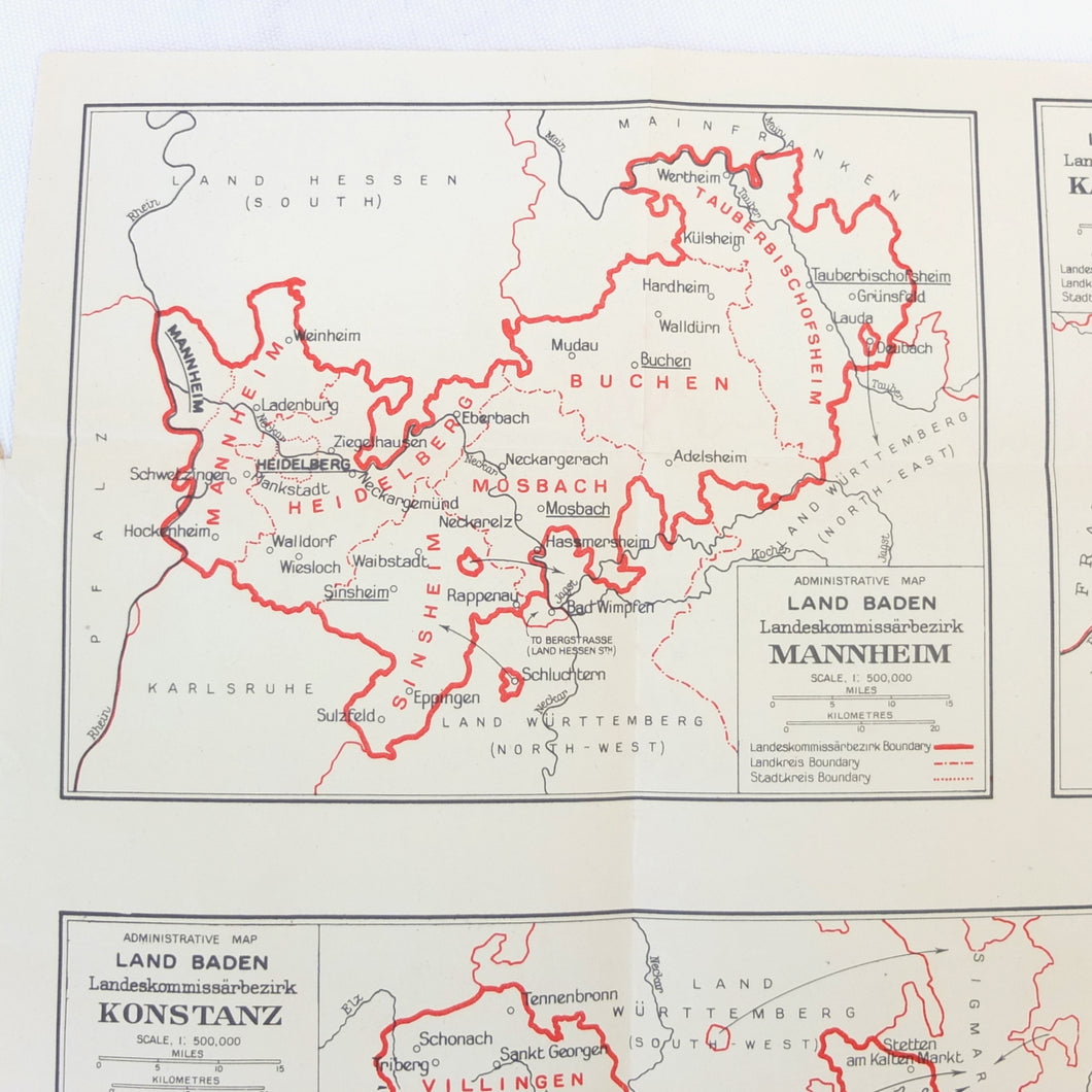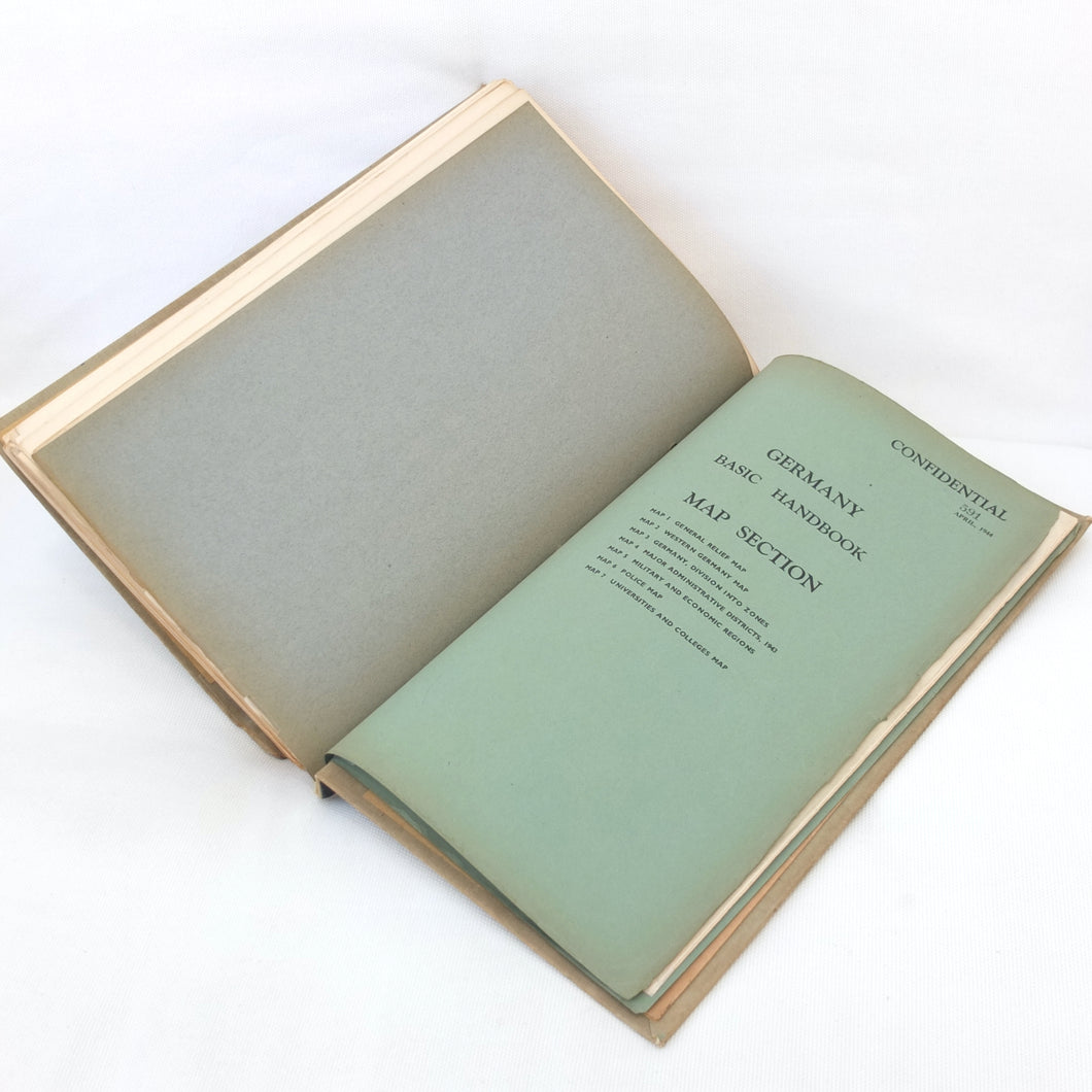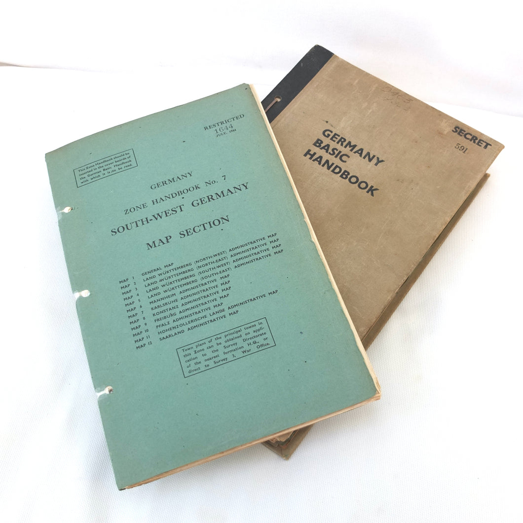There is also an additional ‘Restricted’ document inserted at the rear, the Zone Handbook No. 7 South West Germany. A supplement to the main section of the Basic Handbook, this had a limited circulation and each copy was individually numbered. This is copy No. 1644. The Zone Handbook came with its own map section, consisting of 12 maps, of which 8 are present. The text of the Zone Handbook is incomplete, running to 68 pages, with several sections missing.