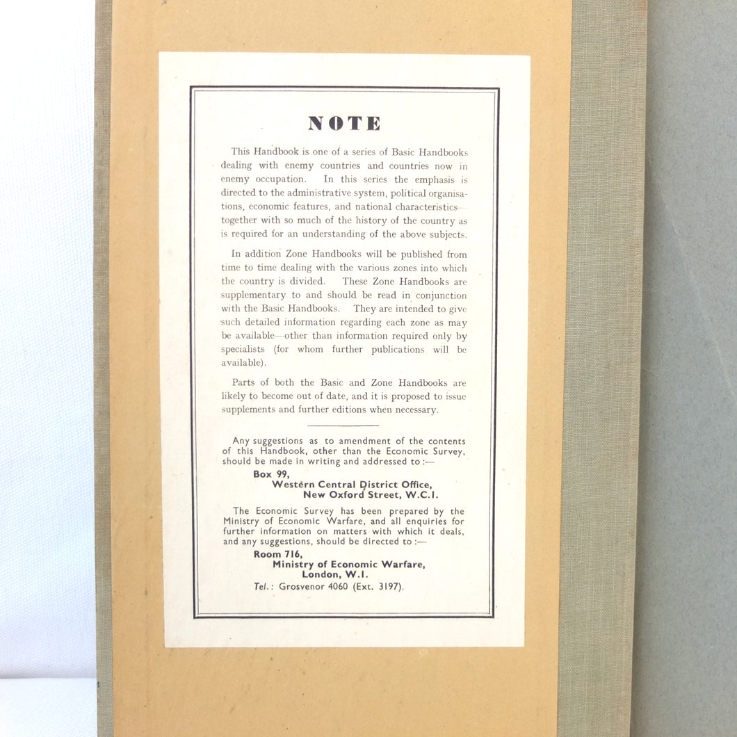 Ministry of Economic Warfare Basic Handbooks: This series of handbooks covered enemy and occupied countries and was compiled from April 1943 onwards, at the request of the Joint Intelligence Committee. Classified as secret, this comprehensive collection of numerous highly detailed volumes was intended to reflect official British understanding and thinking, rather than being an exercise in propaganda. This included an indication of the state of contemporary knowledge of the persecution of Jewish people, concentration camps, the extent of collaboration and resistance in occupied countries, and other aspects of Nazi programmes and methods. Countries and regions were also provided with historical and political introductions, often covering the period from antiquity to recent 20th century politics. Discussions of recent events such as the Anschluss were more sophisticated than anything which would have been publicly permissible during the war. MEW’s links with SOE are also highlighted in the anecdotal nature of some of the information, which would have been based on agents’ reports, intercepts, and captured documents. The Basic Handbooks were being continuously amended and updated until the end of the war.