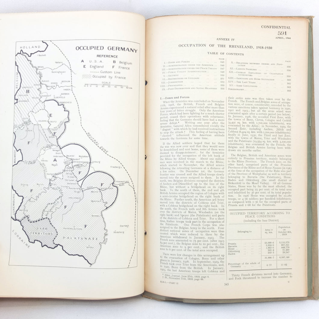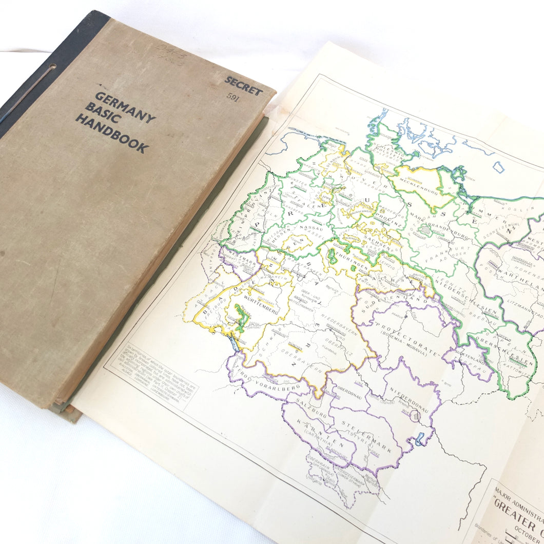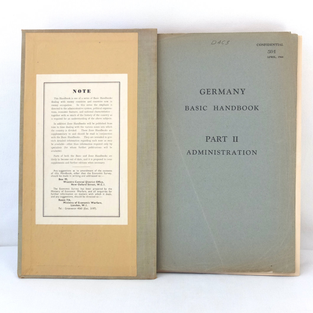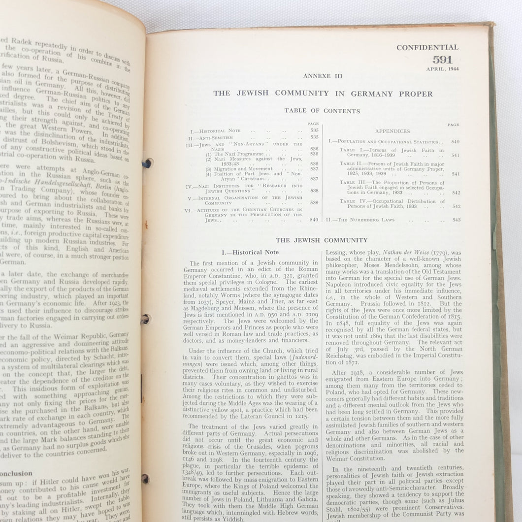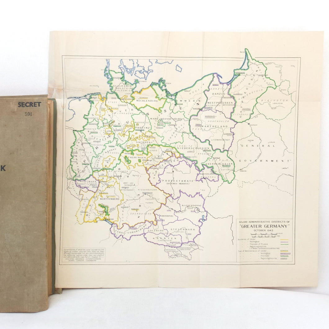 An extremely rare WW2 British Ministry of Economic Warfare secret intelligence handbook, produced in April 1944. It is a huge volume, weighing almost 3kg and running to over 640 pages. This was a secret document with a restricted circulation, each copy being individually numbered. This is copy number 591. It includes a wealth of contemporary intelligence material on Germany and the Nazi State in 1944.