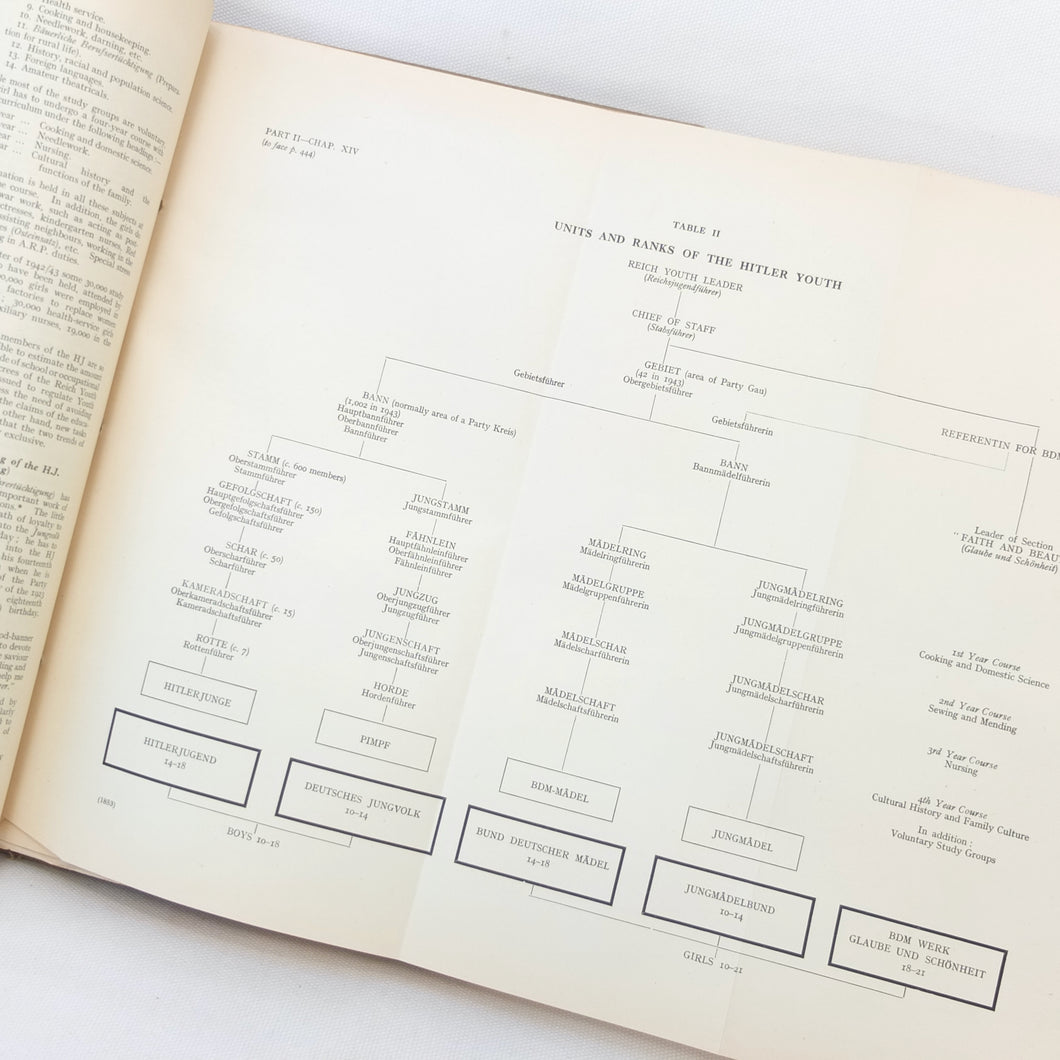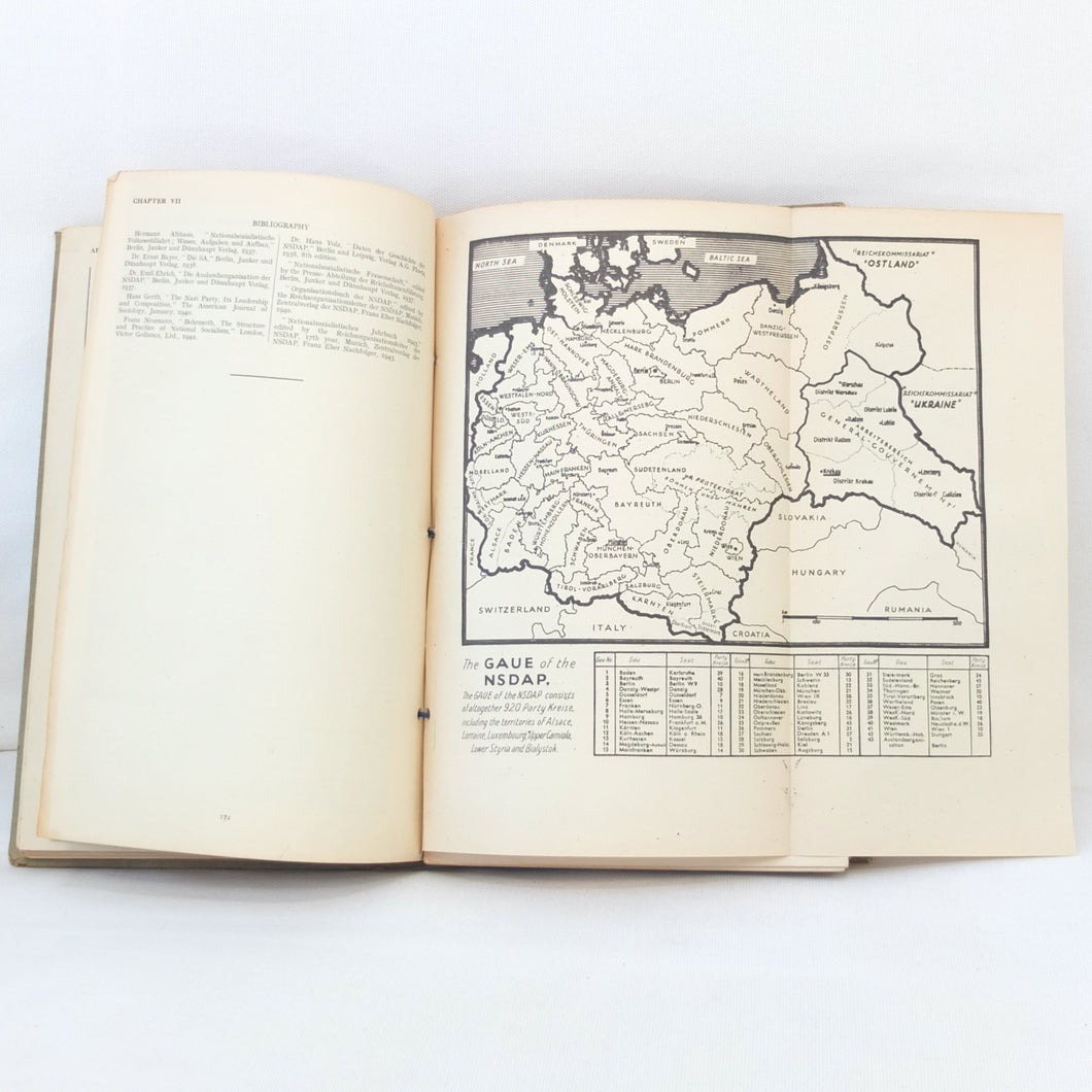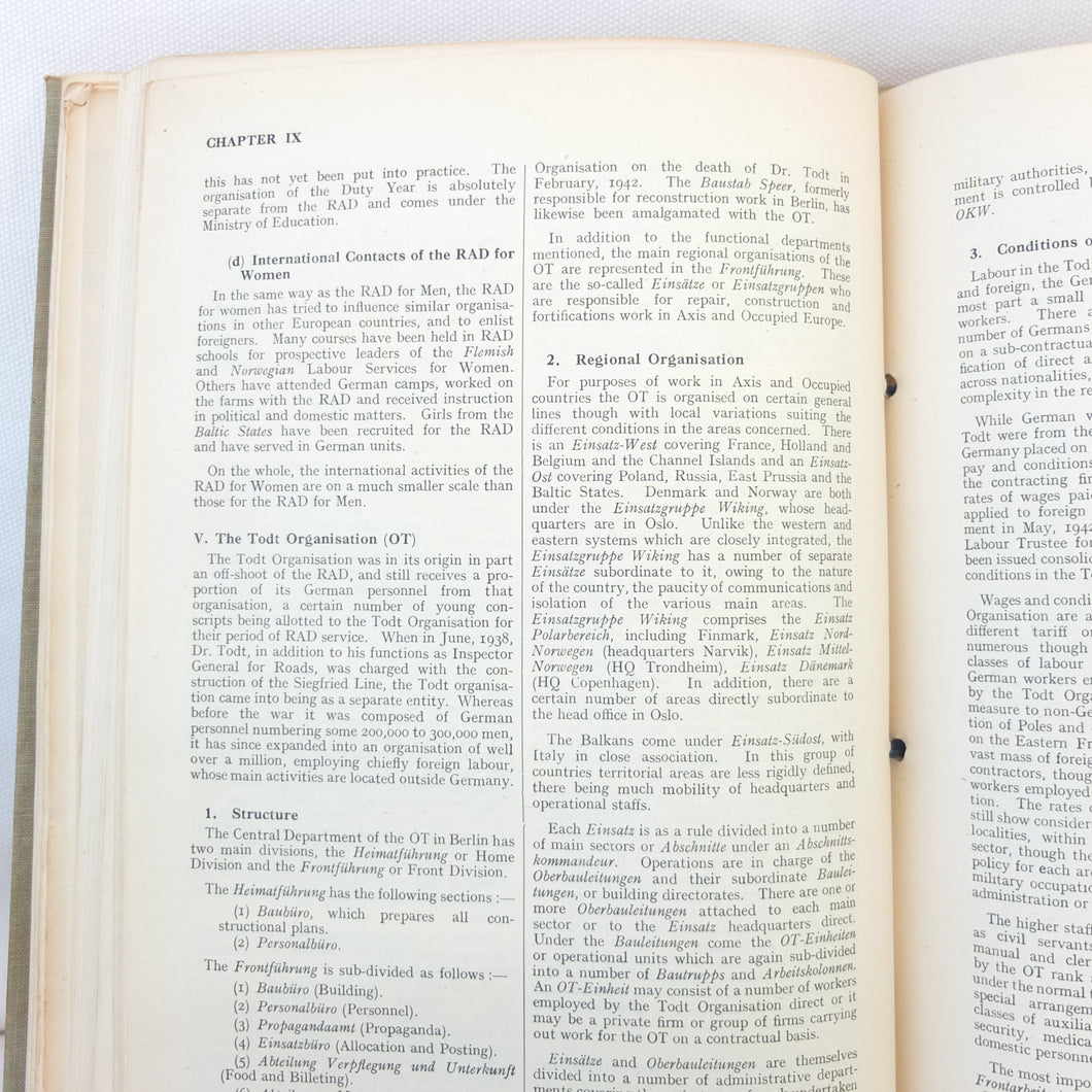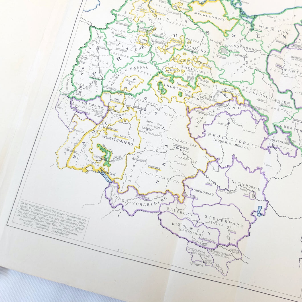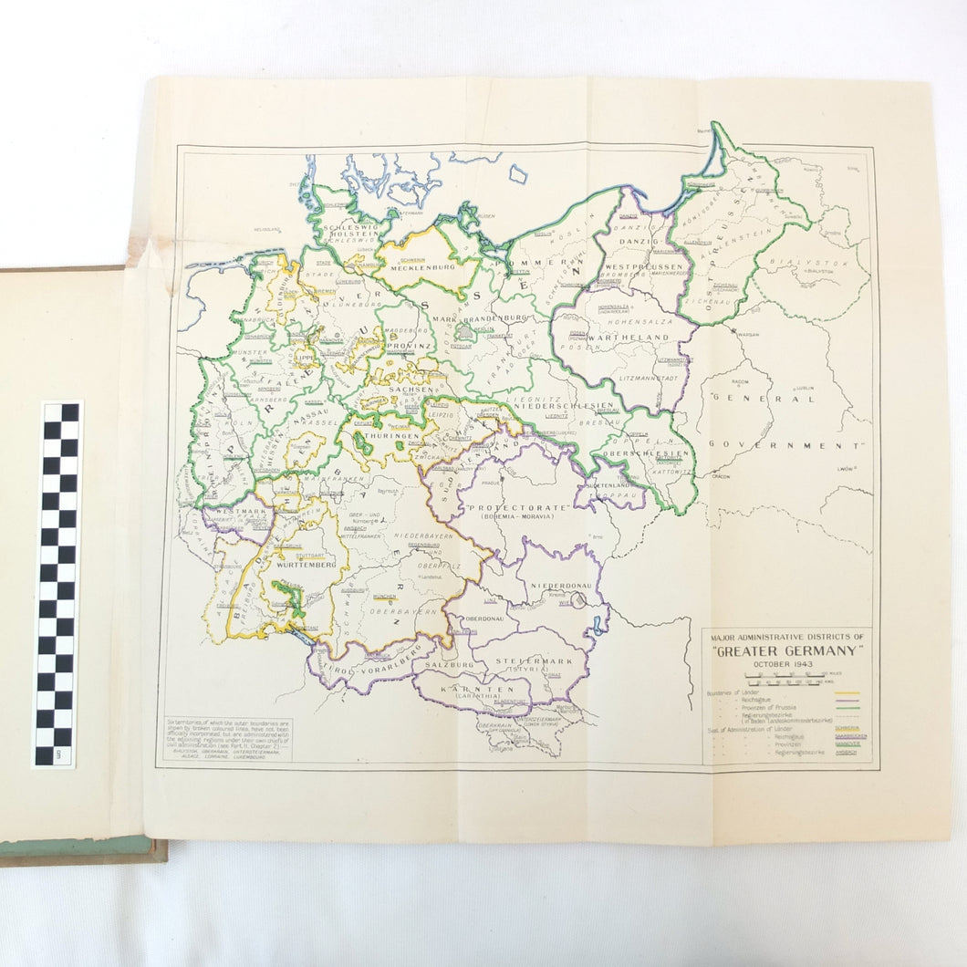 The list of subjects covered is wide ranging and detailed, and is illustrated with maps, fold-outs and charts. There are chapters on: Central Government and Administration, Regional Government, Local Government, German Fiscal System, German Legal System, Police and Security (Including the SS), Concentration Camps, Nazi Party and Organisations, Civil Defence, Labour Organisations, Public Health, Social Insurance and Winter Help, Press and Propaganda, Education, Youth, Civil Service, and Religions. There is also a glossary, and five Annexes covering Legal issues, Political Affiliations of German Industry, the Jewish Community, Occupation of the Rhineland, and Adminsitrative Controls. There is a map section at the rear which should include 7 maps, but only one is present - No. 4 ‘Major Administrative Districts of Greater Germany, 1943’.