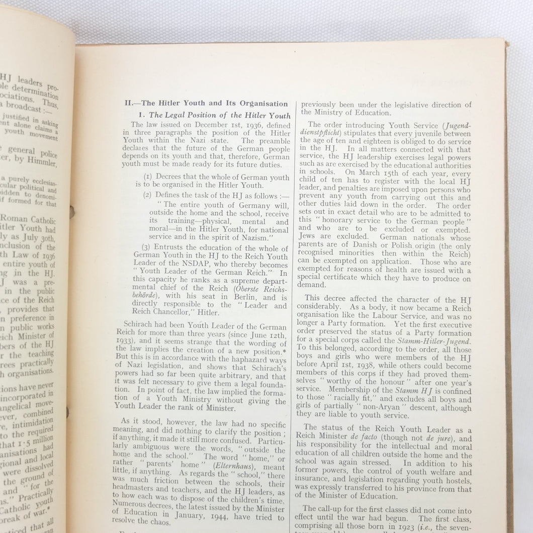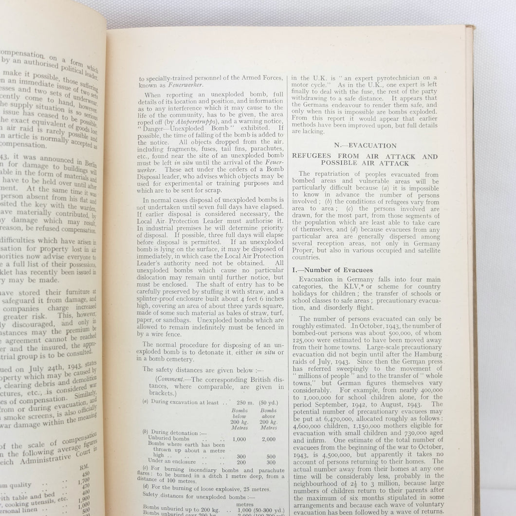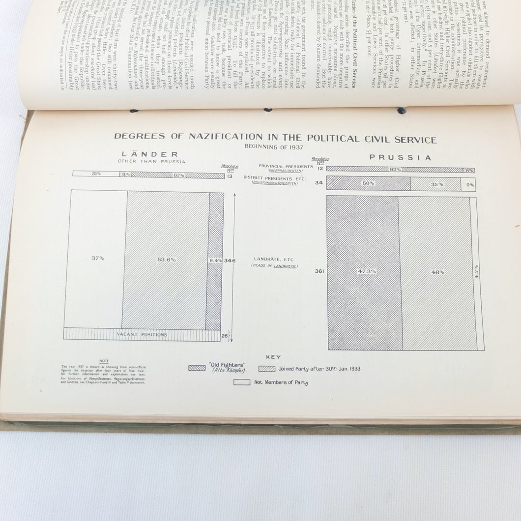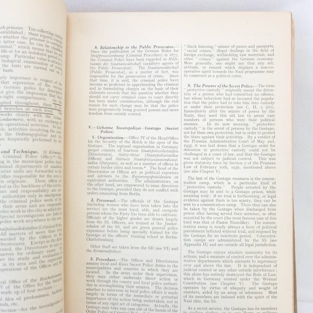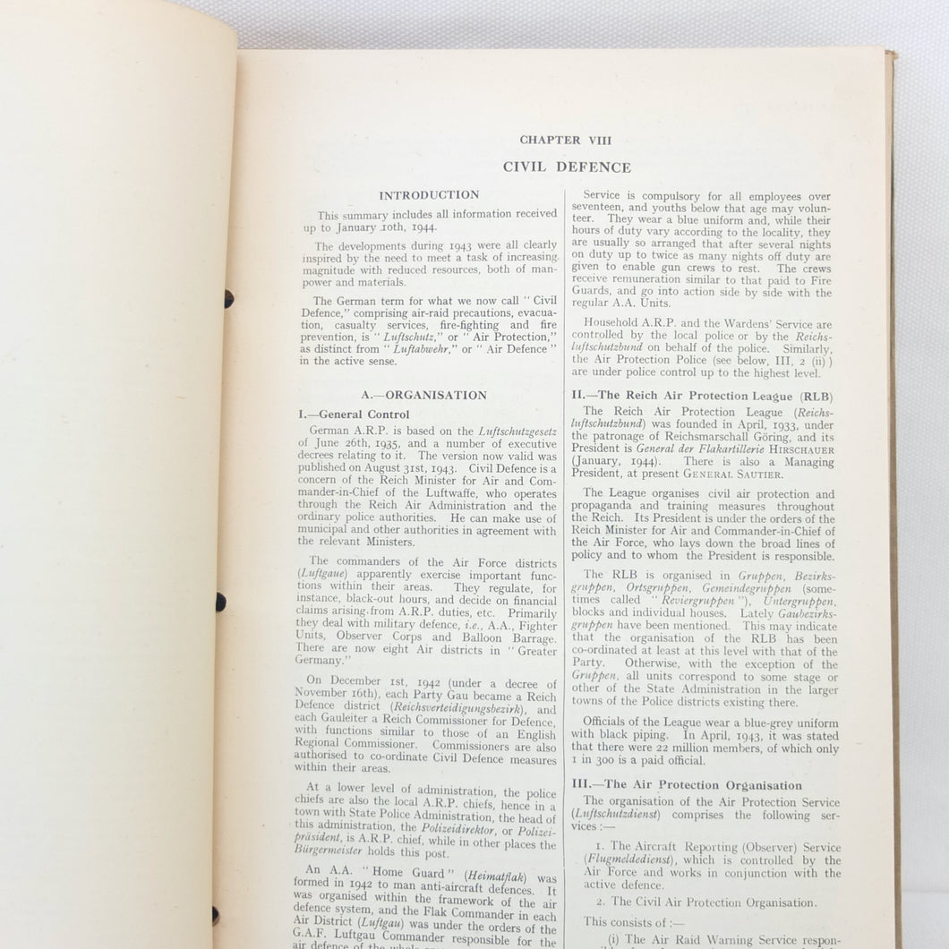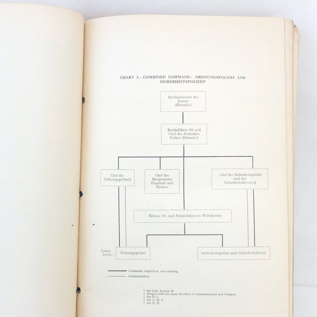 The list of subjects covered is wide ranging and detailed, and is illustrated with maps, fold-outs and charts. There are chapters on: Central Government and Administration, Regional Government, Local Government, German Fiscal System, German Legal System, Police and Security (Including the SS), Concentration Camps, Nazi Party and Organisations, Civil Defence, Labour Organisations, Public Health, Social Insurance and Winter Help, Press and Propaganda, Education, Youth, Civil Service, and Religions. There is also a glossary, and five Annexes covering Legal issues, Political Affiliations of German Industry, the Jewish Community, Occupation of the Rhineland, and Adminsitrative Controls. There is a map section at the rear which should include 7 maps, but only one is present - No. 4 ‘Major Administrative Districts of Greater Germany, 1943’.