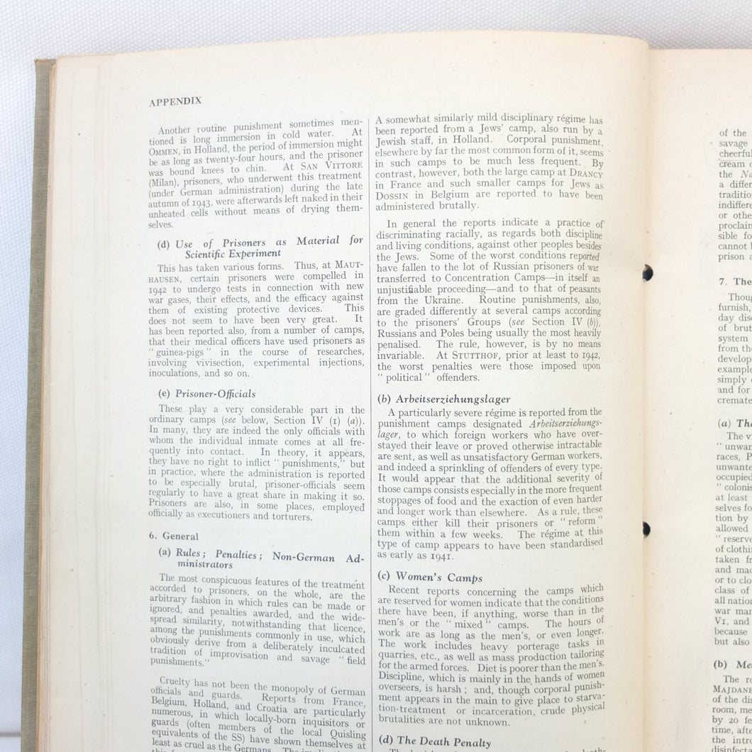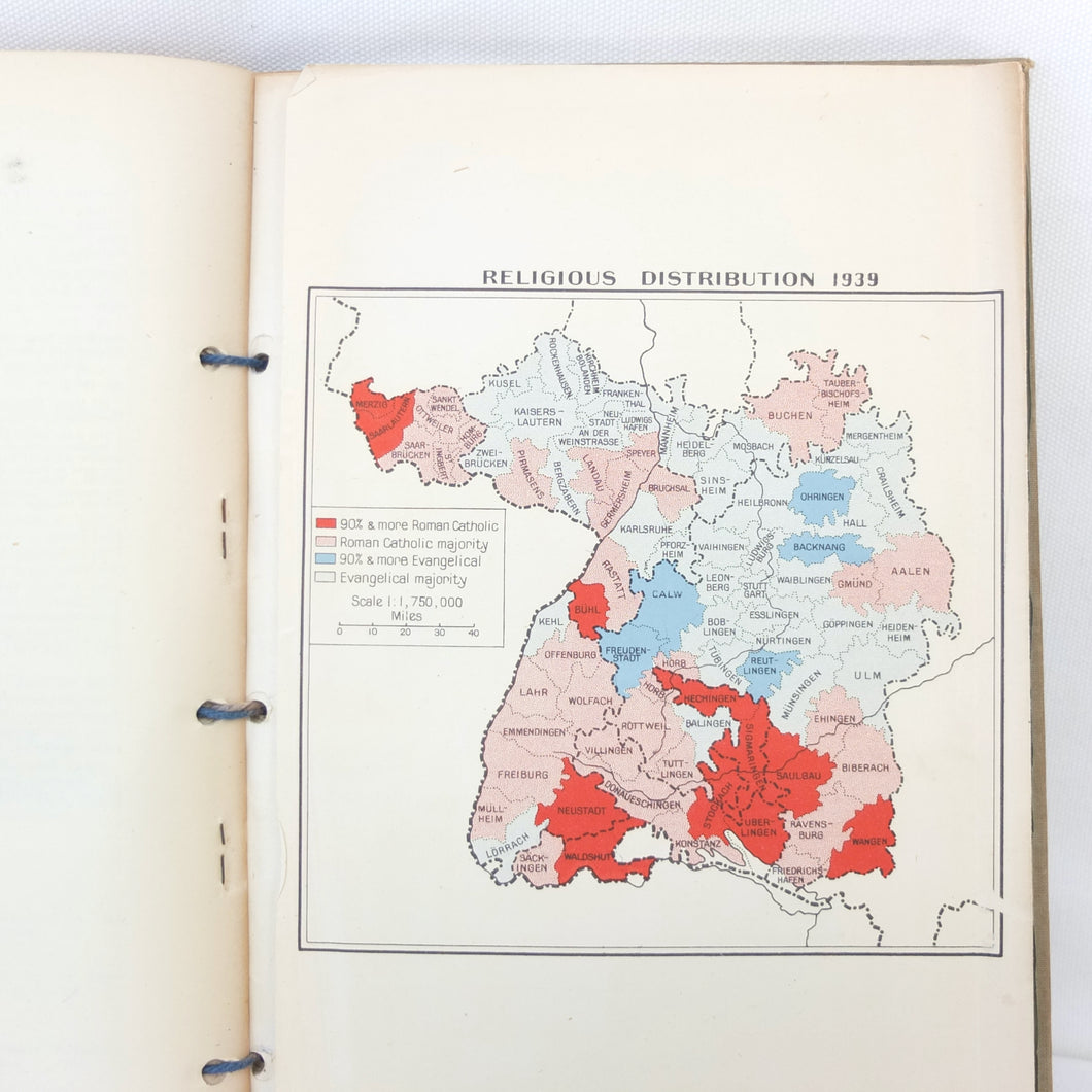 In very good condition. The hardback binder boards are in good condition, with general signs of wear and use, and some marks. The laced binding is good and secure. The text, illustrations, and maps are in very good condition, with a few marks, some occasional underlining in red ink, some minor wear and a some small archival paper tape repairs. All but one map (No. 4 ‘Major Administrative Districts of Greater Germany, 1943') of the seven maps listed in the contents of the separate map section at the rear are missing.