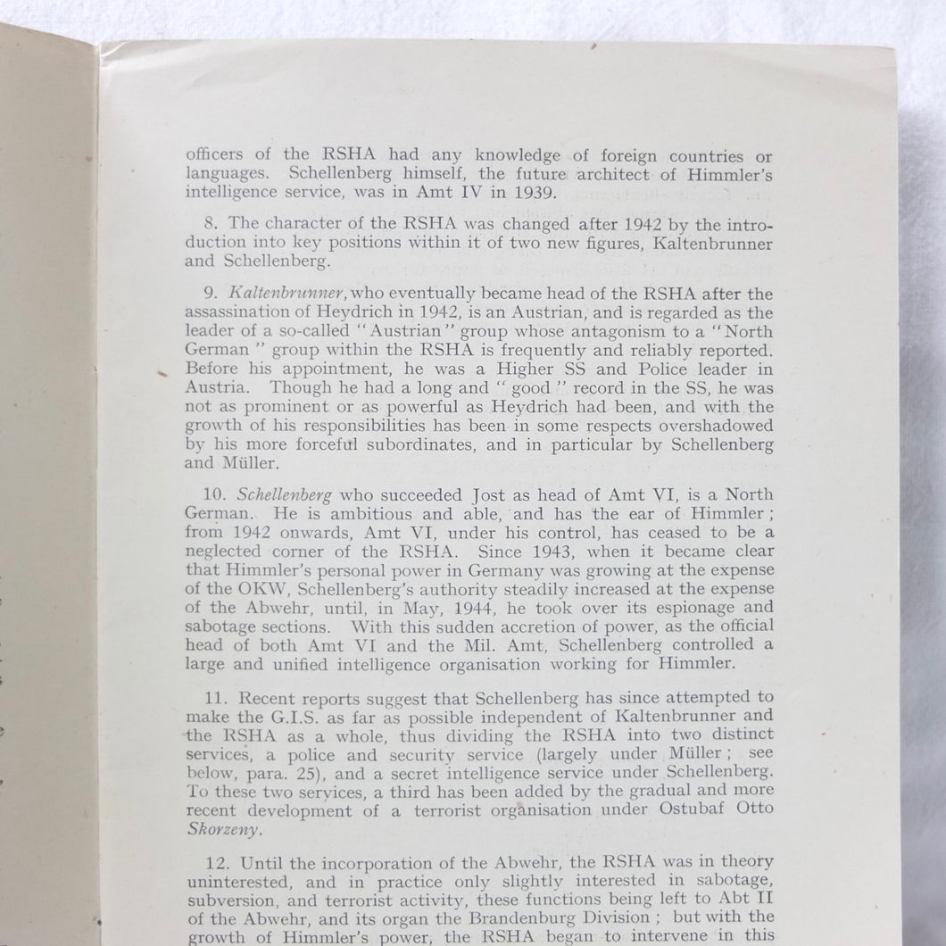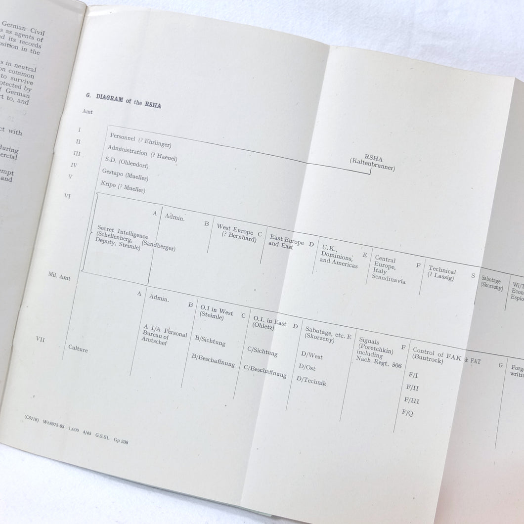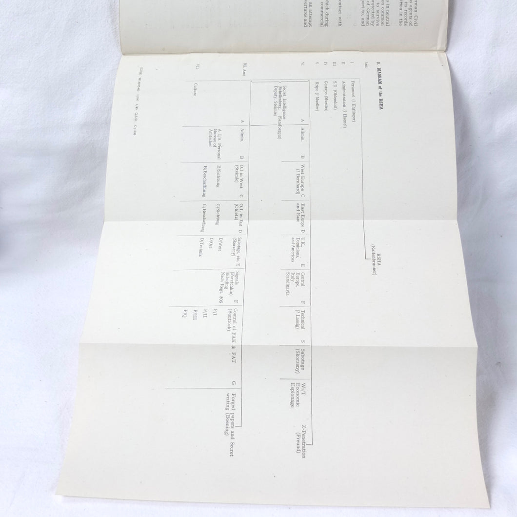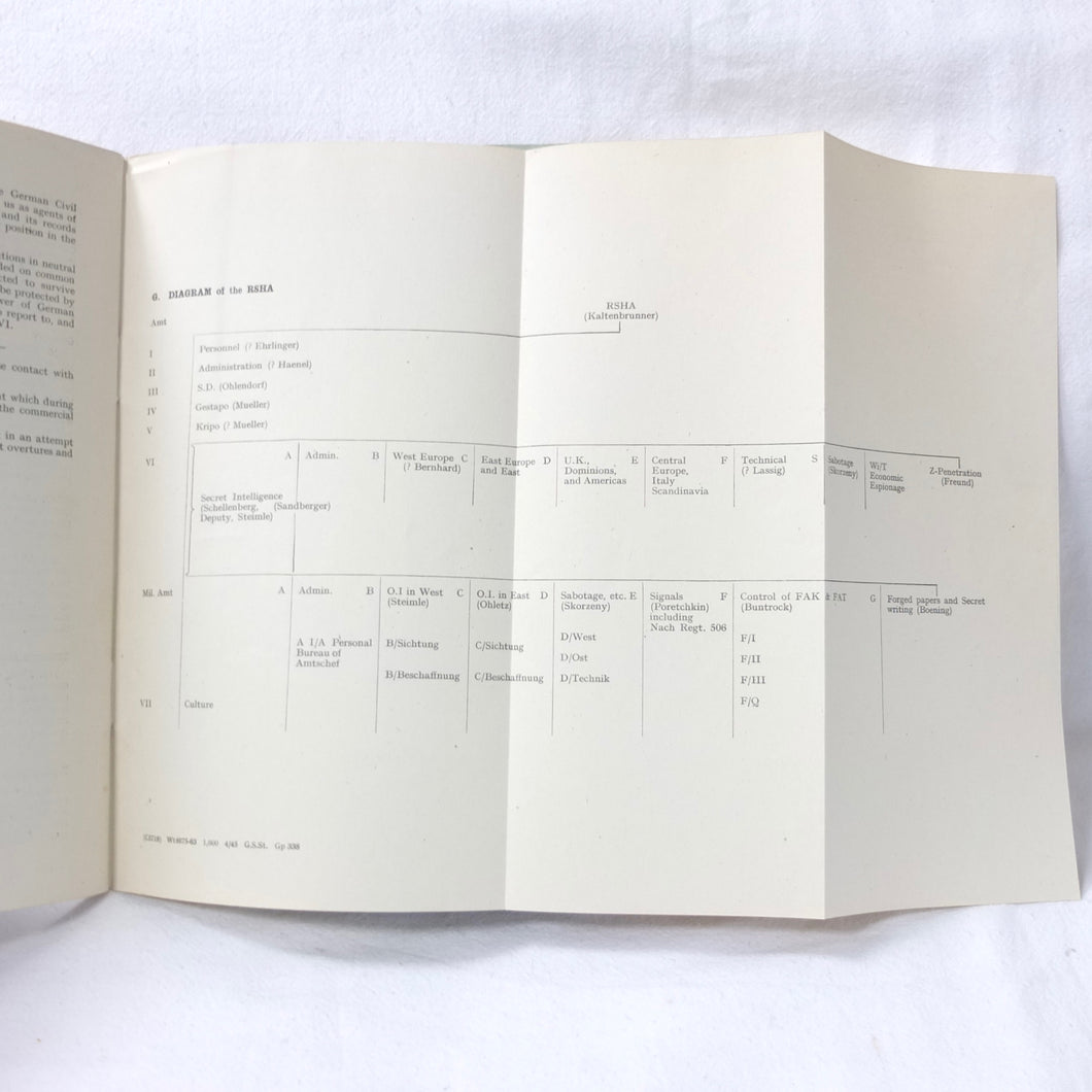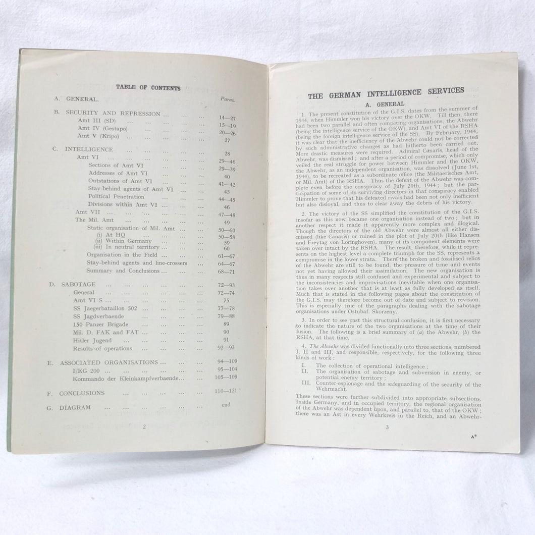 The German Intelligence Service provides an overview of the Third Reich's intelligence services. It would have been based on the work of M.I. 14, the British wartime department that specialised in intelligence about Germany. Also known as 'Section 14', M.I. 14 was a department of the British Directorate of Military Intelligence. M.I. 14 was closely associated with M.I.R.S. (Military Intelligence Research Section) which was a joint Anglo-American agency with offices in Washington DC and London, founded in 1943 under the supervision of M.I. 14 and G-2 (Counter Intelligence).