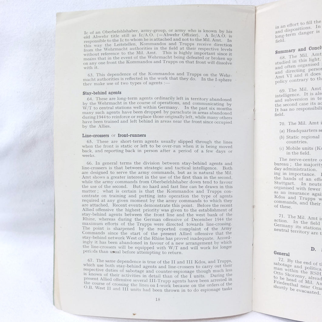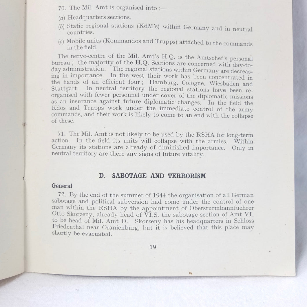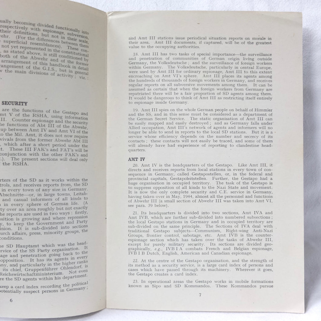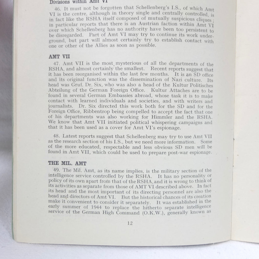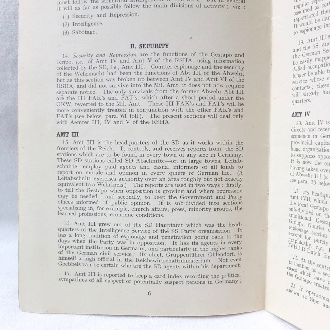 The German Intelligence Service provides an overview of the Third Reich's intelligence services. It would have been based on the work of M.I. 14, the British wartime department that specialised in intelligence about Germany. Also known as 'Section 14', M.I. 14 was a department of the British Directorate of Military Intelligence. M.I. 14 was closely associated with M.I.R.S. (Military Intelligence Research Section) which was a joint Anglo-American agency with offices in Washington DC and London, founded in 1943 under the supervision of M.I. 14 and G-2 (Counter Intelligence).