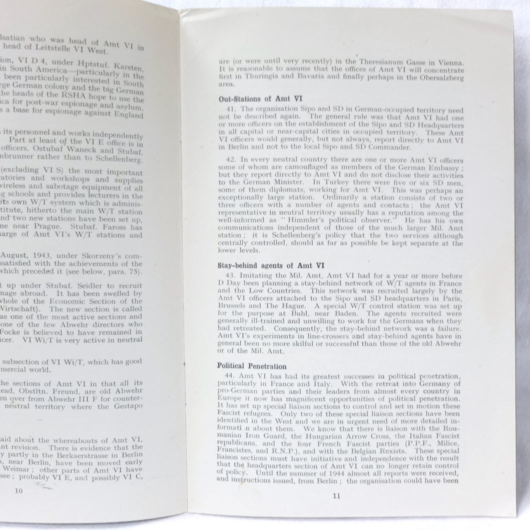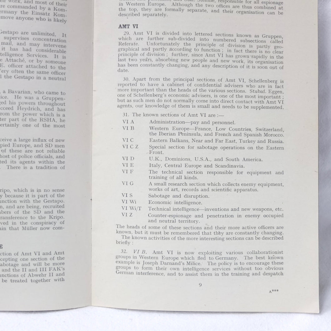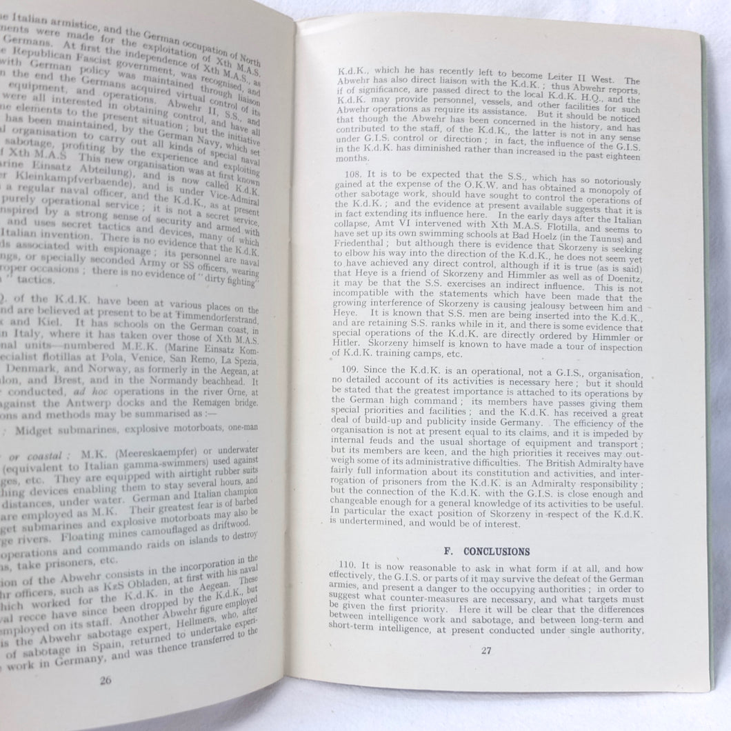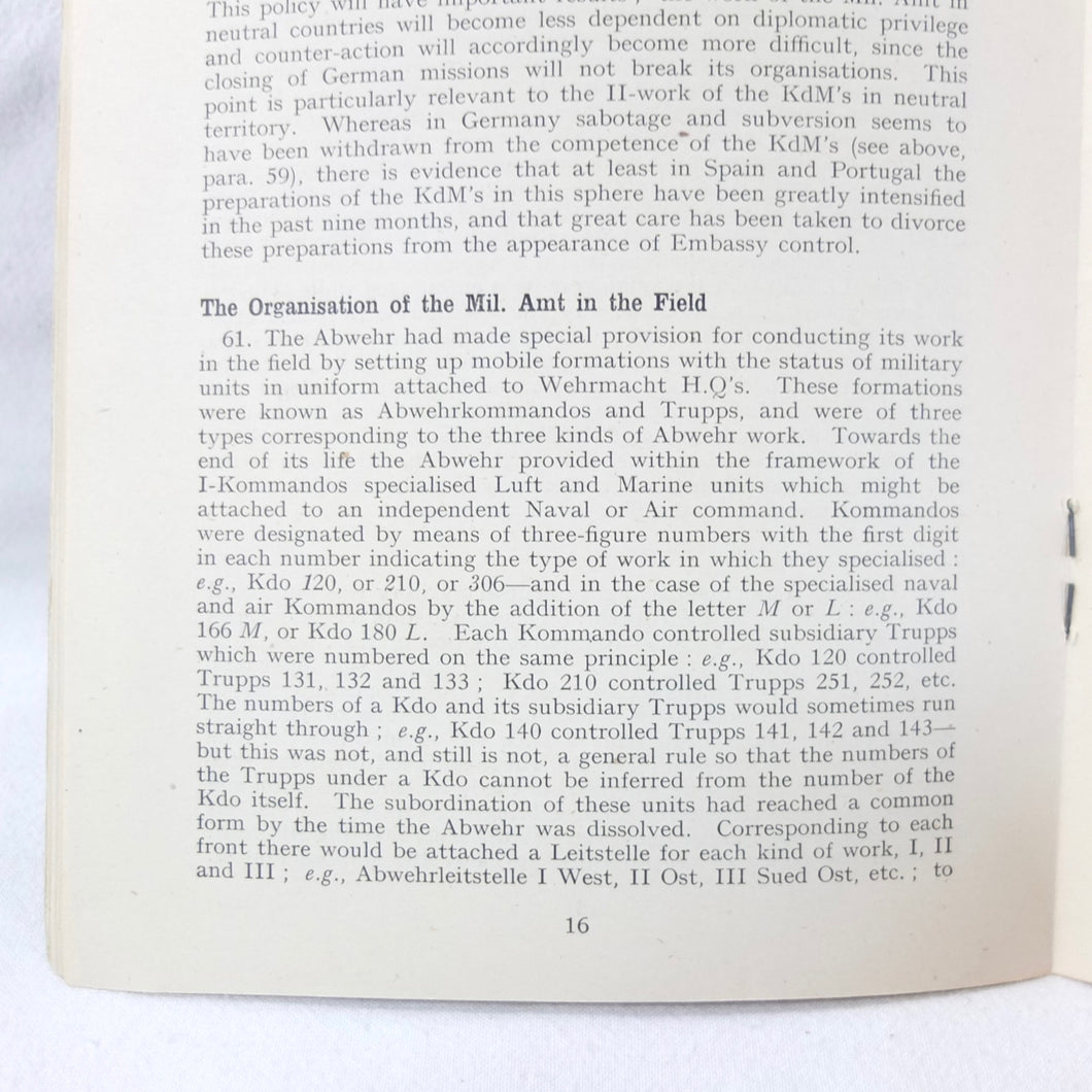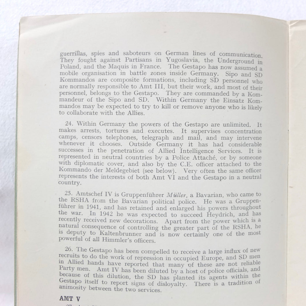 The German Intelligence Service provides an overview of the Third Reich's intelligence services. It would have been based on the work of M.I. 14, the British wartime department that specialised in intelligence about Germany. Also known as 'Section 14', M.I. 14 was a department of the British Directorate of Military Intelligence. M.I. 14 was closely associated with M.I.R.S. (Military Intelligence Research Section) which was a joint Anglo-American agency with offices in Washington DC and London, founded in 1943 under the supervision of M.I. 14 and G-2 (Counter Intelligence).