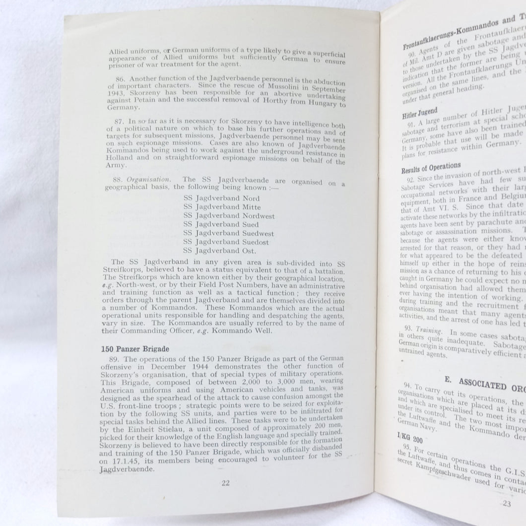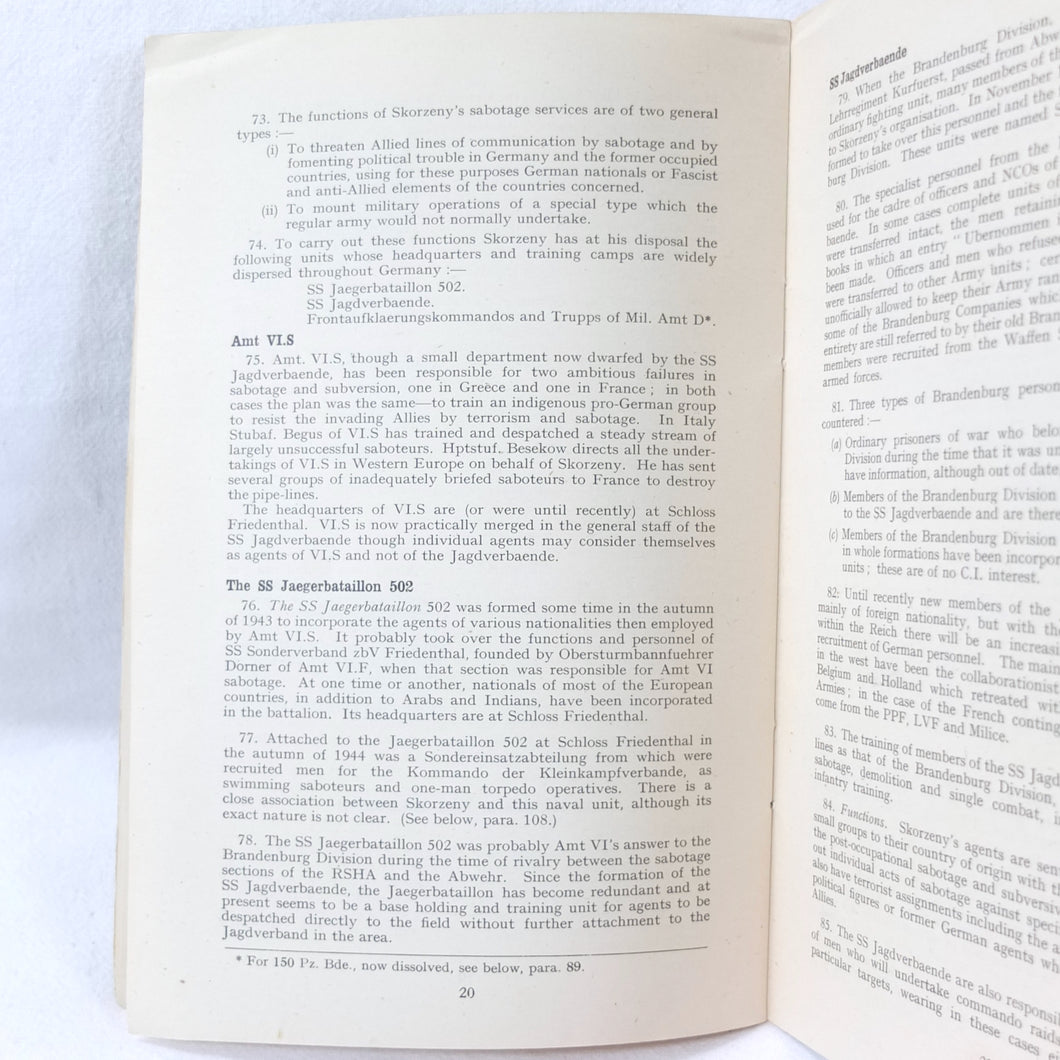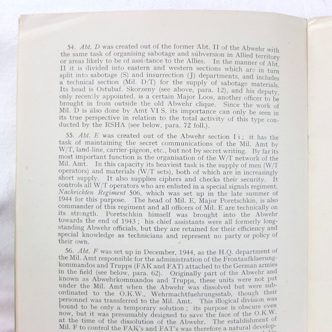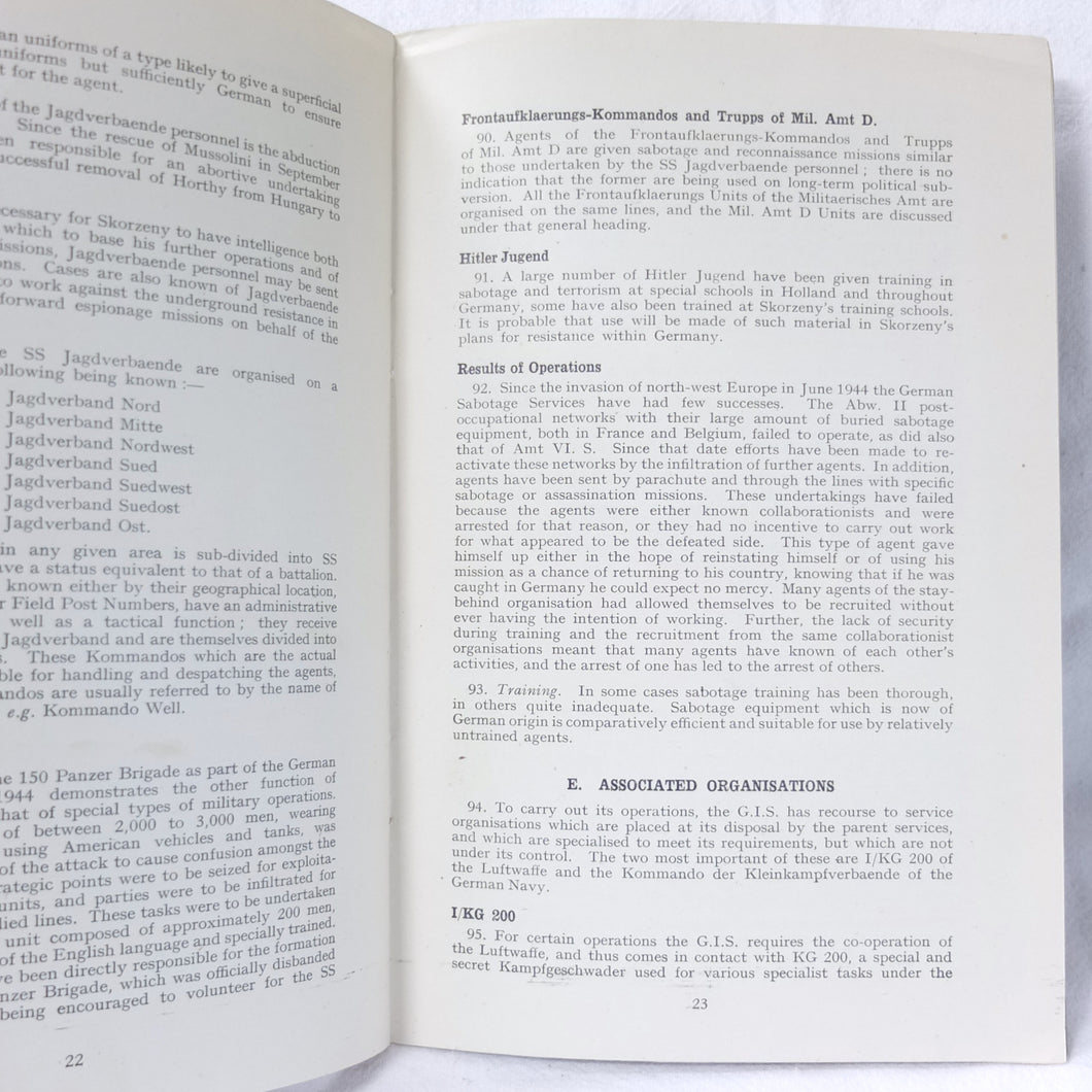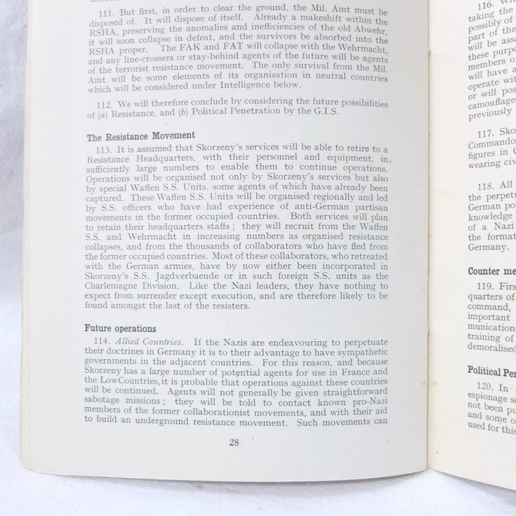 The German Intelligence Service provides an overview of the Third Reich's intelligence services. It would have been based on the work of M.I. 14, the British wartime department that specialised in intelligence about Germany. Also known as 'Section 14', M.I. 14 was a department of the British Directorate of Military Intelligence. M.I. 14 was closely associated with M.I.R.S. (Military Intelligence Research Section) which was a joint Anglo-American agency with offices in Washington DC and London, founded in 1943 under the supervision of M.I. 14 and G-2 (Counter Intelligence).