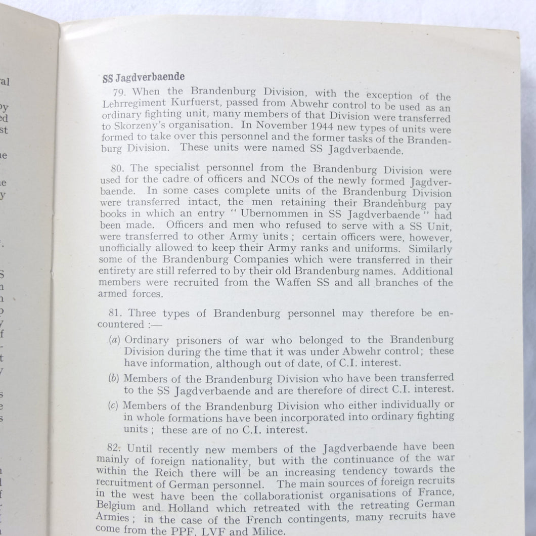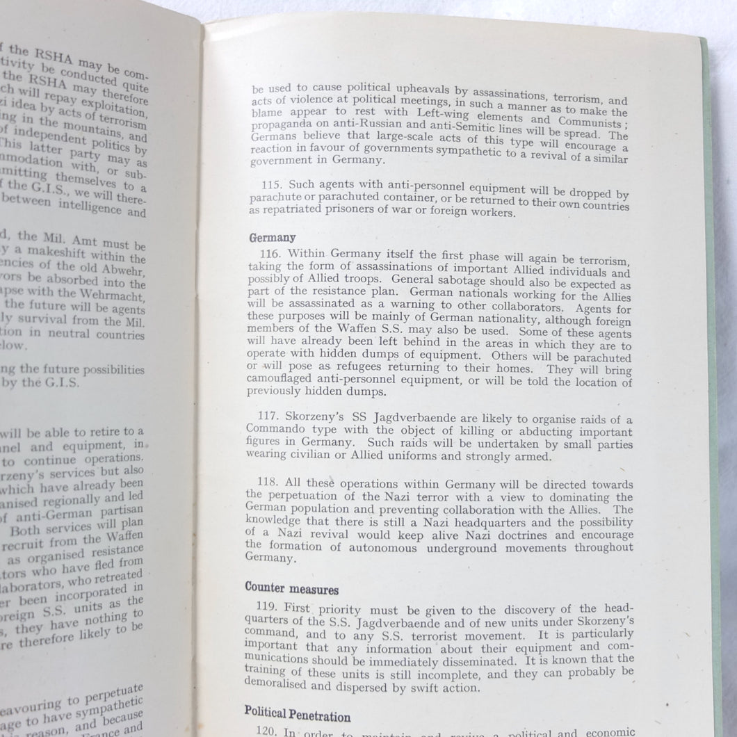 A very rare, original, WW2 Supreme Allied Forces HQ Counter-Intelligence Handbook, marked ‘Secret’, and produced by S.H.A.E.F. in April 1945. It was a document with a very restricted circulation, with only 1,000 copies printed, intended to be used by Allied intelligence officers serving in North Western Europe, in particular by those entering Germany during the final months of the war, in preparation for the impending defeat of Nazi Germany. It would have been a vital source of information on the German Intelligence Service.