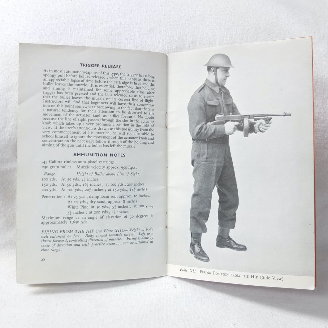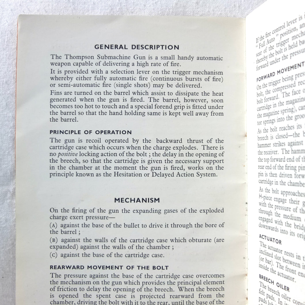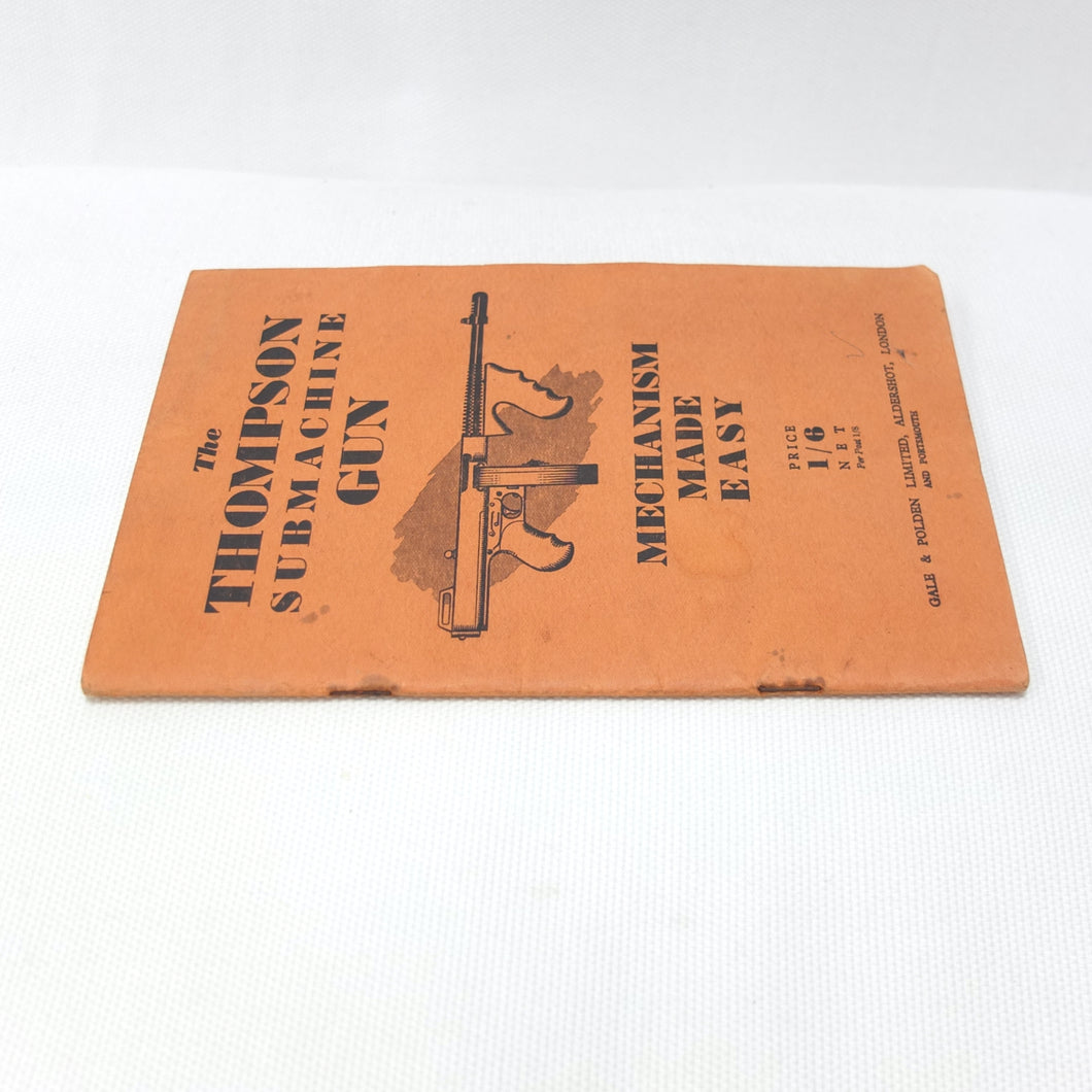 An original WW2 Thompson Submachine Gun handbook, published c.1940. Although undated, it was published during WW2, before the revised edition of 1942 which had slightly different photographs. The book is a detailed guide to the handling and maintenance of the 'Tommy Gun' as used by the allied armies during WW2. Full of fascinating information and fully illustrated with photographs of the Thompson and its mechanism, this book is an excellent introduction to the workings and use of the Thompson Submachine gun.