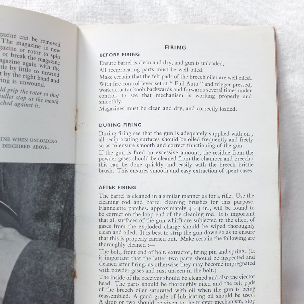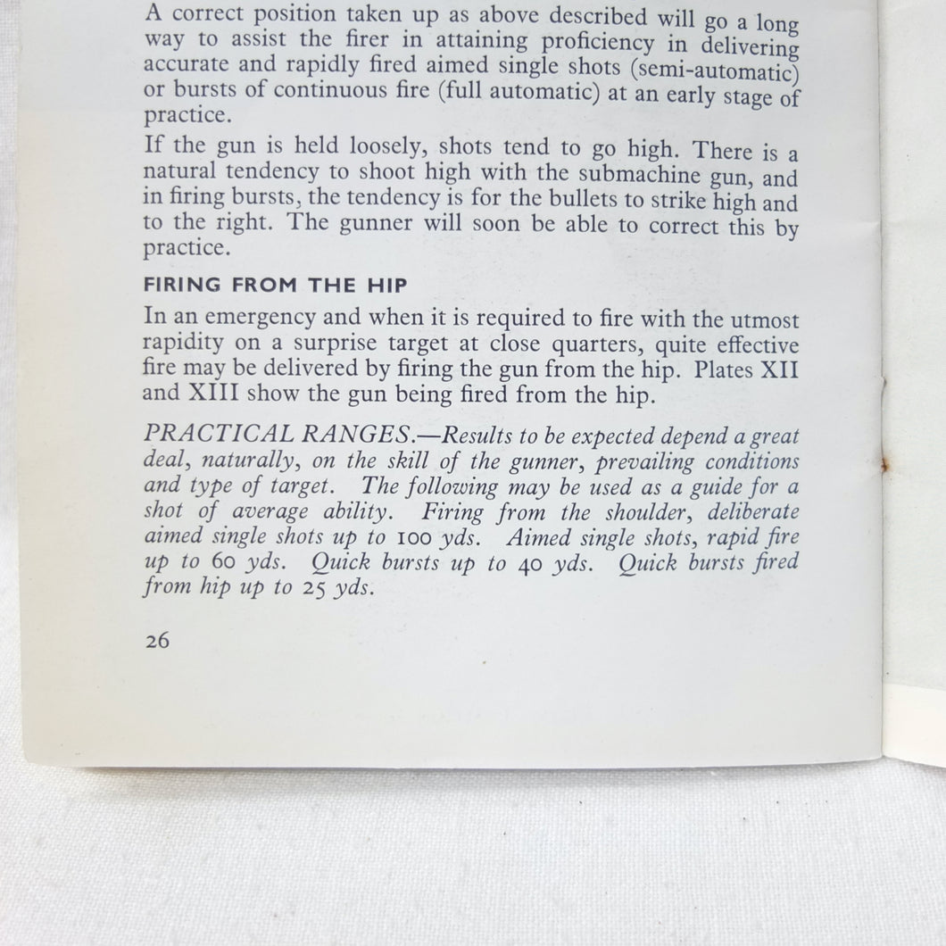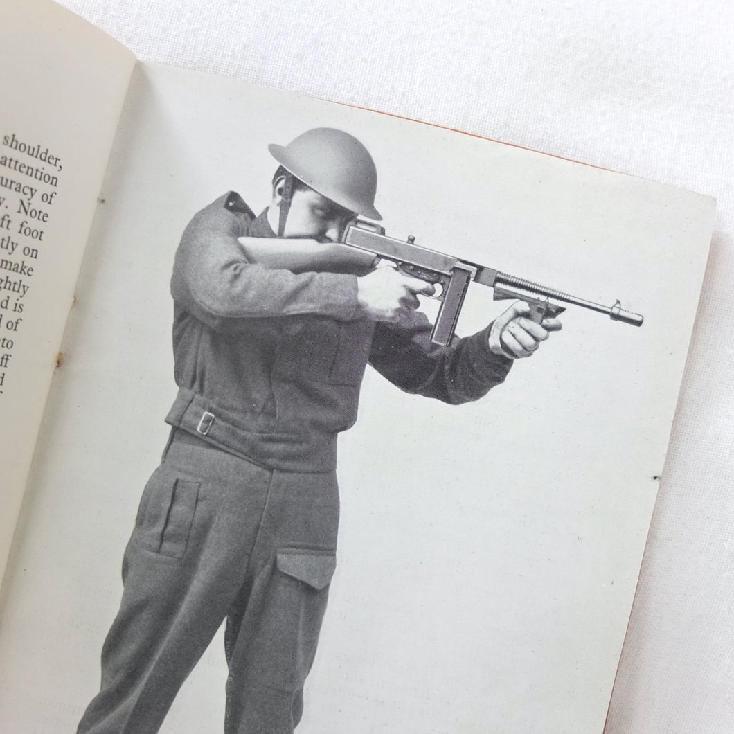 An original WW2 Thompson Submachine Gun handbook, published c.1940. Although undated, it was published during WW2, before the revised edition of 1942 which had slightly different photographs. The book is a detailed guide to the handling and maintenance of the 'Tommy Gun' as used by the allied armies during WW2. Full of fascinating information and fully illustrated with photographs of the Thompson and its mechanism, this book is an excellent introduction to the workings and use of the Thompson Submachine gun.