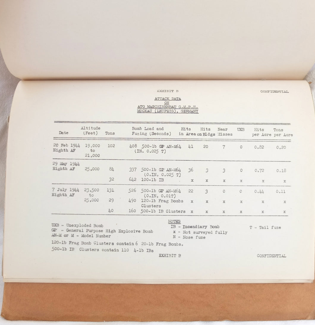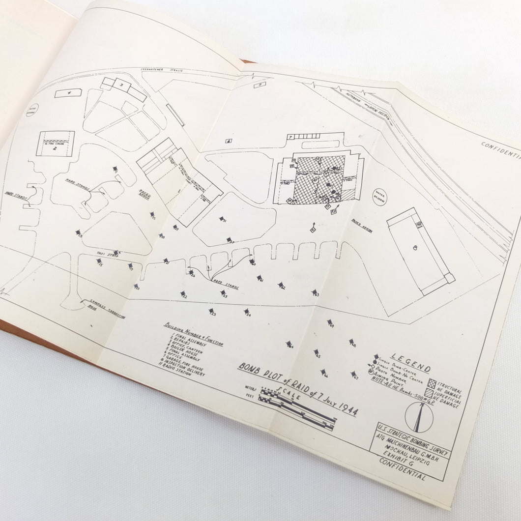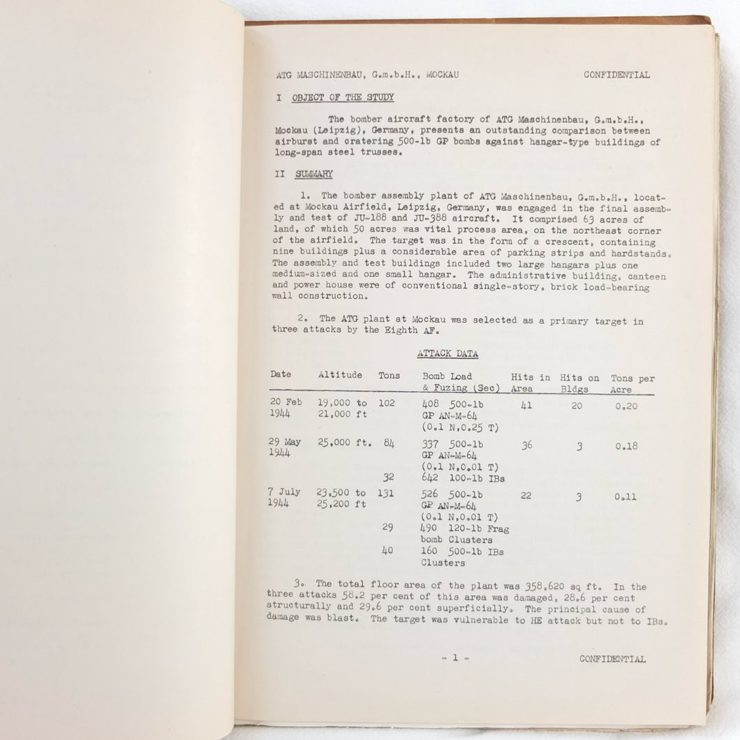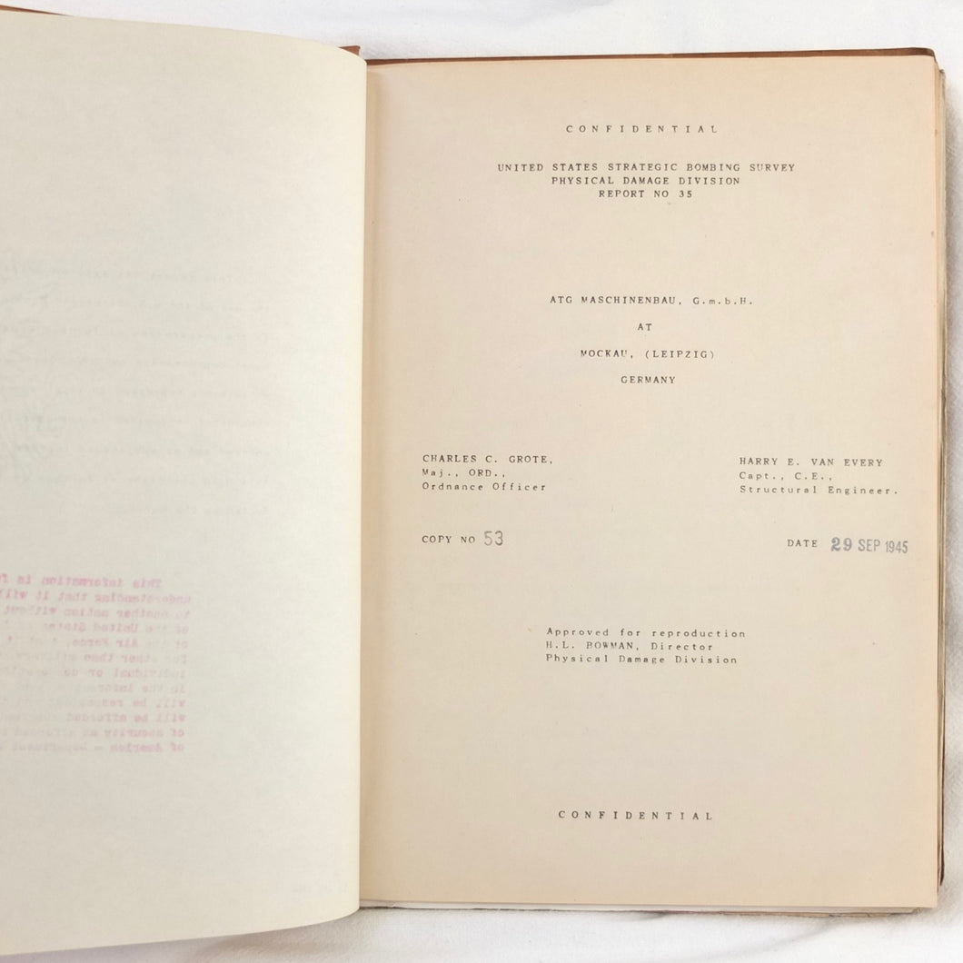 A rare original WW2 U.S. Strategic Bombing Survey damage assessment report on A.T.G. Maschinenbau G.m.b.H., at Mockau airfield, near Leipzig, Germany. The report was produced in September 1945, and records the effects of the 8th Air Force raids in February, May and July 1944. A confidential document, it was issued with a restricted circulation, each copy individually numbered. This is copy number 53. The report is well illustrated with plans, photographs and diagrams, showing the results of the raids on the ATG Maschinenbau Mockau plant.