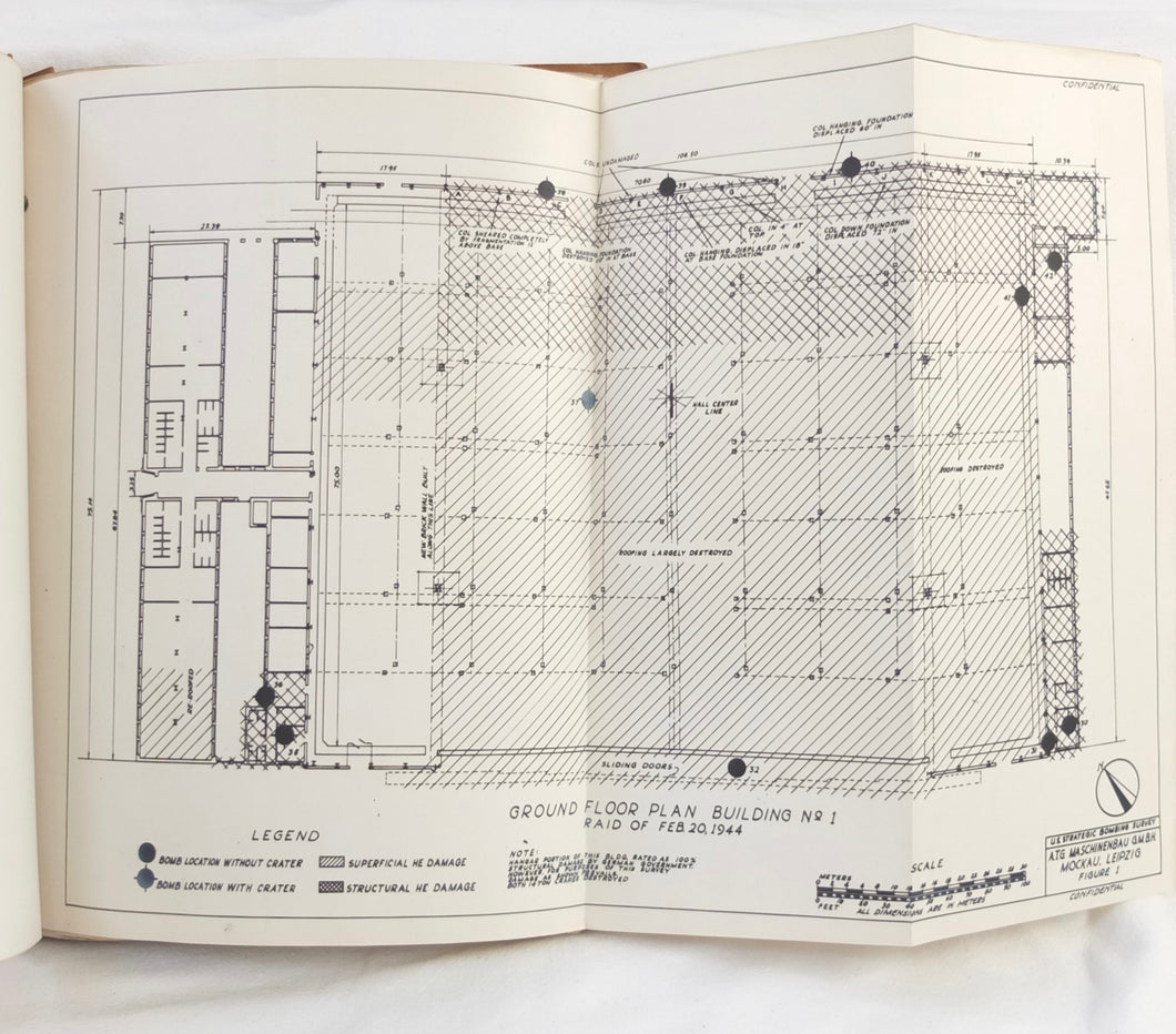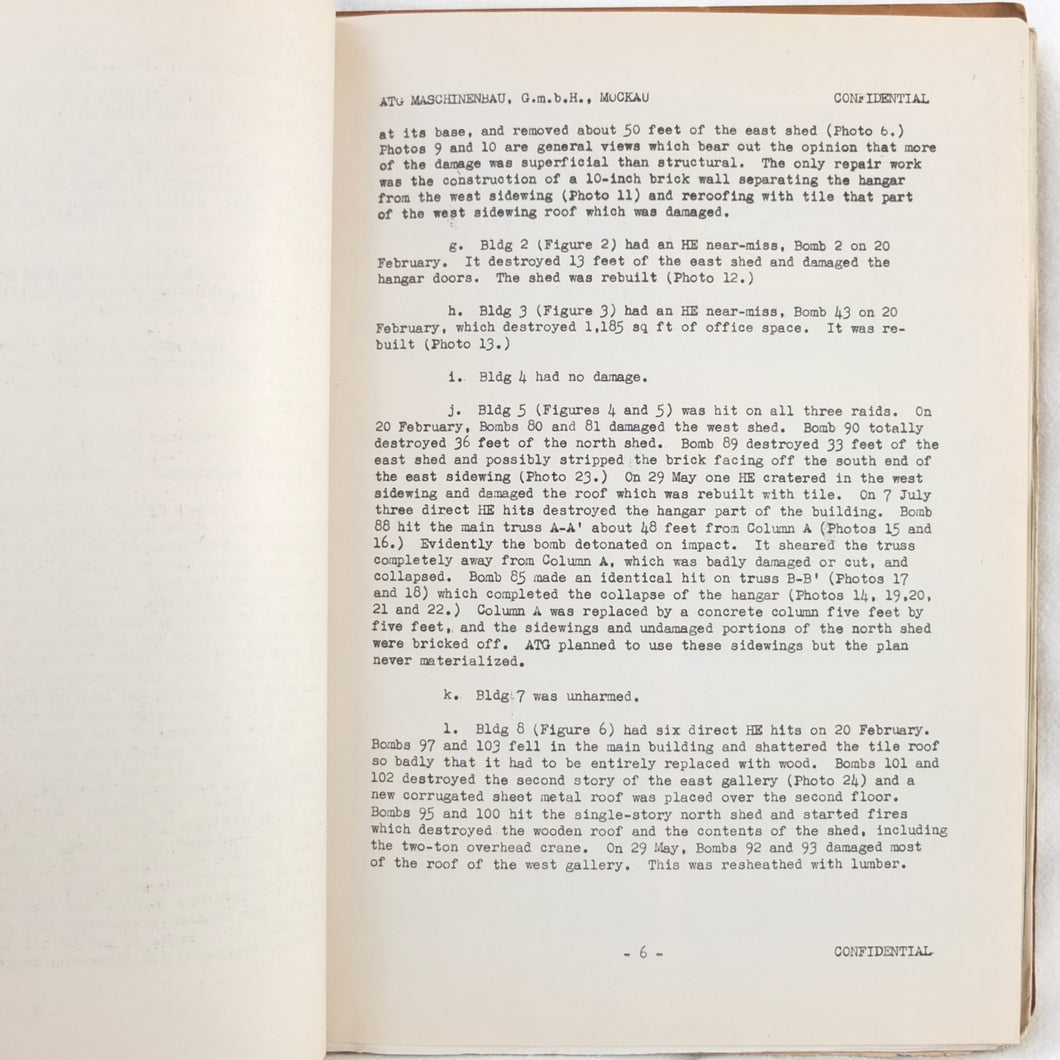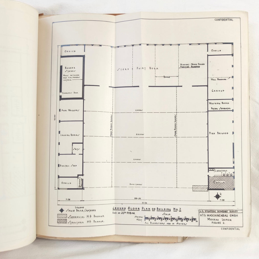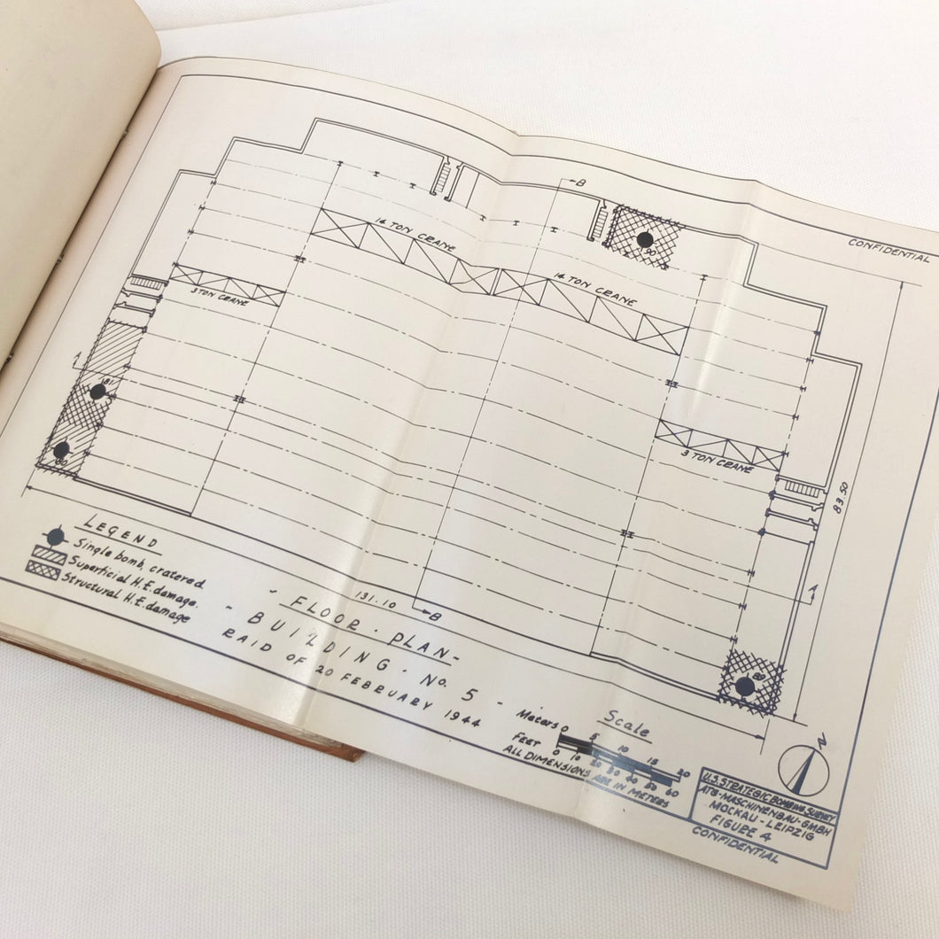 A rare original WW2 U.S. Strategic Bombing Survey damage assessment report on A.T.G. Maschinenbau G.m.b.H., at Mockau airfield, near Leipzig, Germany. The report was produced in September 1945, and records the effects of the 8th Air Force raids in February, May and July 1944. A confidential document, it was issued with a restricted circulation, each copy individually numbered. This is copy number 53. The report is well illustrated with plans, photographs and diagrams, showing the results of the raids on the ATG Maschinenbau Mockau plant.