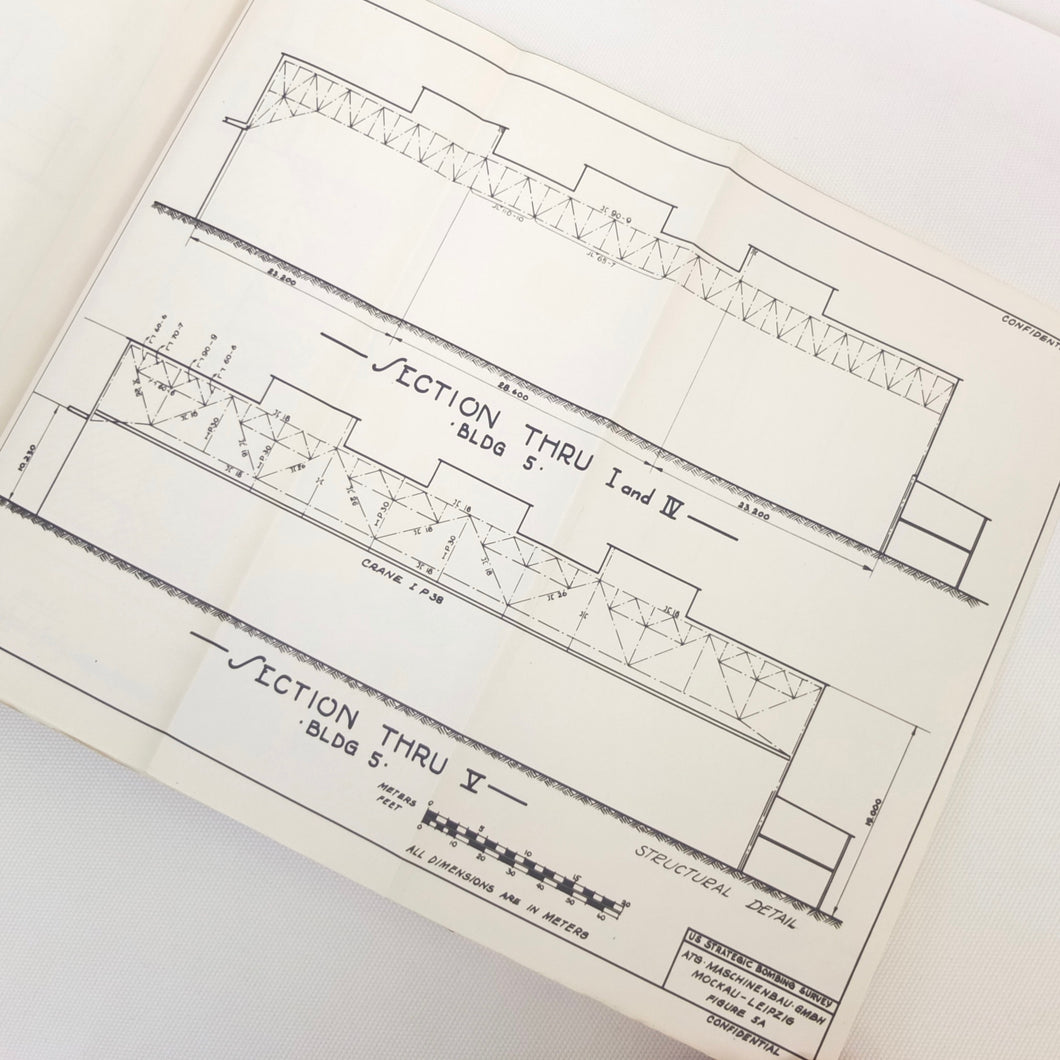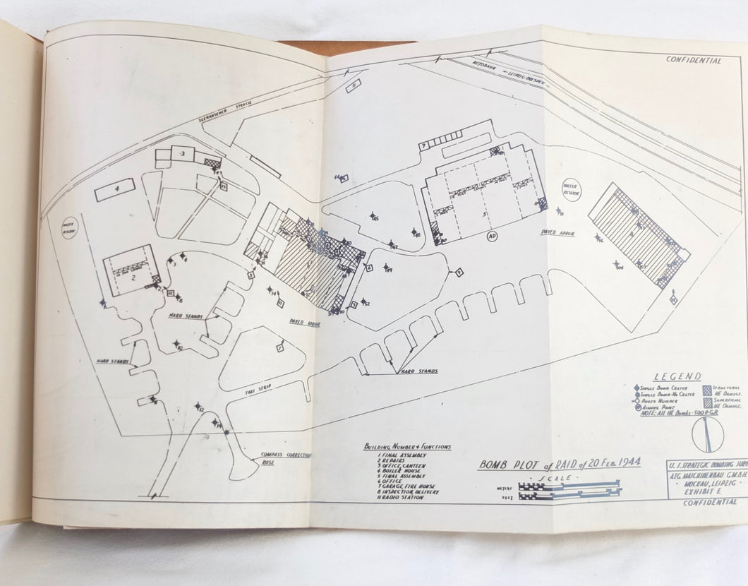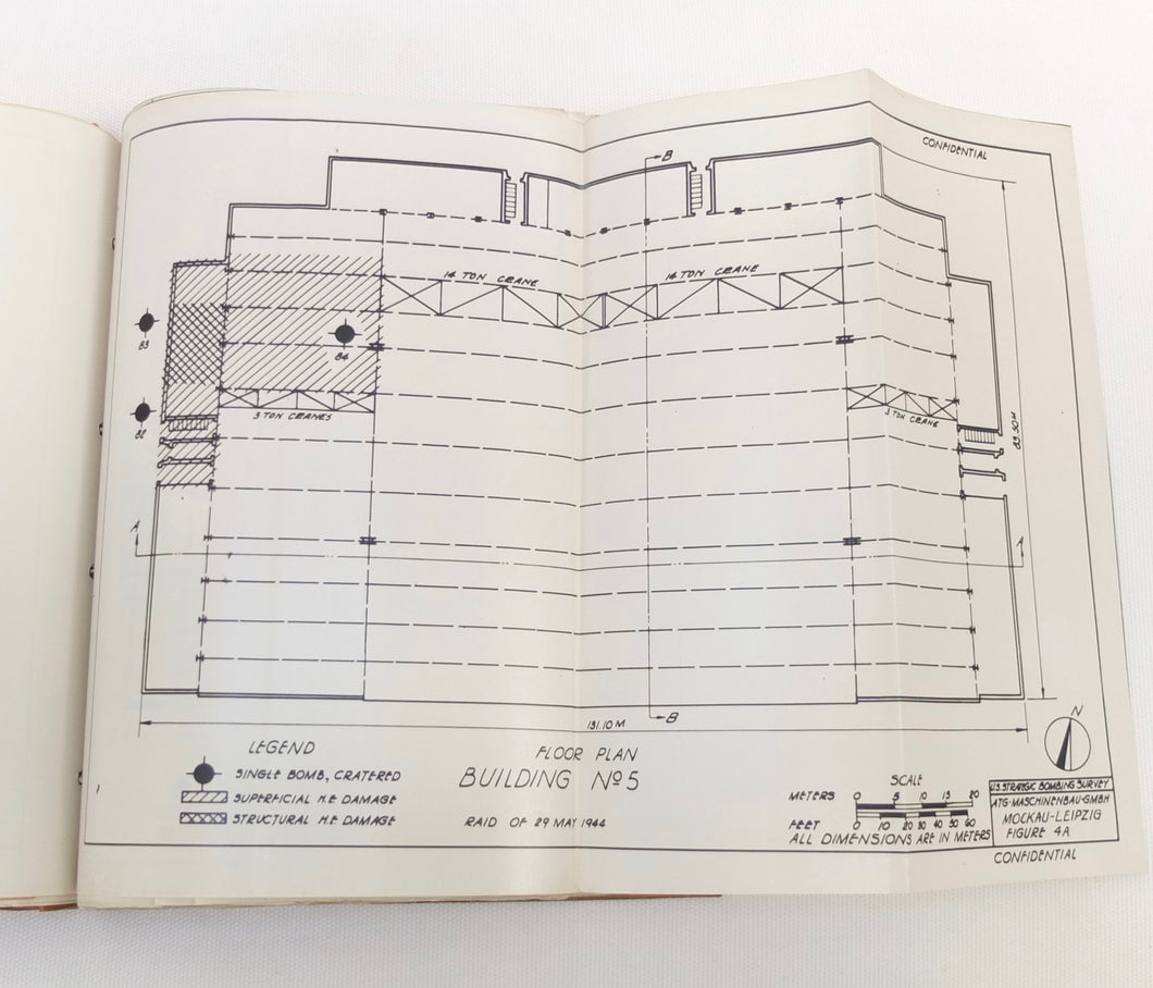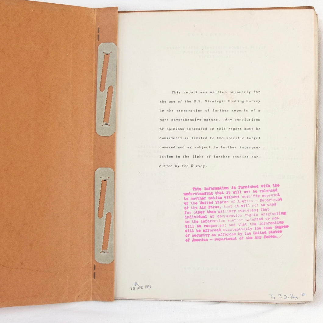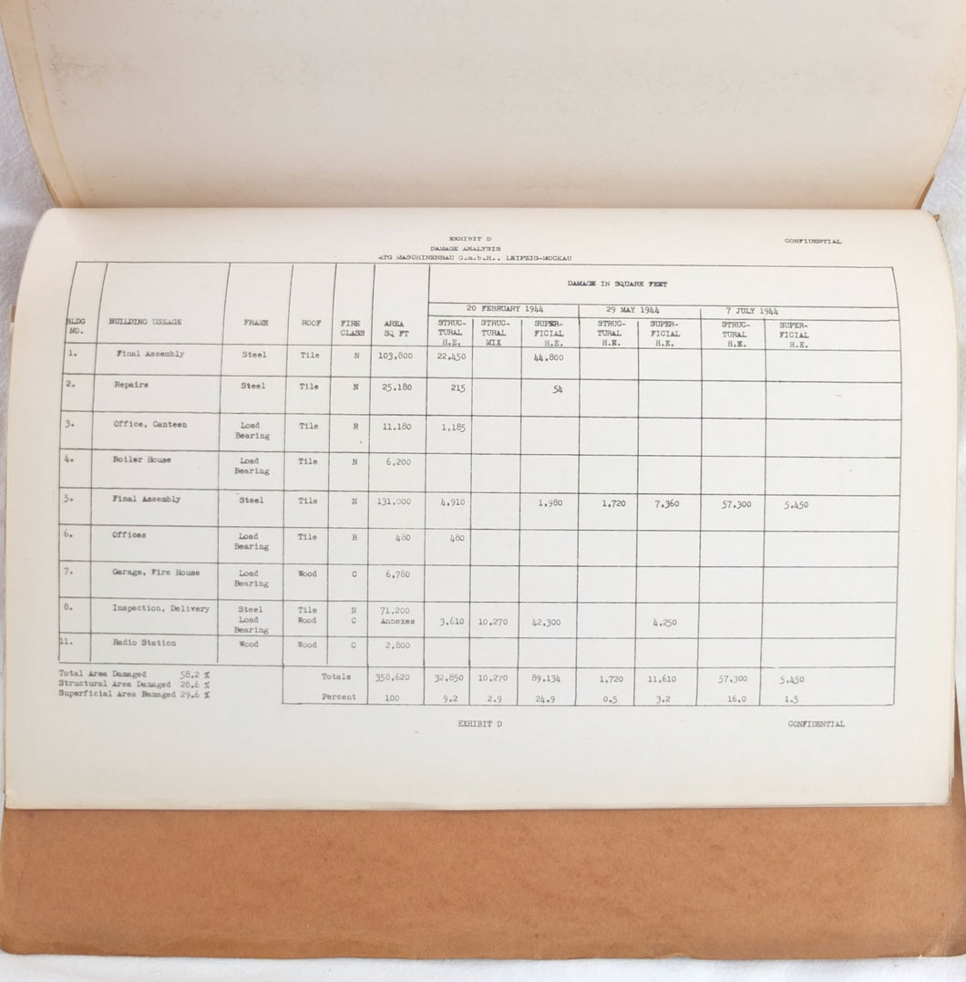 A rare original WW2 U.S. Strategic Bombing Survey damage assessment report on A.T.G. Maschinenbau G.m.b.H., at Mockau airfield, near Leipzig, Germany. The report was produced in September 1945, and records the effects of the 8th Air Force raids in February, May and July 1944. A confidential document, it was issued with a restricted circulation, each copy individually numbered. This is copy number 53. The report is well illustrated with plans, photographs and diagrams, showing the results of the raids on the ATG Maschinenbau Mockau plant.