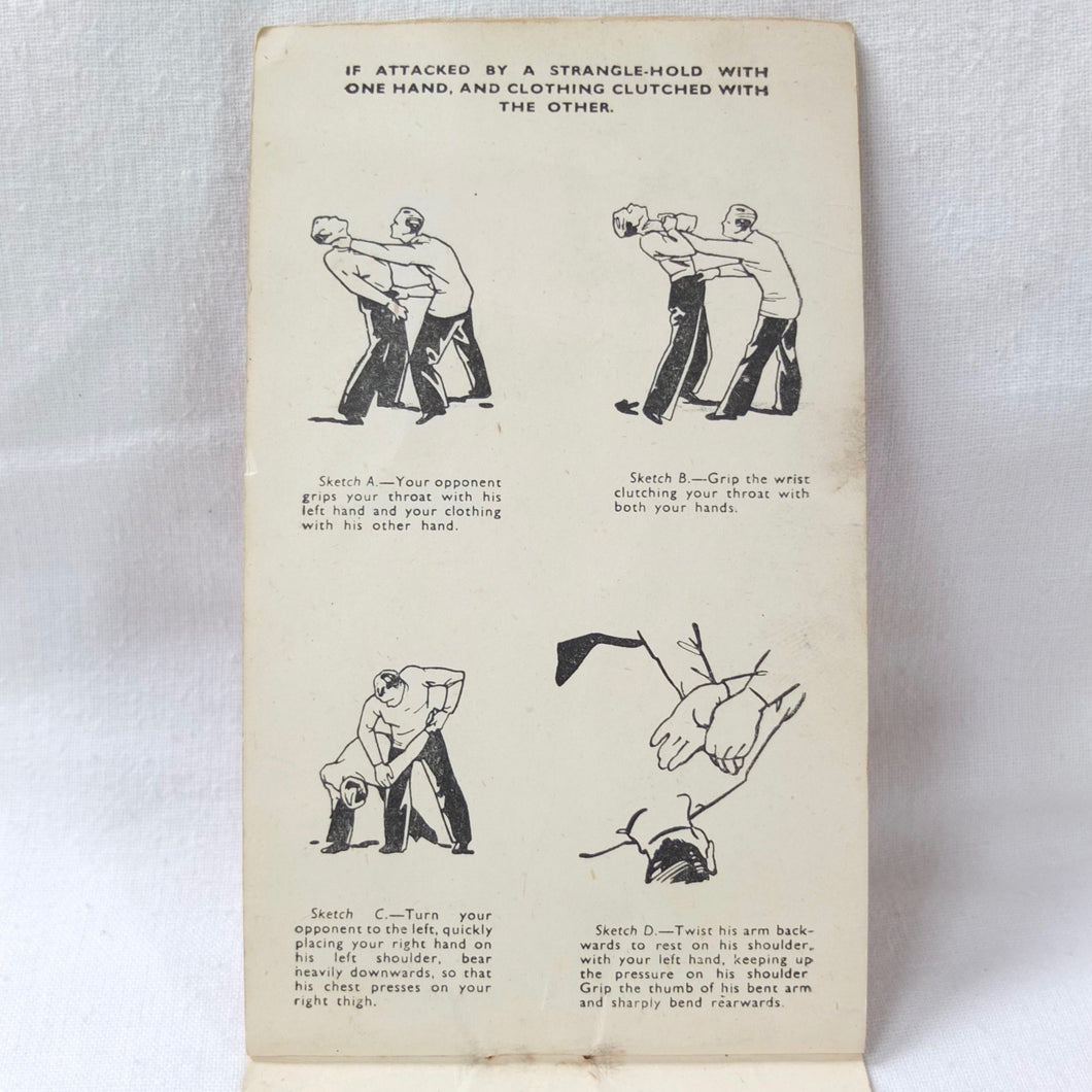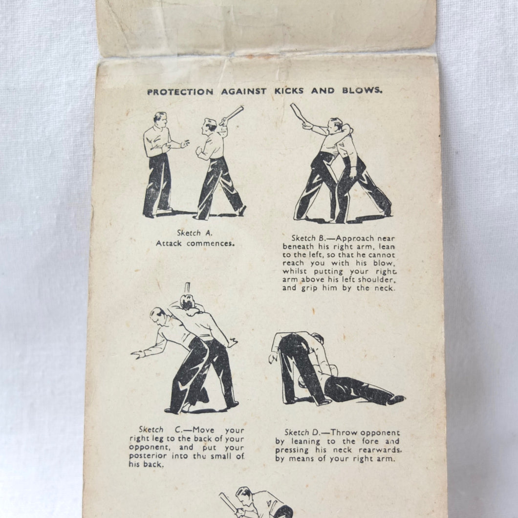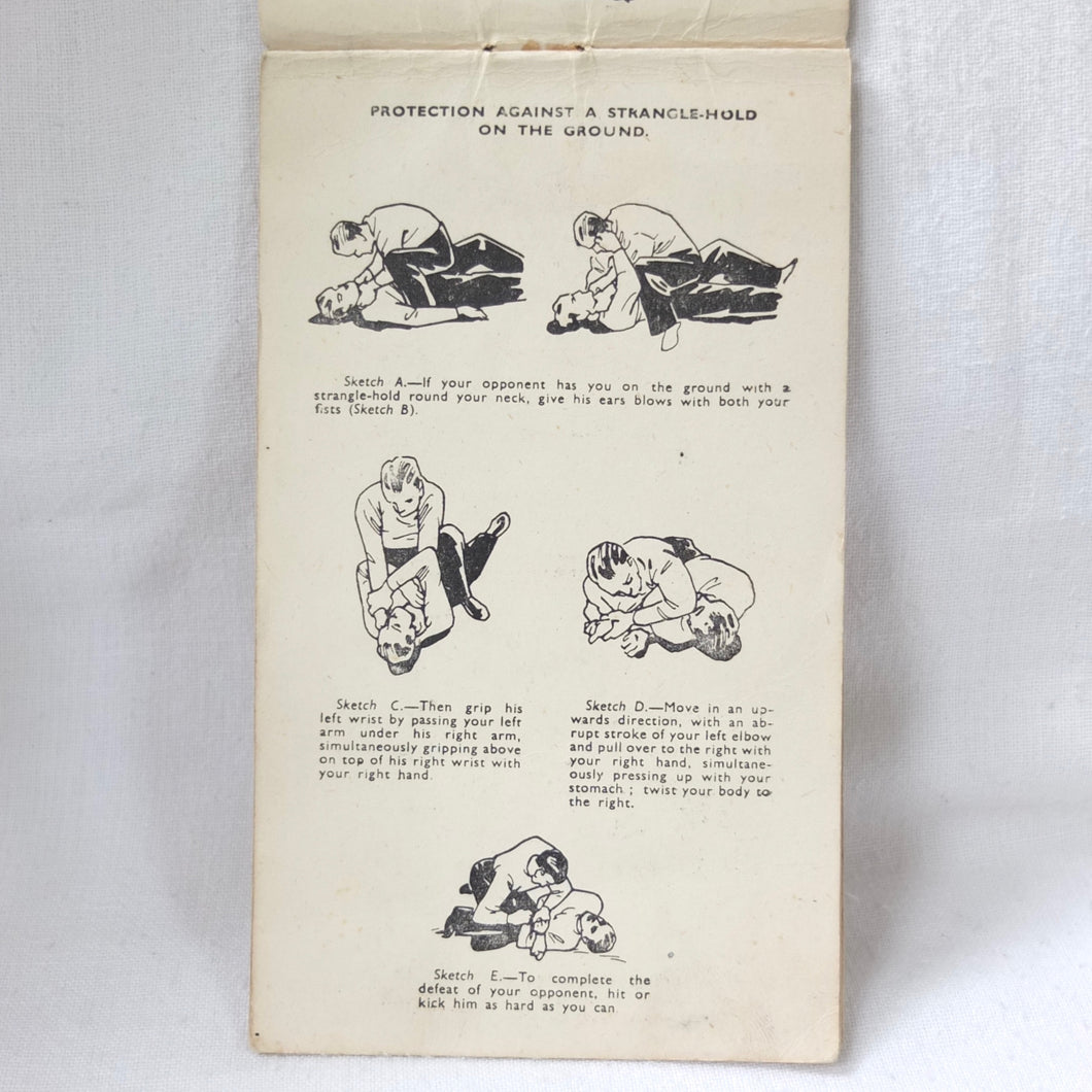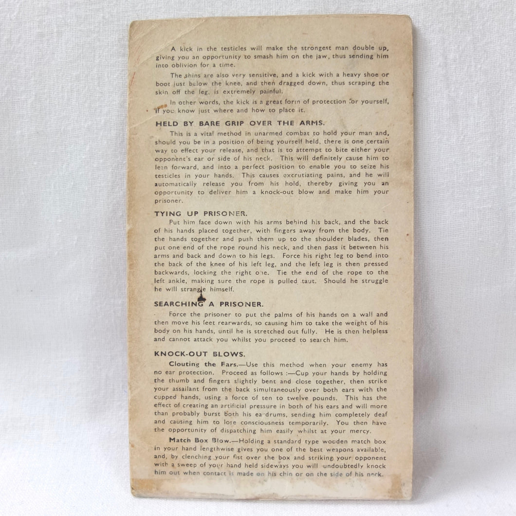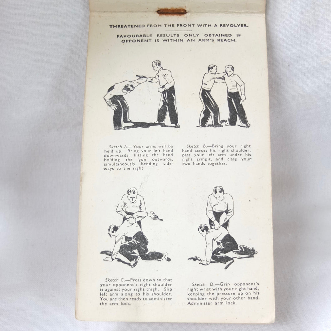 A rare original WW2 unarmed combat manual, published by Bernards of London c.1940. It includes details of a wide variety of blows, holds, kicks, throws, strikes, and other self defence techniques. With instructions on how to deal with assailants armed with knives or pistols, and how to overpower sentries. The booklet is well illustrated with numerous drawings of servicemen using the techniques. The booklet was intended to be used by both the regular army and the Home Guard.